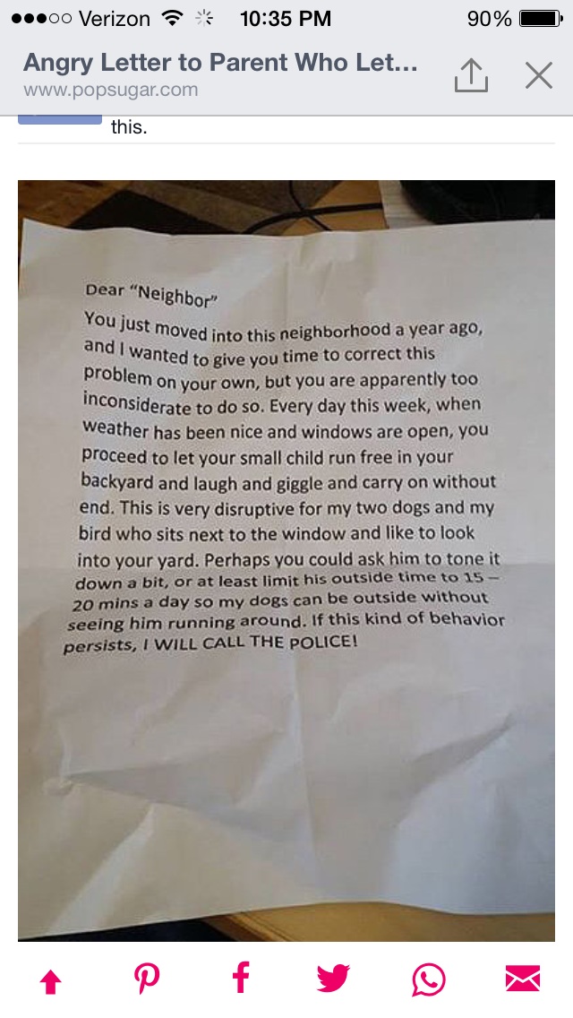 Wow. How dare the mom let the child run and laugh and play in the backyard of their own property. The nerve, sheesh :-?? (Again, a need for sarcastic font)