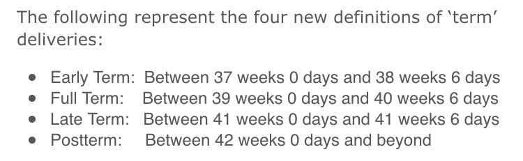 For clarification, here is a link to how term is defined by the American Congress of Obstetricians & Gynecologists (ACOG) and I'm including a screen shot of the most important info: