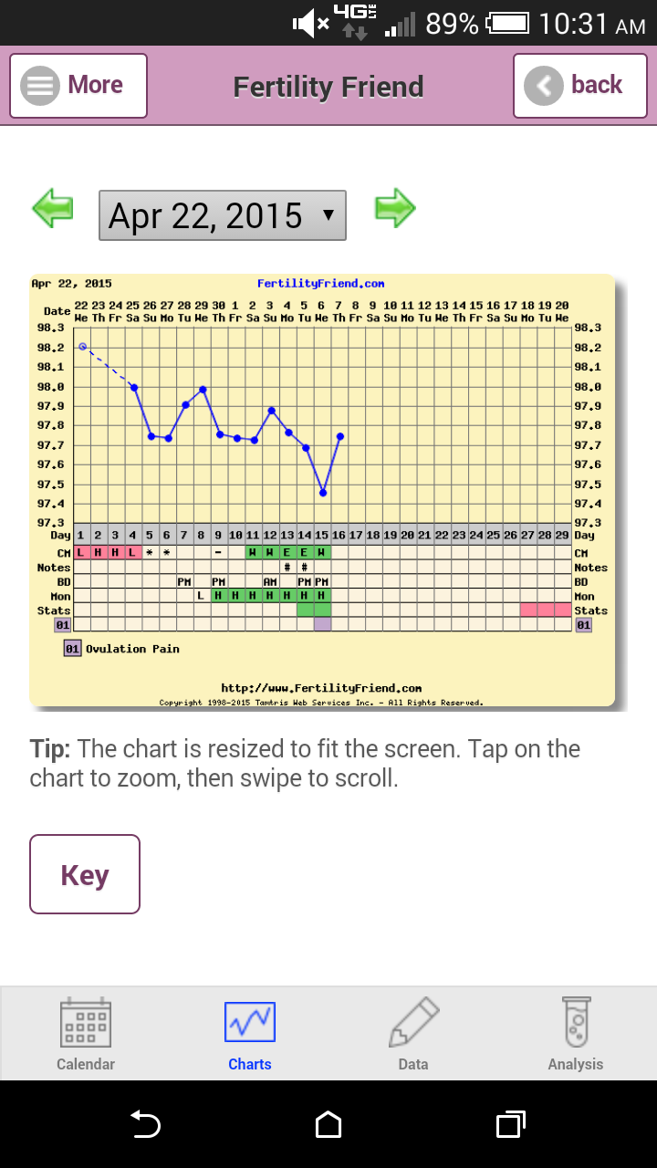 Rants/Raves/Chart Stalks: I think I have, for the first time since I started charting, actually saw WATERY CM today! Aaaand to make me even more excited - I got a blinking smiley face on my OPK so I'm all sorts of pumped about that. I have wondfos, so I'll probably pee on one or two of those today as well. Question about the wondfos though - if I don't get a positive (meaning a line as dark as the test line) then it's considered negative and I should mark it as such in my chart right? I've been using the CB advanced digi so I'm used to putting in low, high, or peak for those.