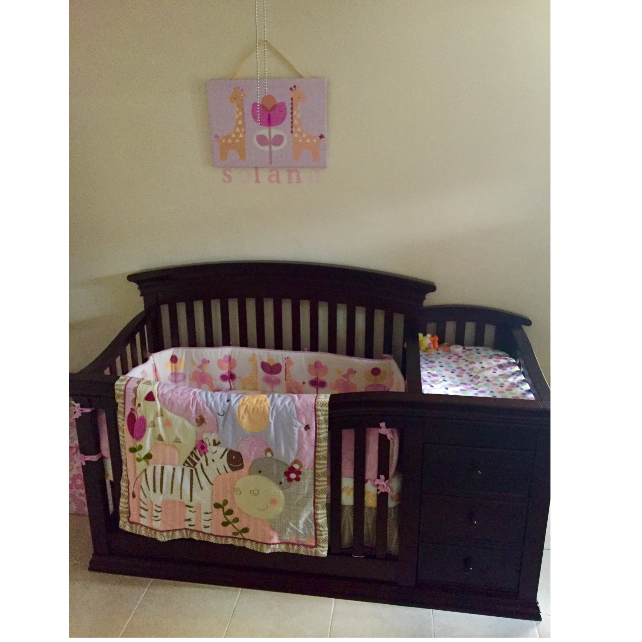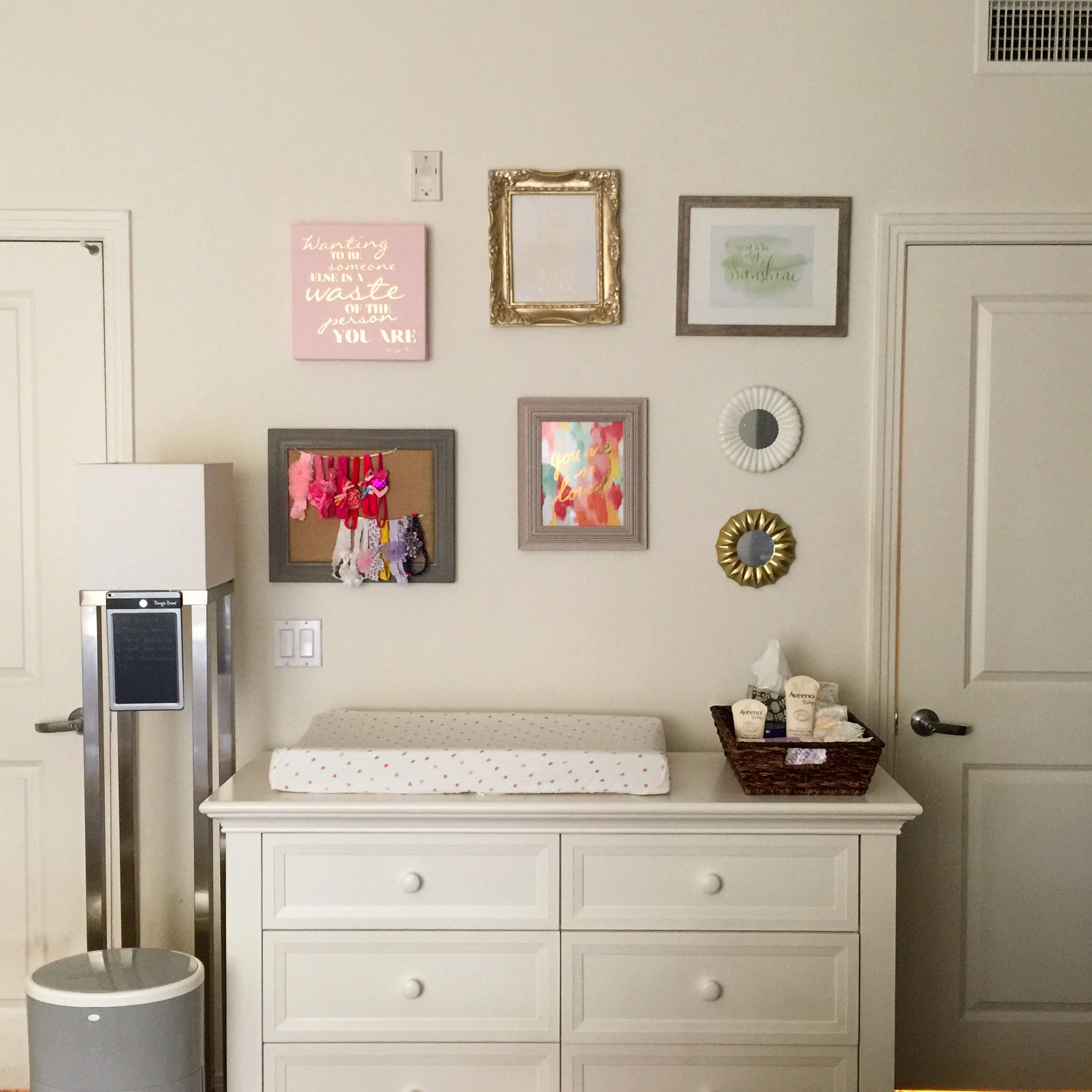 We have her crib to one side and a changing pad on top of my husbands dresser. My husband and I consolidated some of our clothes and gave her 4 of our drawers to use until we move and she has her own room.
