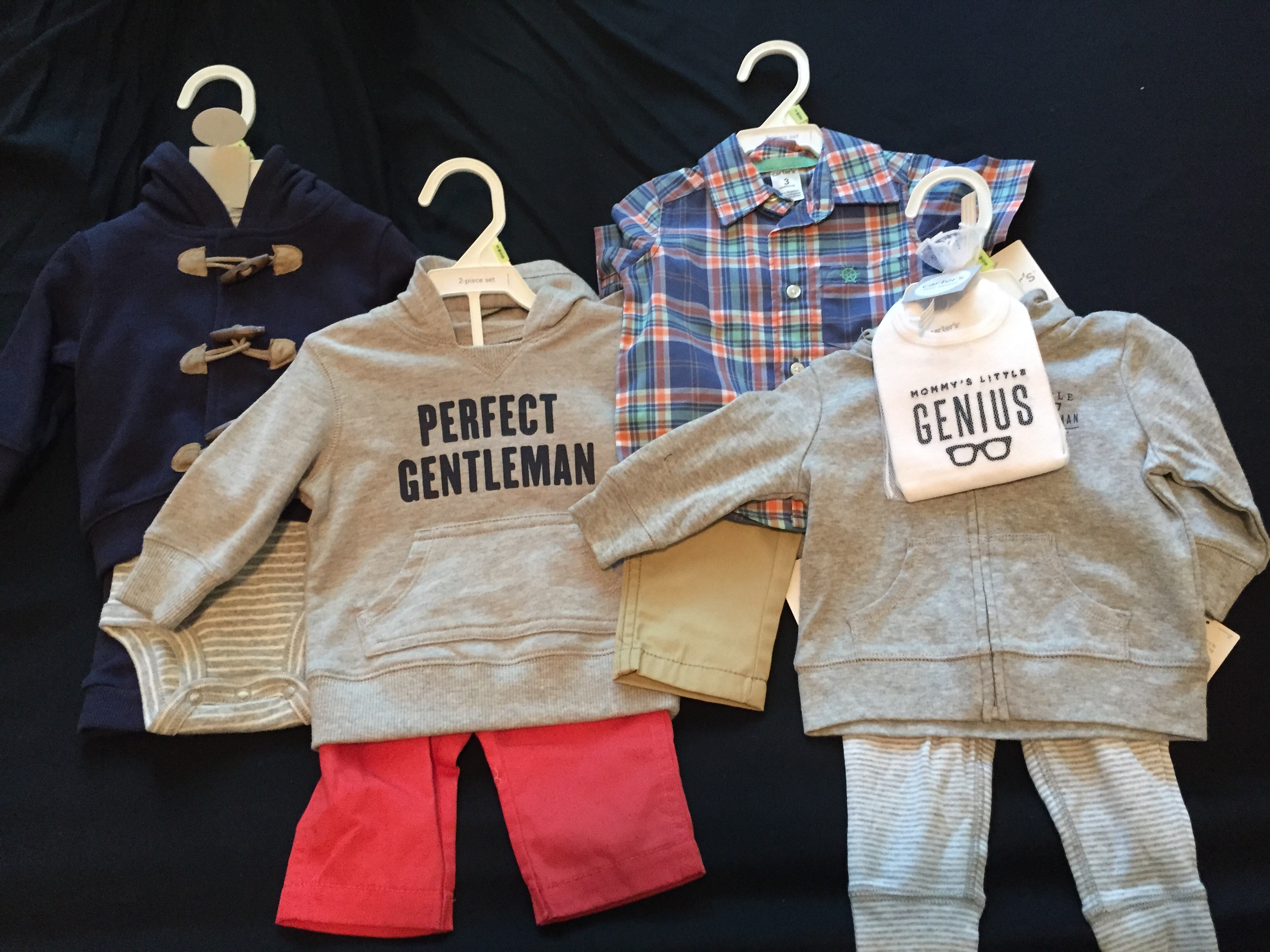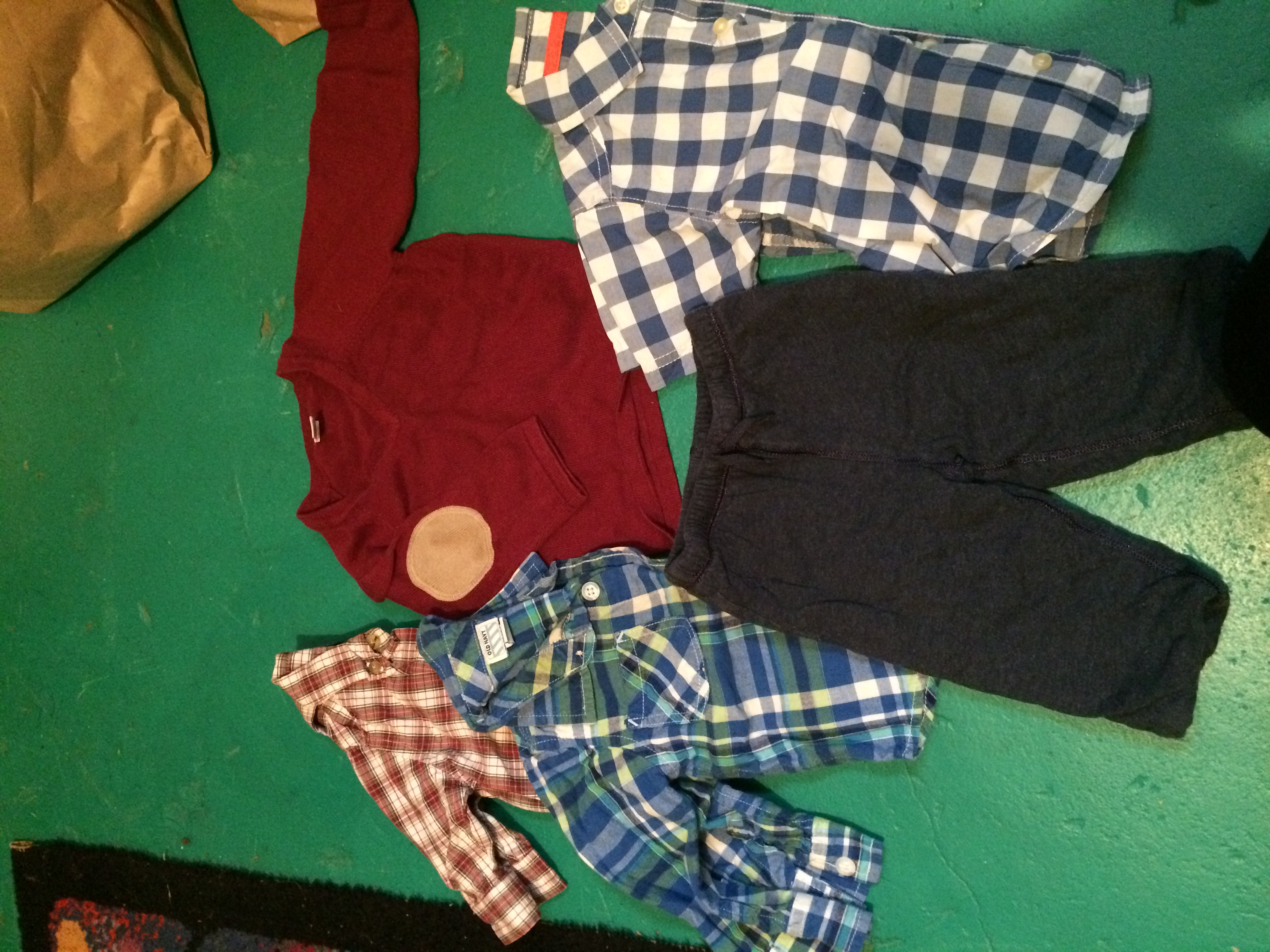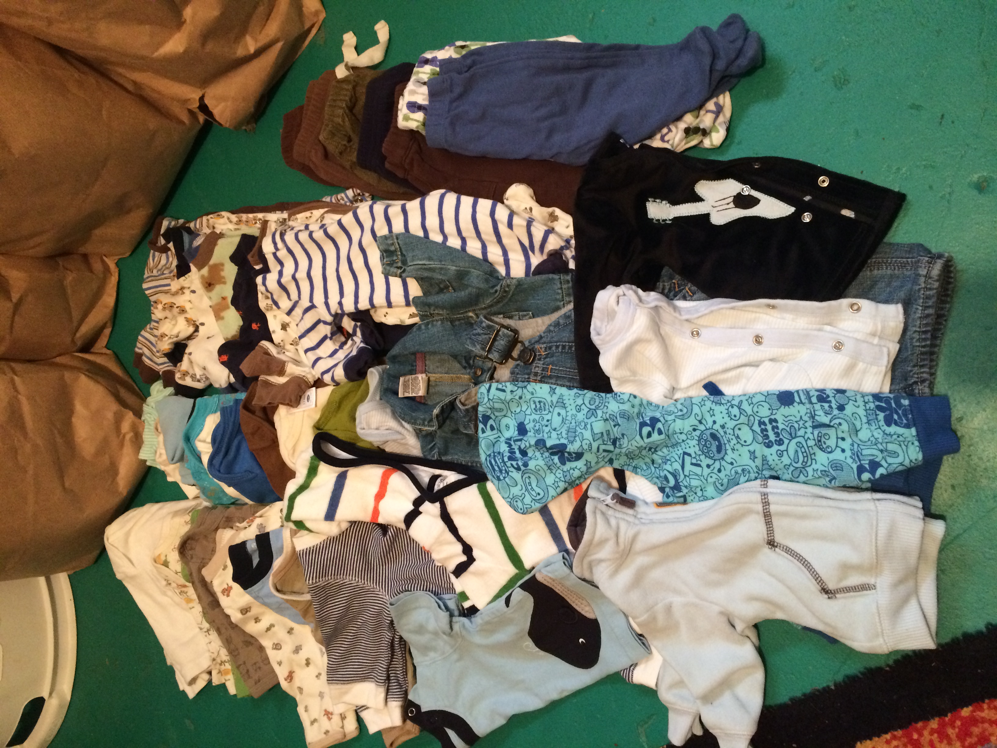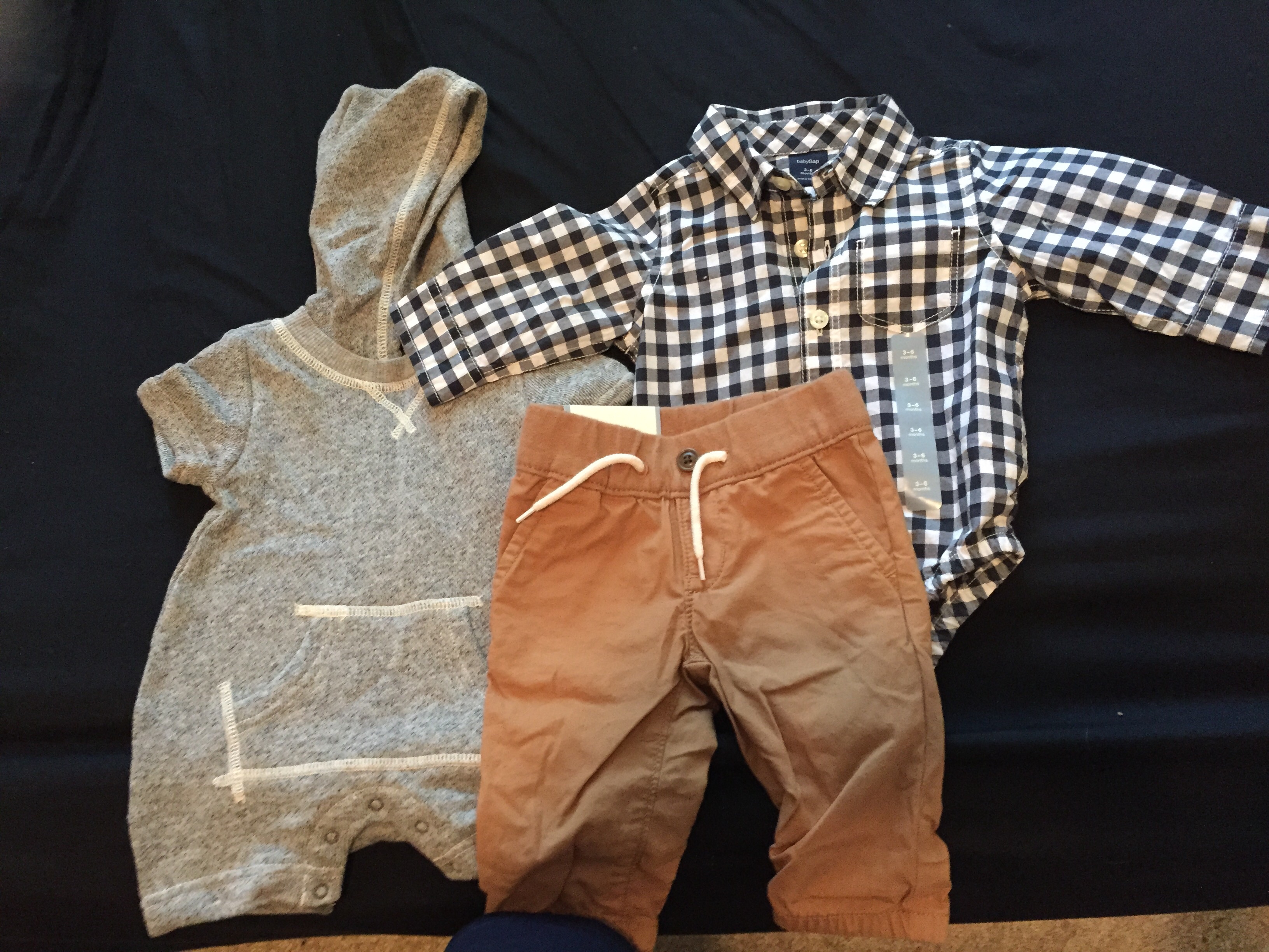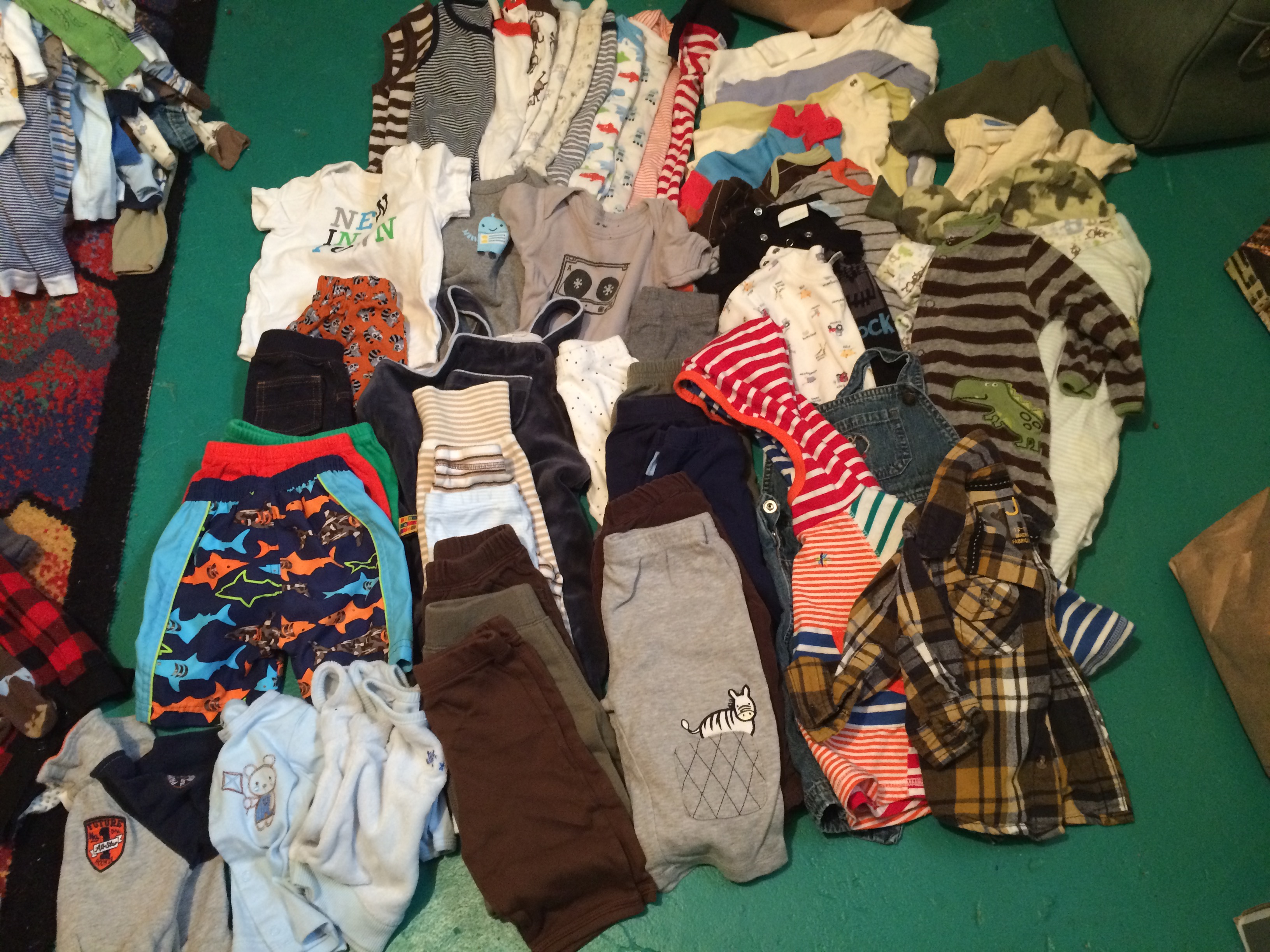 There's a pic of some shirts, a pair of pants, and a sweater that I bought used before I got the big lot of craigslist stuff. The little patches on the sweater of the elbow killllllllll meeeeeeeee. The football onesie was bought before we even knew the gender. The smiley onesies came from a Birchbox limited edition box they did with Baby Gap.
