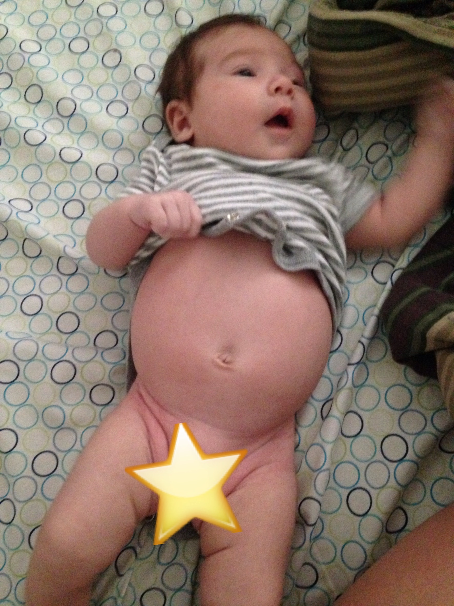 so ever since my baby was born she's had a really round stomach. Not round like beer belly but round wide wise and it gets skinny around her hips. I've inserted a picture so it makes more sense. I'm just wondering if she's okay? It's really firm always and when I rub on it she almost acts as if it's uncomfortable. Haven't seen the doctor since she was 2 weeks old (she's 5 weeks now) and the doctor commented on it but all she said was stating the obvious that she's really round. Nothing else. So I'm just wondering if she looks or if this is normal. Btw the picture I posted she's sort of sucking in. Normally the roundness is worse.