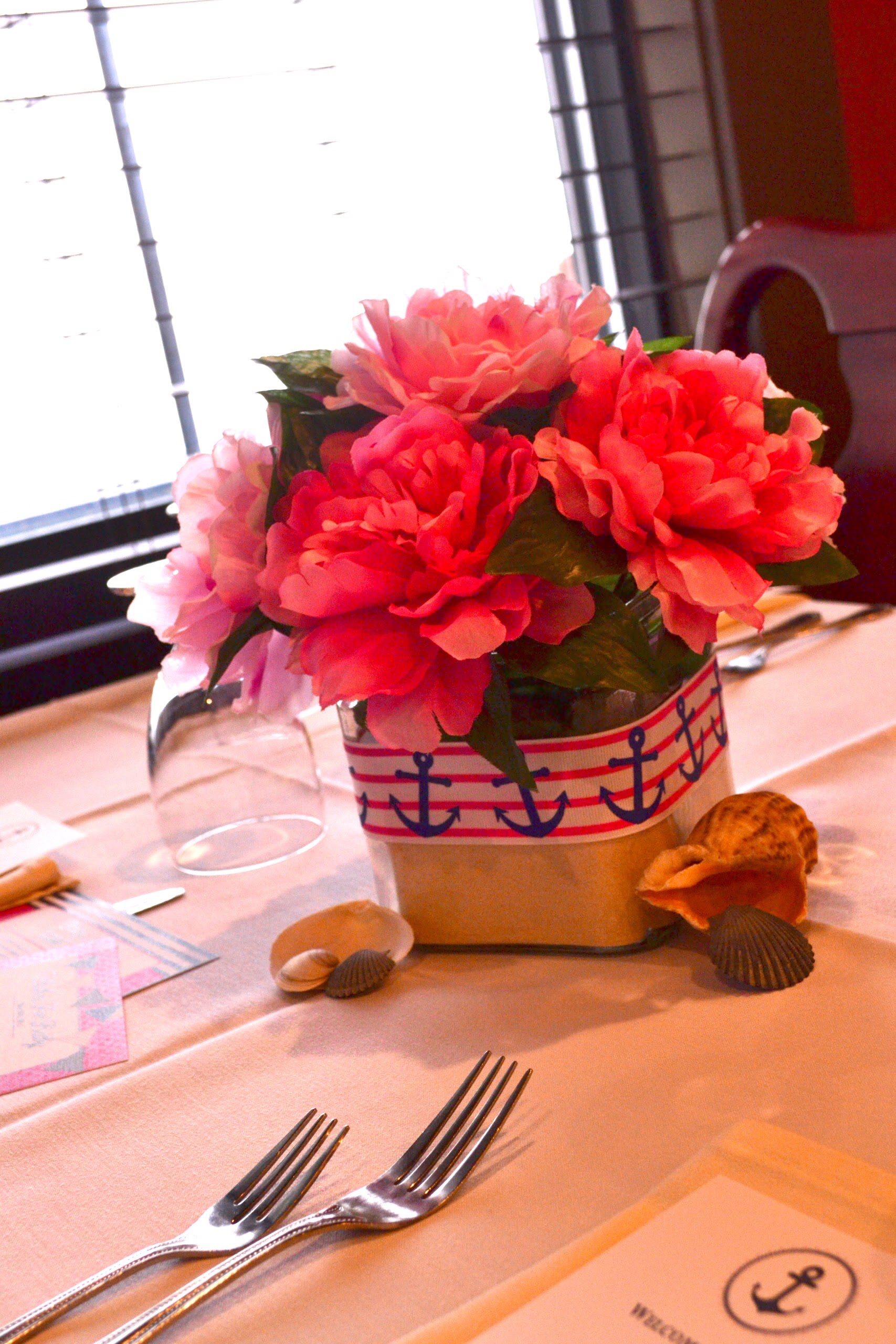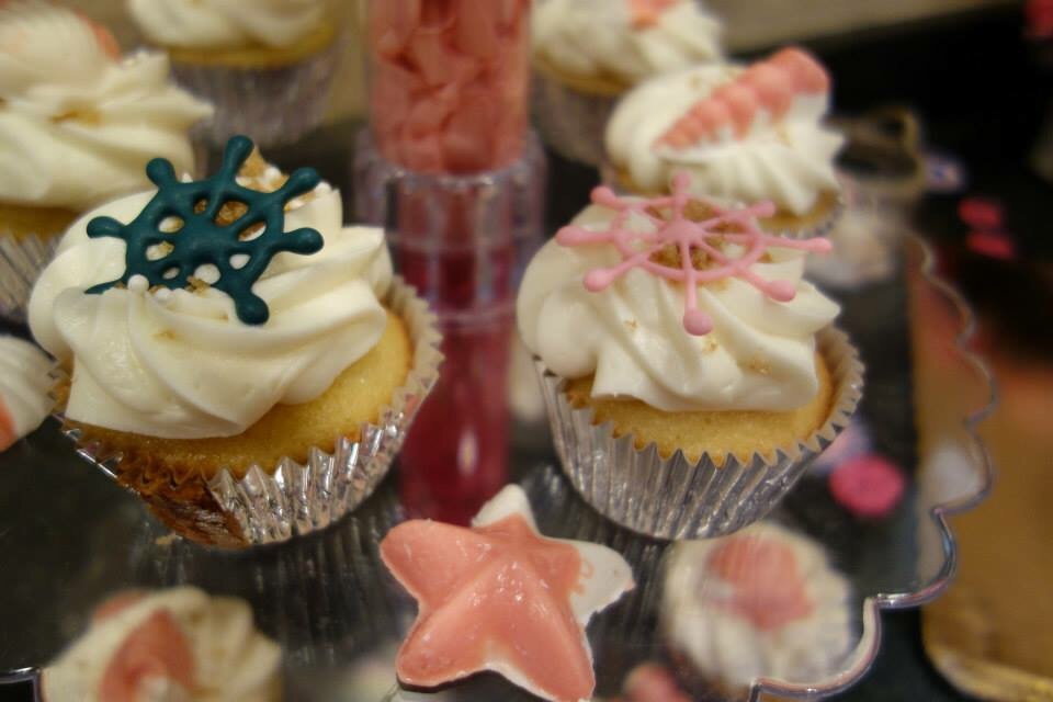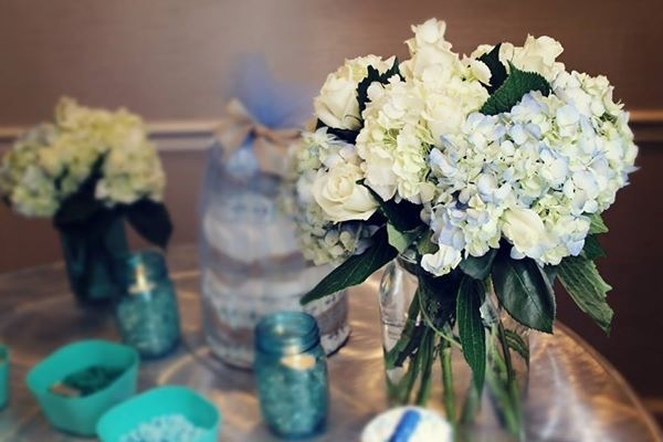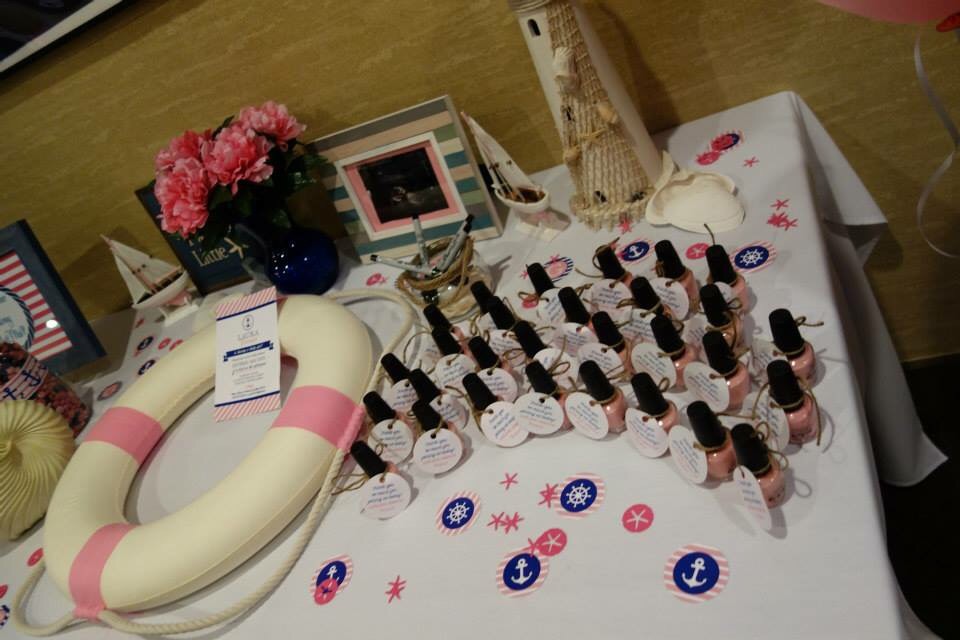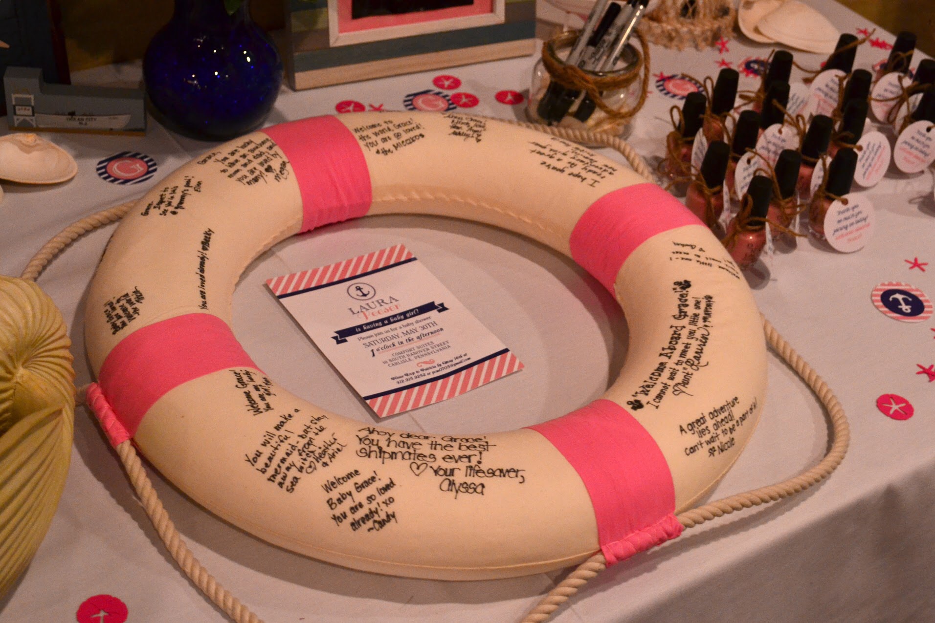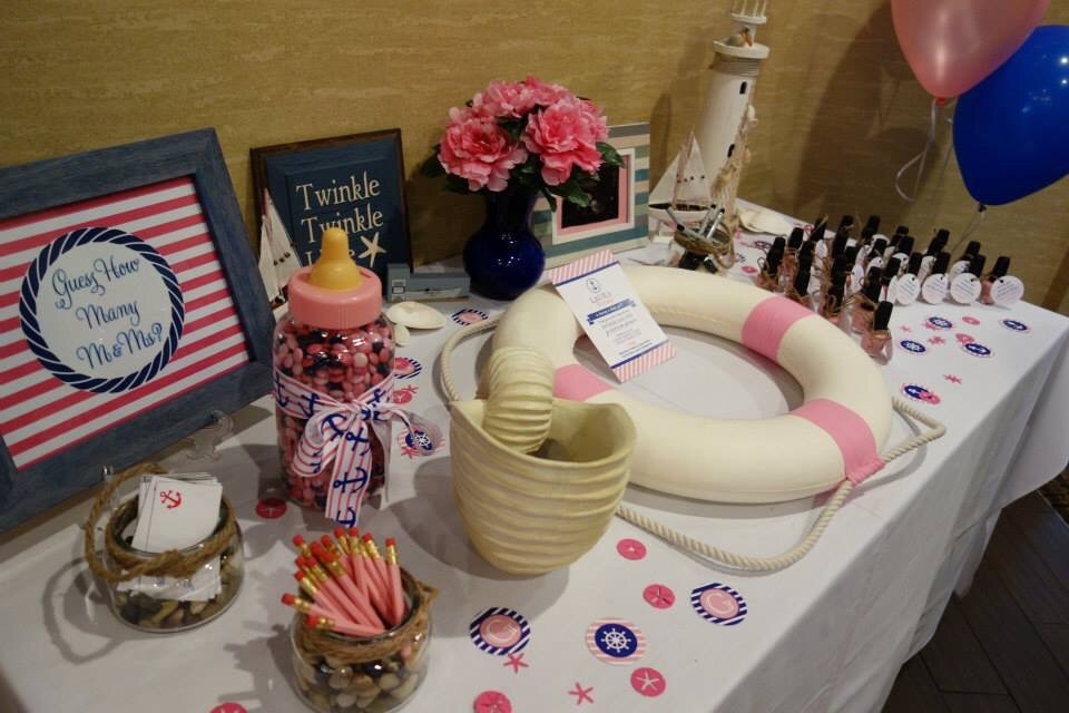 The theme was "Welcome Aboard Grace!" And we had a lifering as a guestbook that will go on her nursery wall. The favors were OPI's "It's A Girl" nail polish. My MIL made the centerpieces and my best friend made the beach/nautical cupcakes (I just want a vat of the icing). My husband showed up at the end and surprised me with flowers because he is adorable.