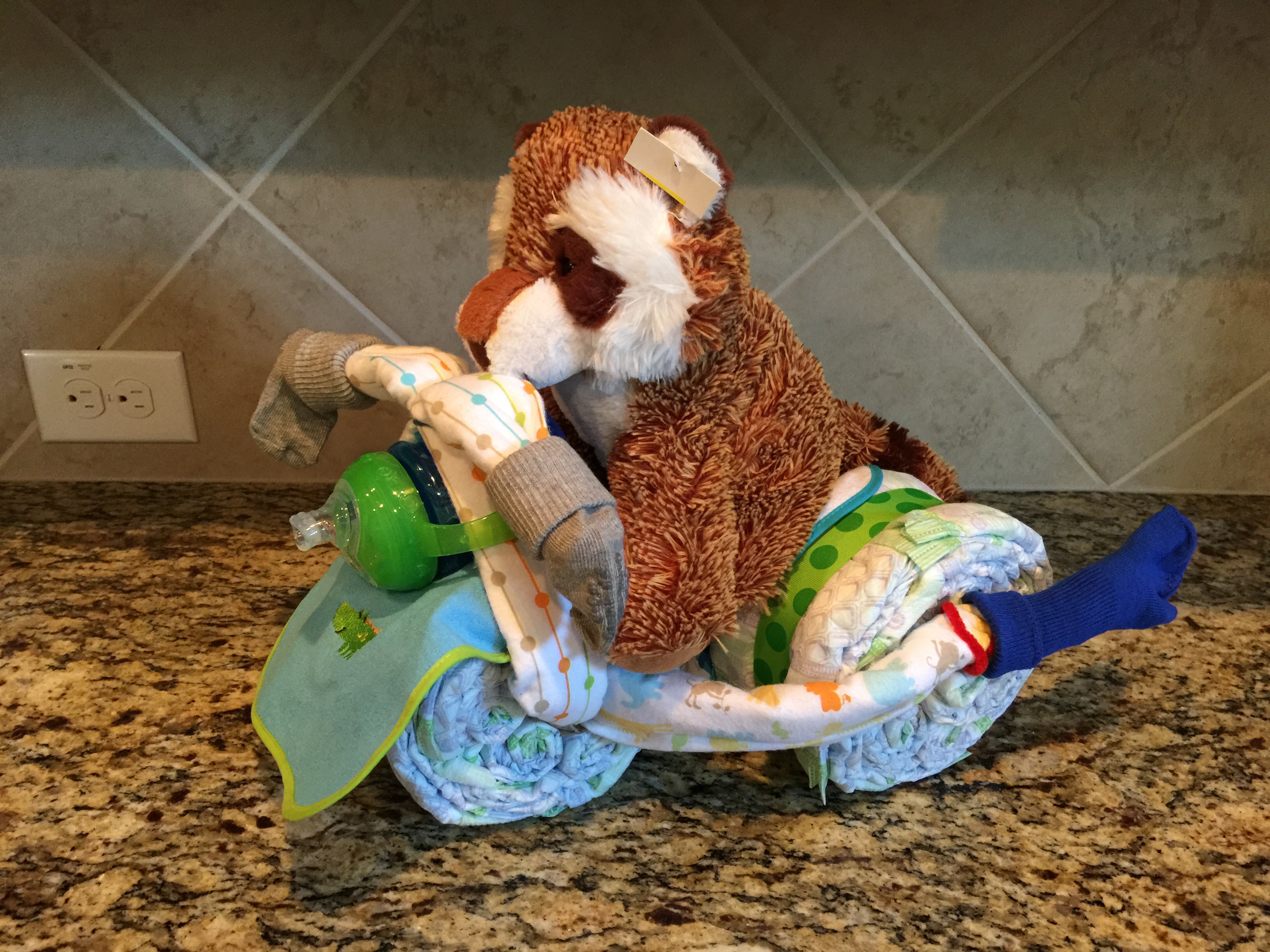 Had my work shower today and am having my friend/family shower Saturday! Today I got a wonderful painting done by the art teacher at my school, which I LOVE! Also thought the diaper tricycle one of the first grade teachers made was too cute.