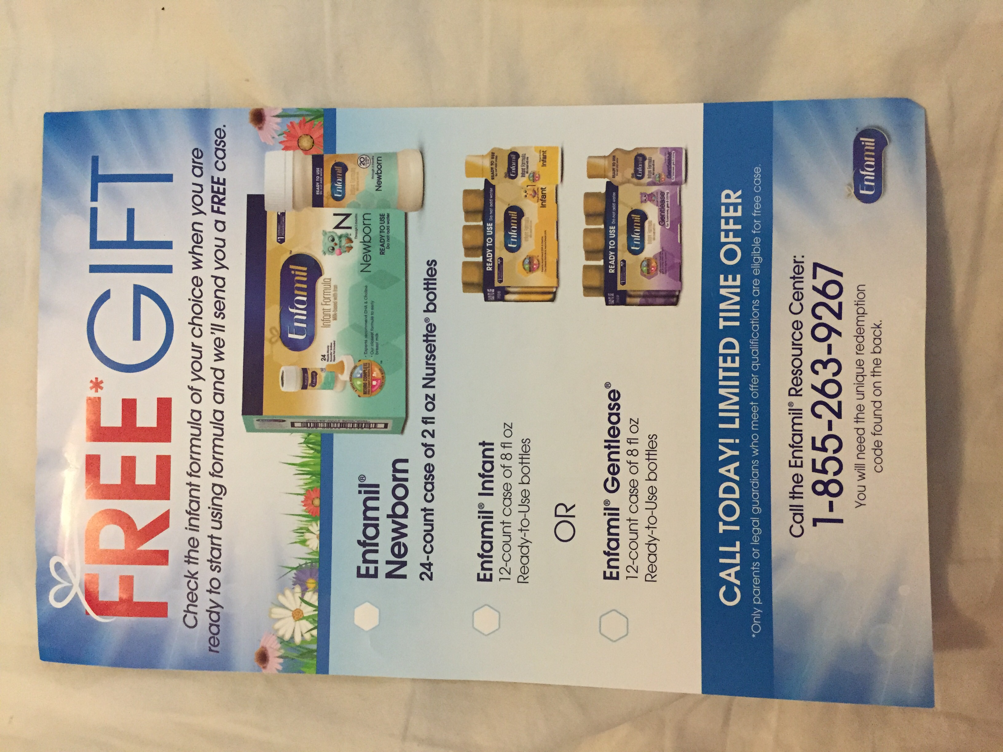 I went to a pregnancy/baby expo and enfamil was handing out flyers with a code for a free case of formula. I don't know where else you would get the code, maybe your Drs office? The number to call is 1-855-263-9267, but like I said you need a code.