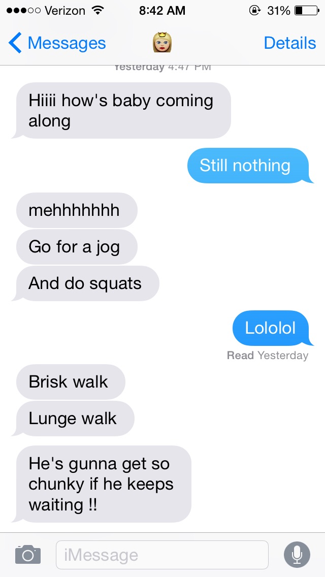 Eta: forgot to say I am going to freak out on the next friend who texts me asking is the baby here yet then giving me genius suggestions to get him to come, when NONE OF THEM HAVE KIDS OR KNOW WHAT THE HELL THEY ARE TALKING ABOUT.