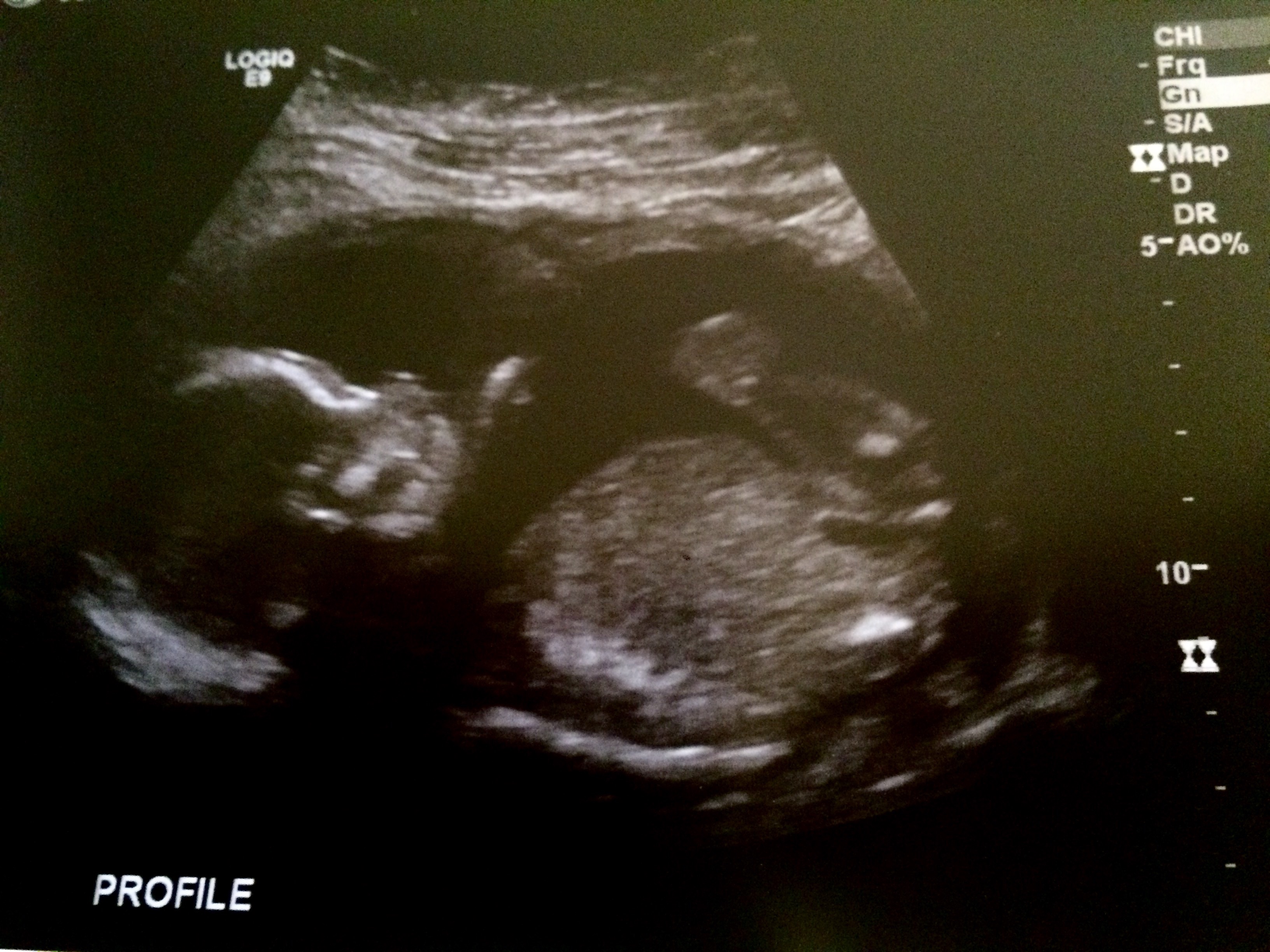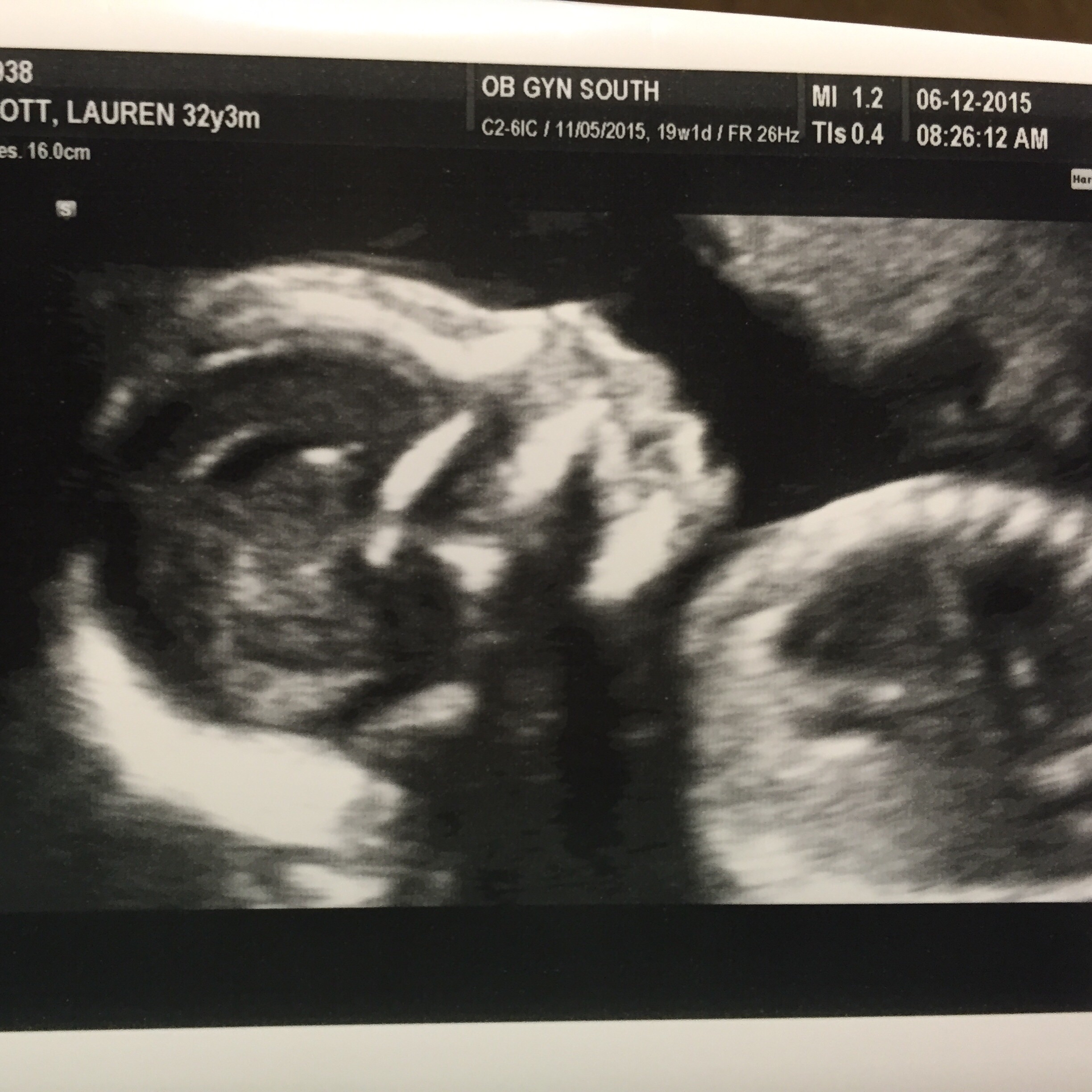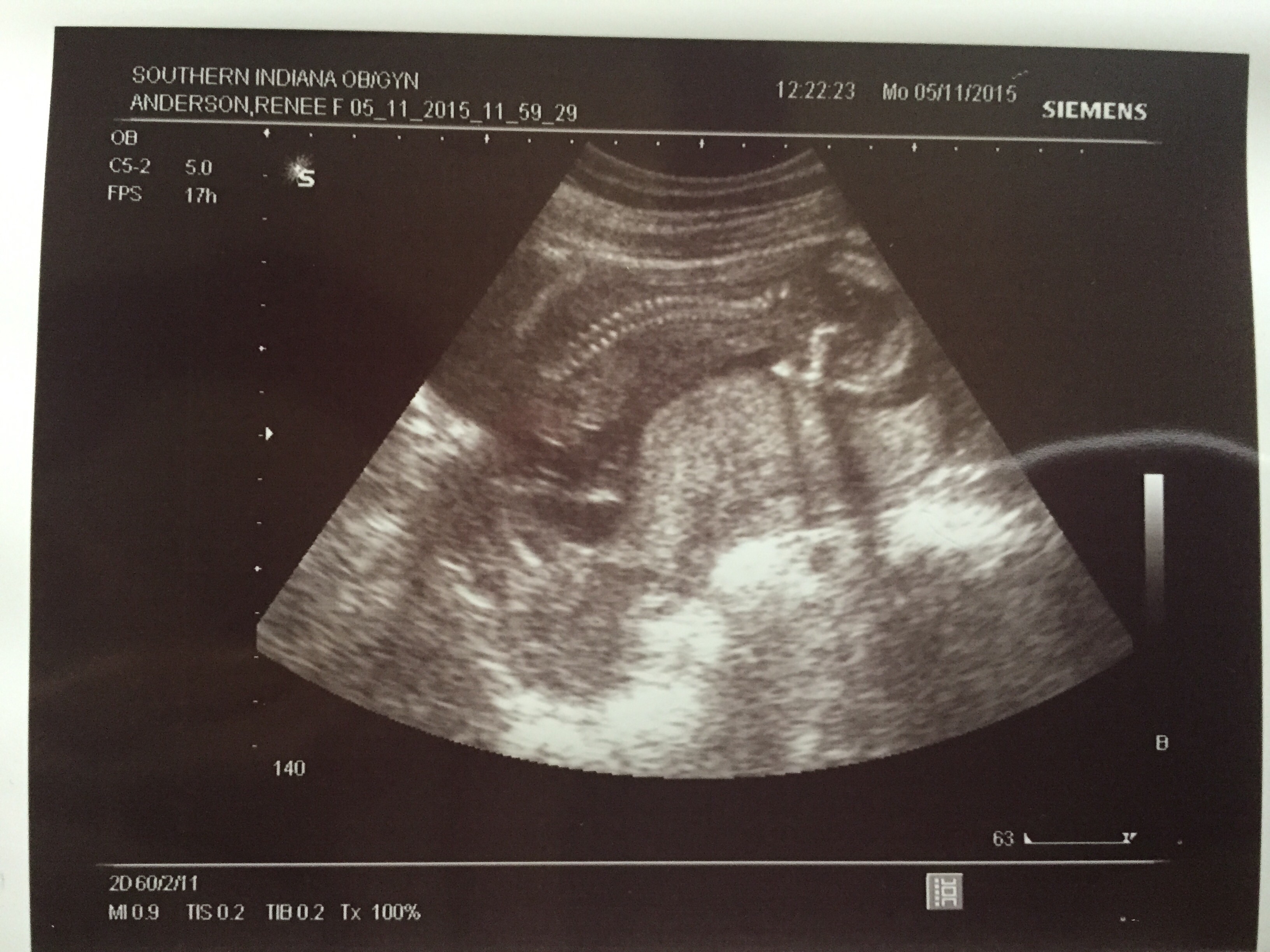 18 weeks 4 days. Baby boy, Kiernan, looks great. We could even see all 4 chambers of his heart. He is chilling in there all curled up, like a sweet little one. My placenta is in top which explains why he is taking longer for me to feel his kicks than Avery's. Lol I thought I was maybe feeling him but wasn't sure. Now I know why I haven't felt much yet lol.