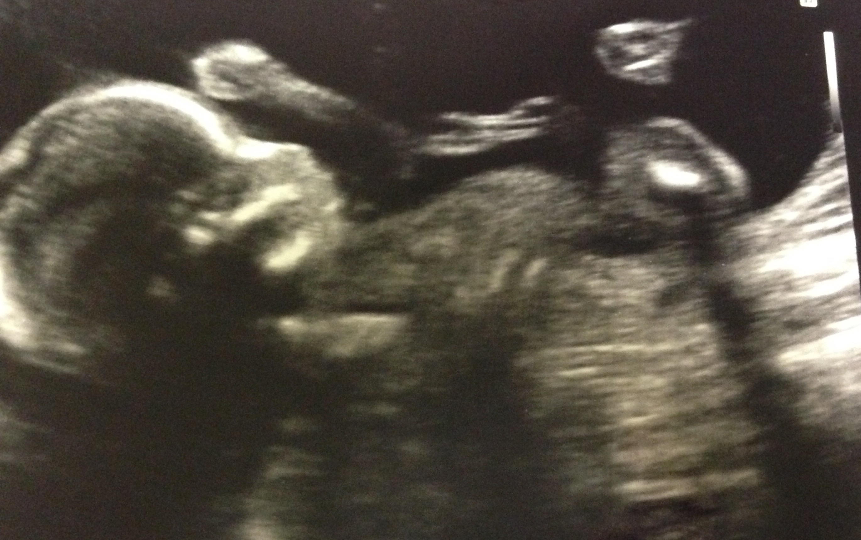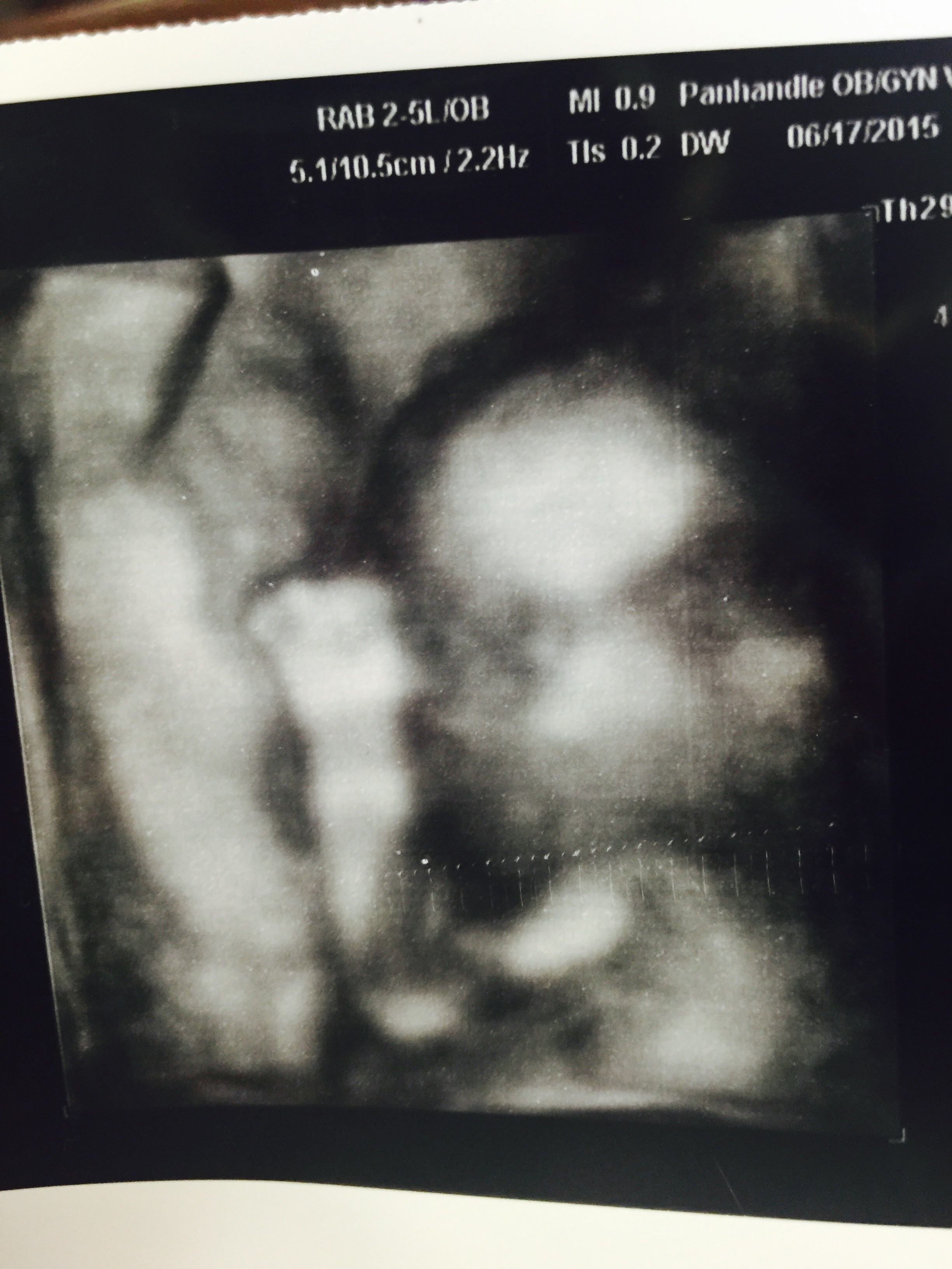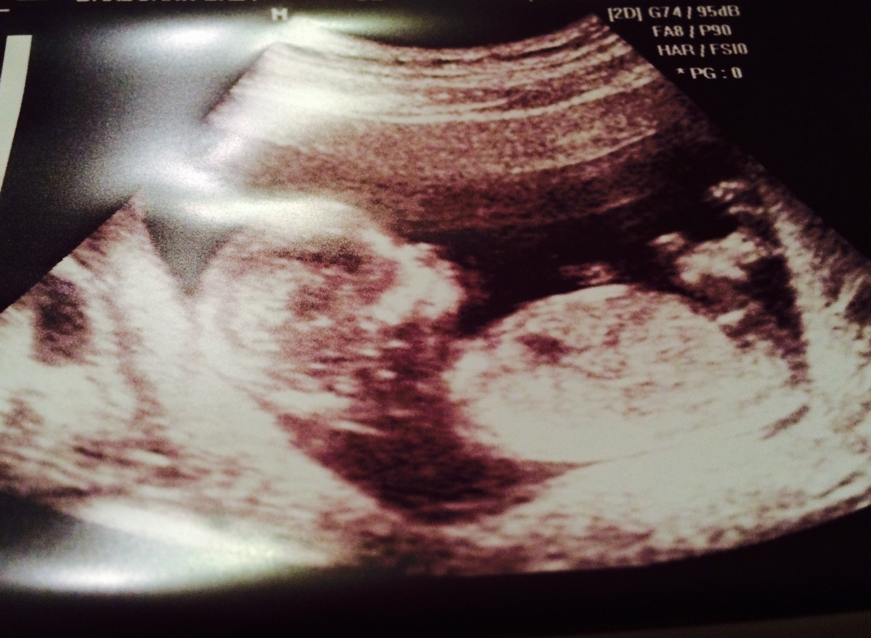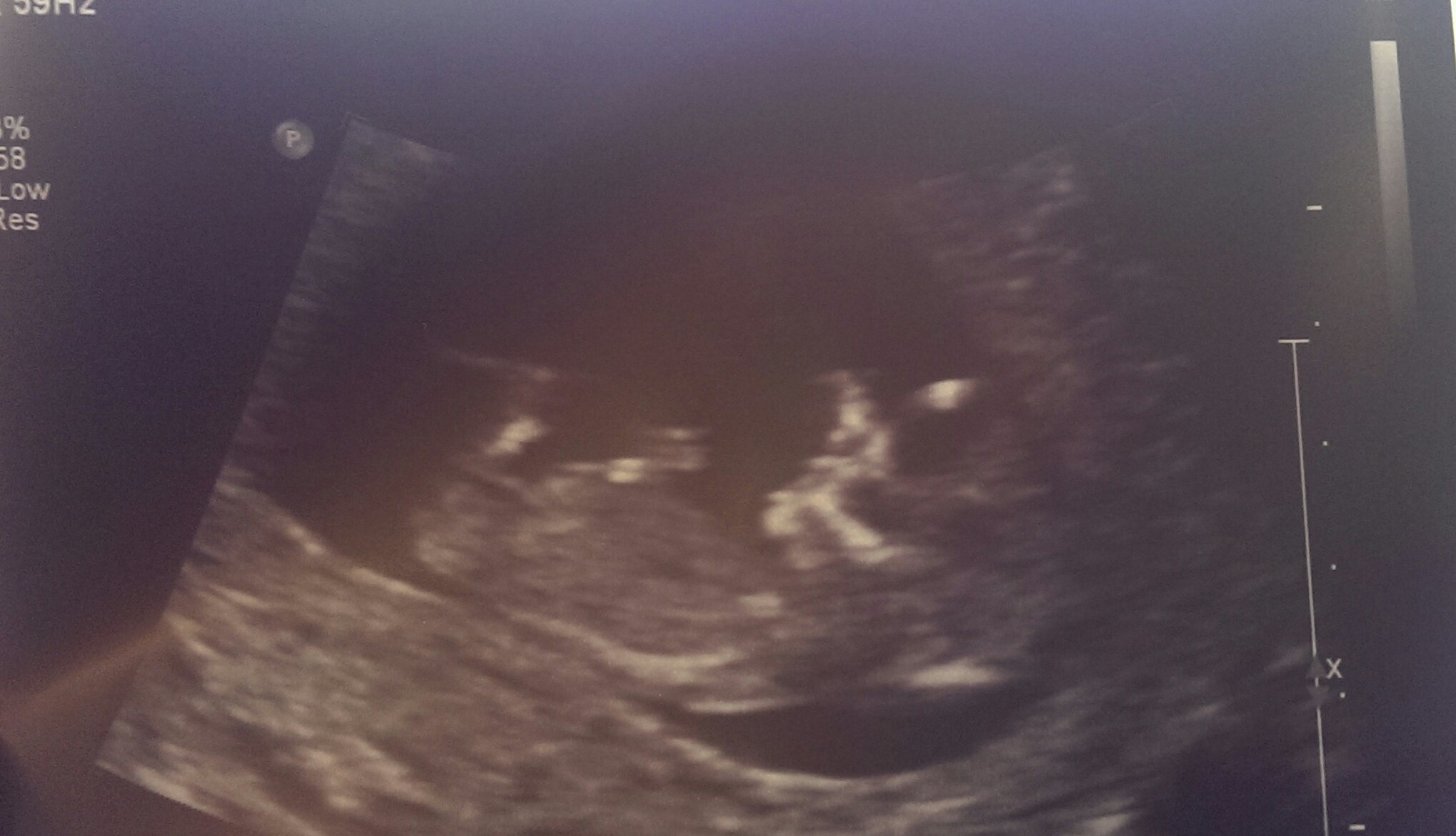 18 weeks 4 days. Baby boy, Kiernan, looks great. We could even see all 4 chambers of his heart. He is chilling in there all curled up, like a sweet little one. My placenta is in top which explains why he is taking longer for me to feel his kicks than Avery's. Lol I thought I was maybe feeling him but wasn't sure. Now I know why I haven't felt much yet lol.
