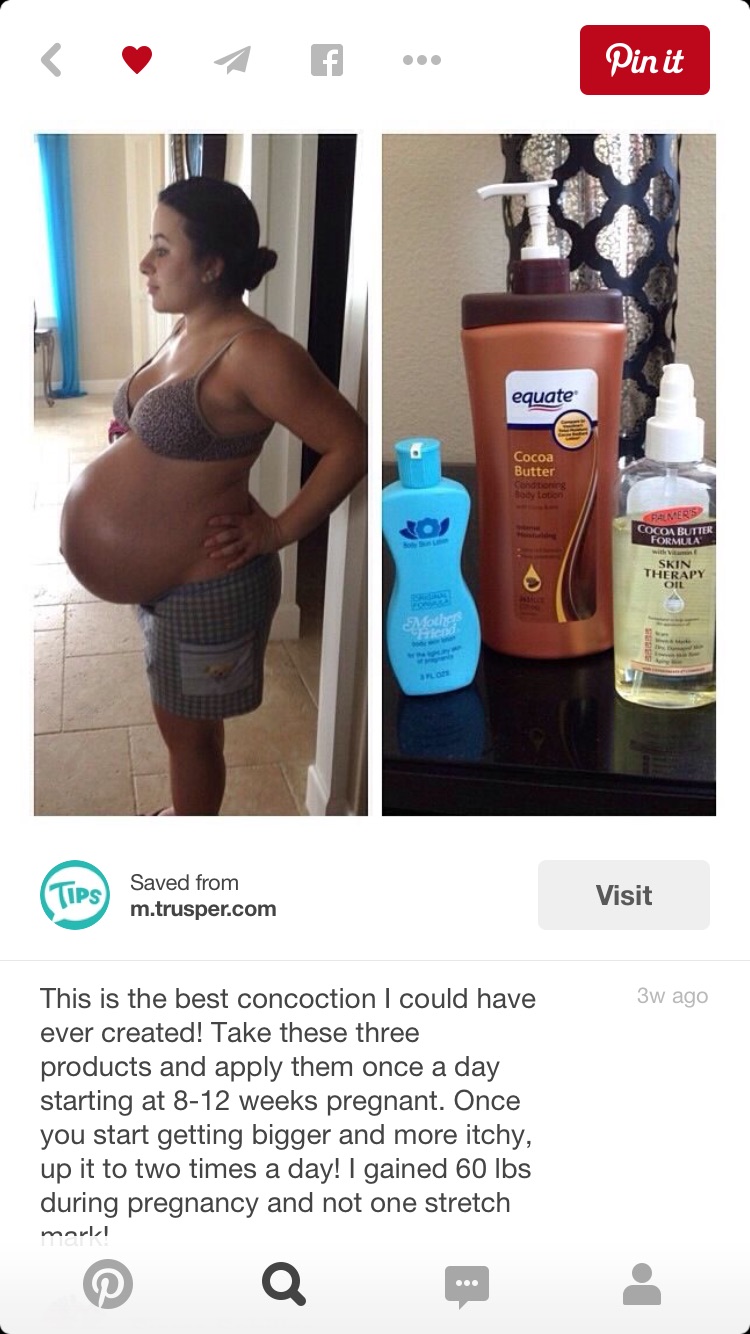 However, with my first pregnancy I used something called "Mother's Special Blend" (yellow bottle, available at Whole Foods) and didn't get any stretch marks. I applied it daily after taking a shower.