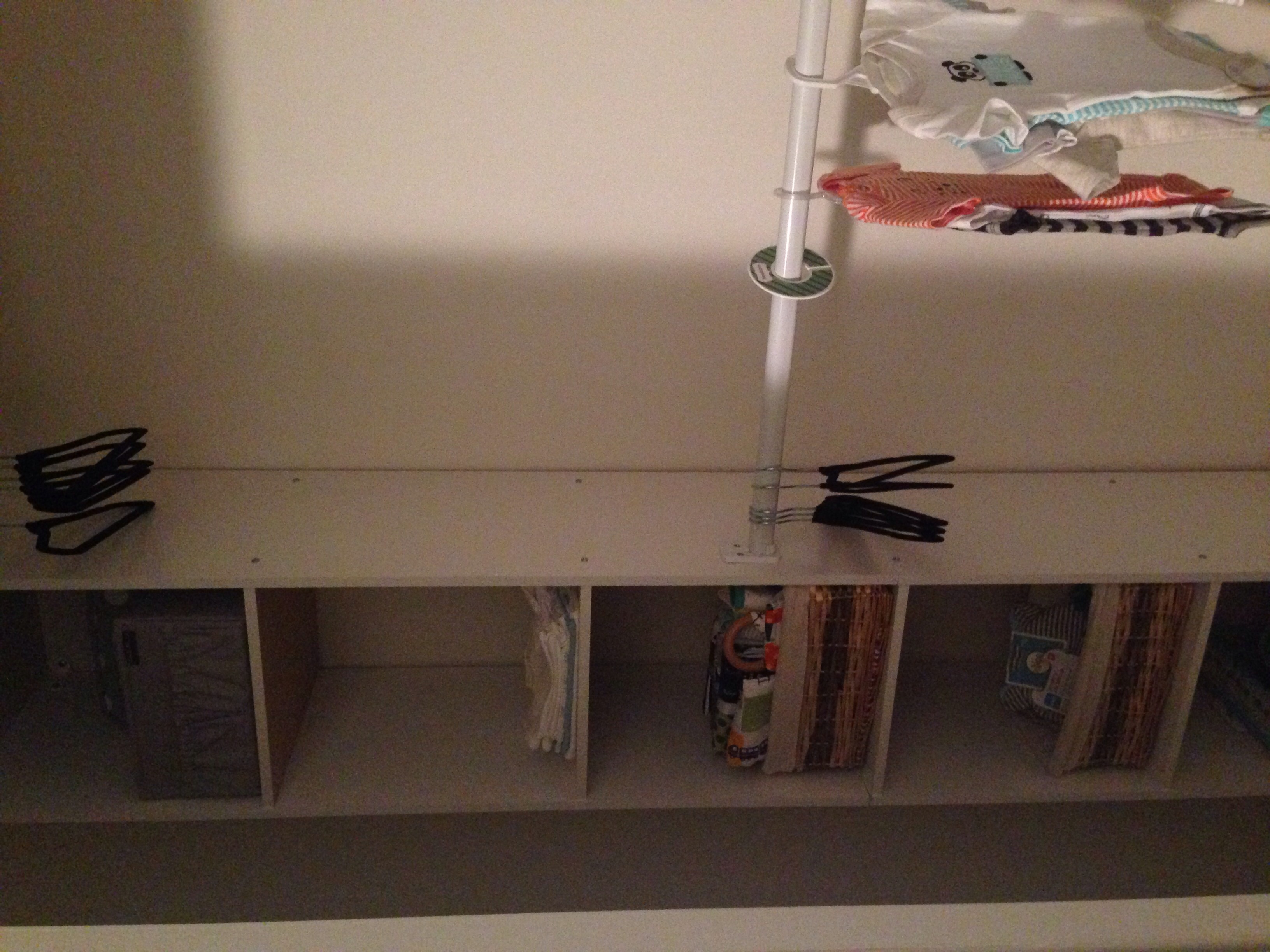 Other than the bedroom, we only have two small closets, a living room and a kitchen to work with, so I'm still working on the storage for the rest of the place. (strollers, bouncer, high chair, ect..) but at least I'm partway there!