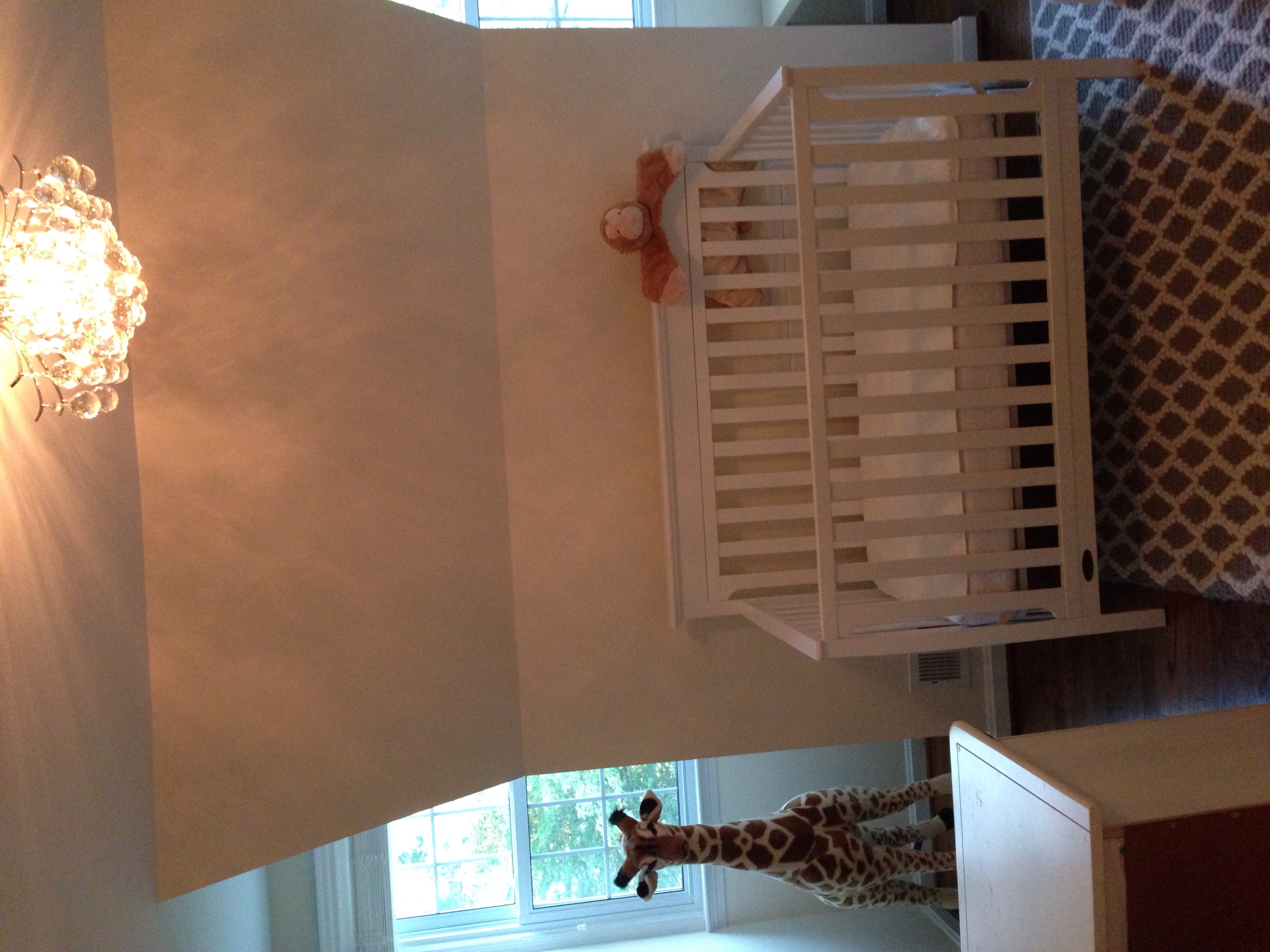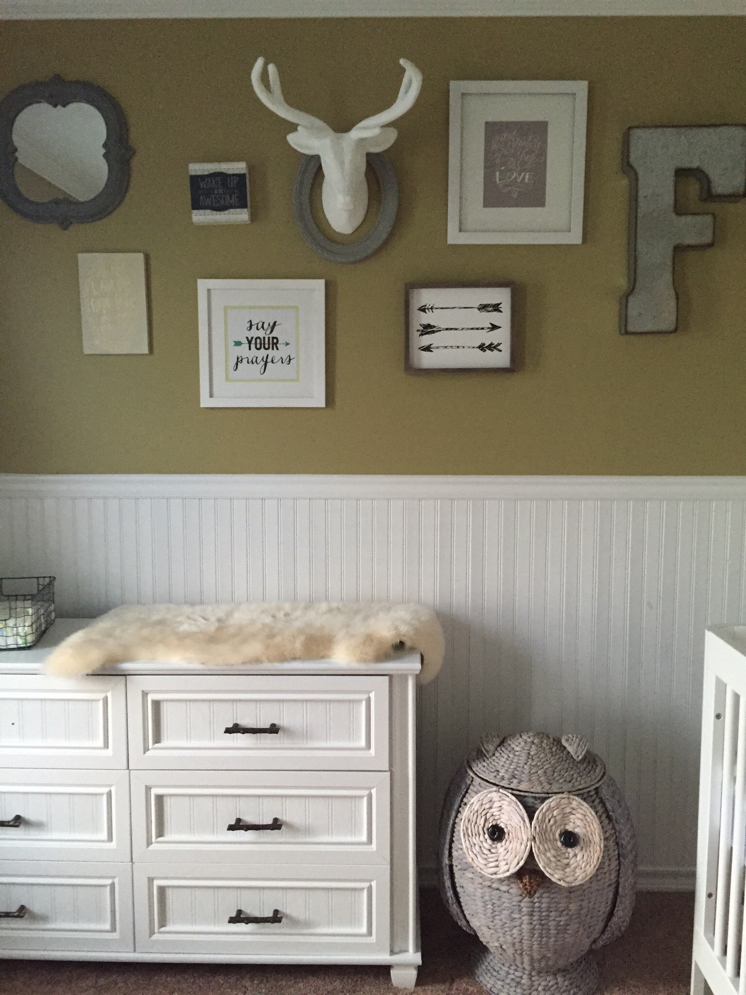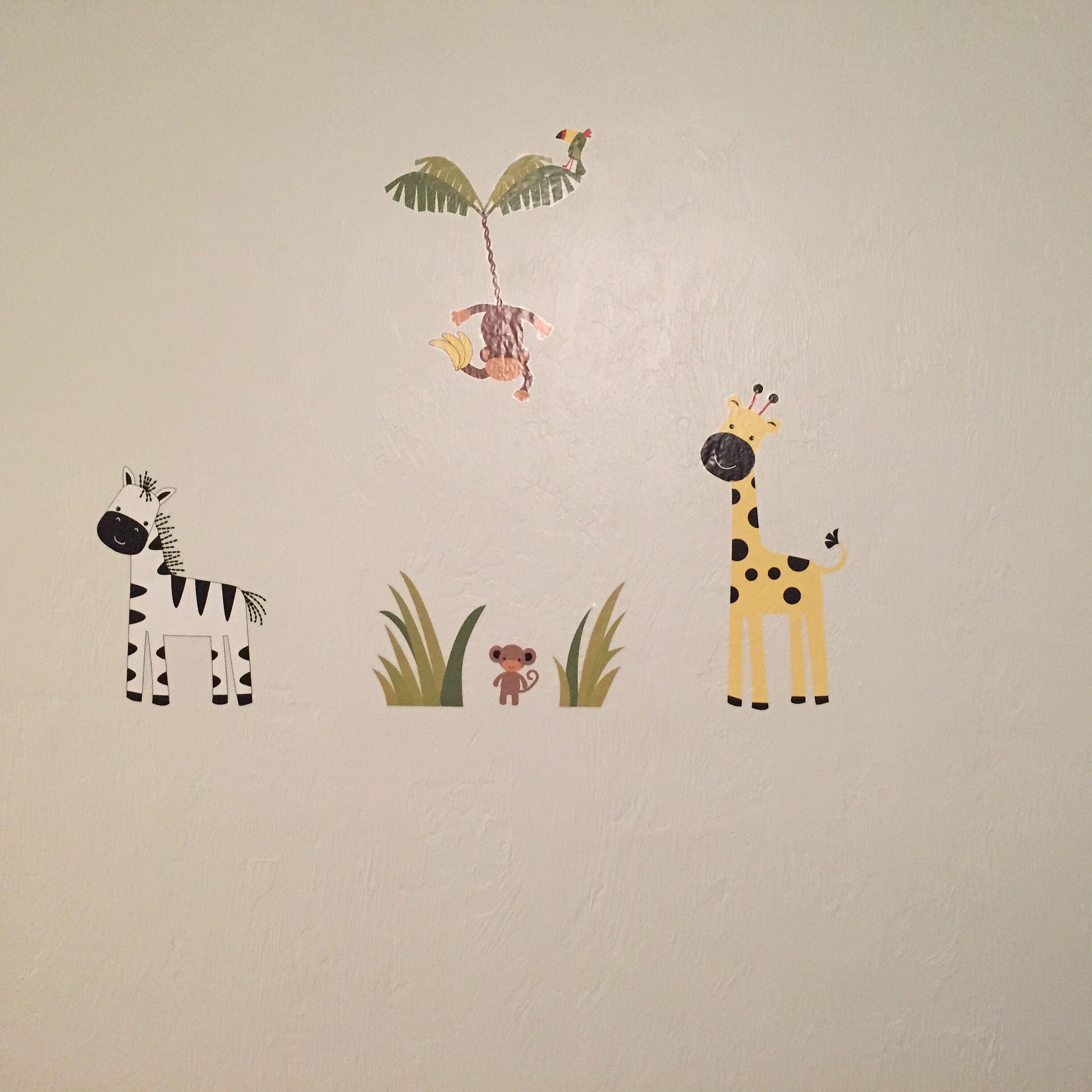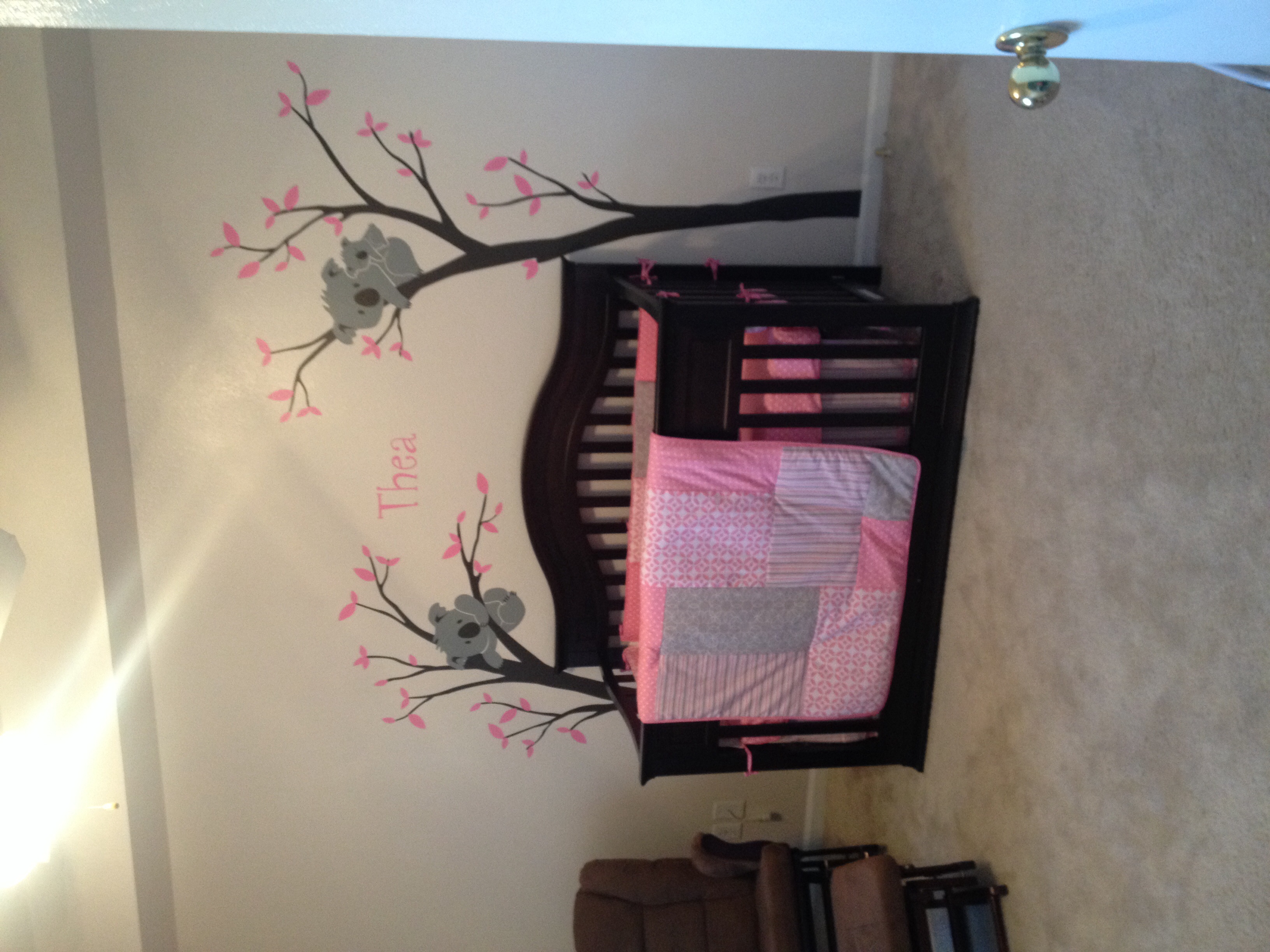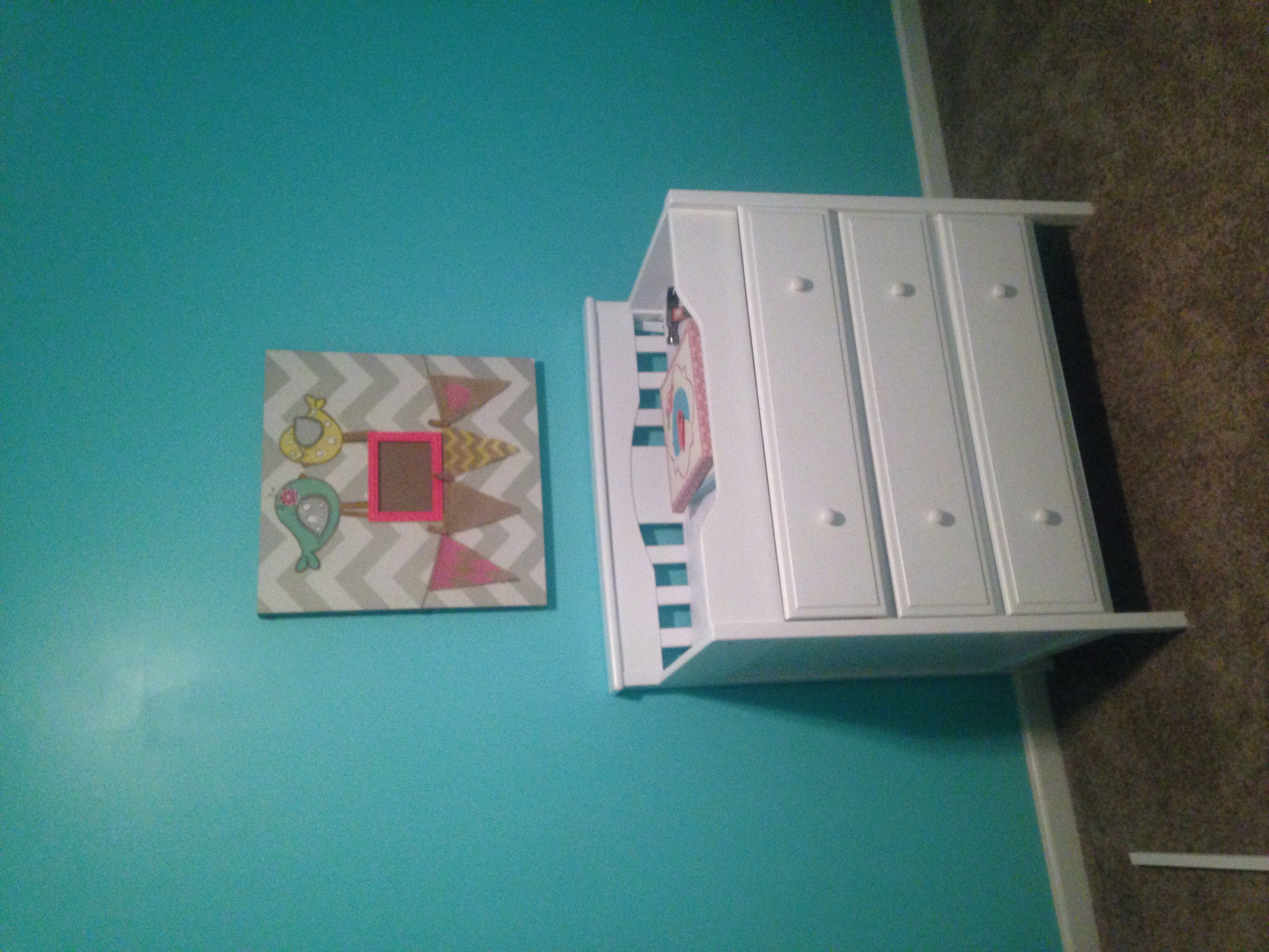 Here is one wall. Haven't finished the rest of the room but have the crib and dresser set up. I need to hang a small shelf near the dresser/changing area.