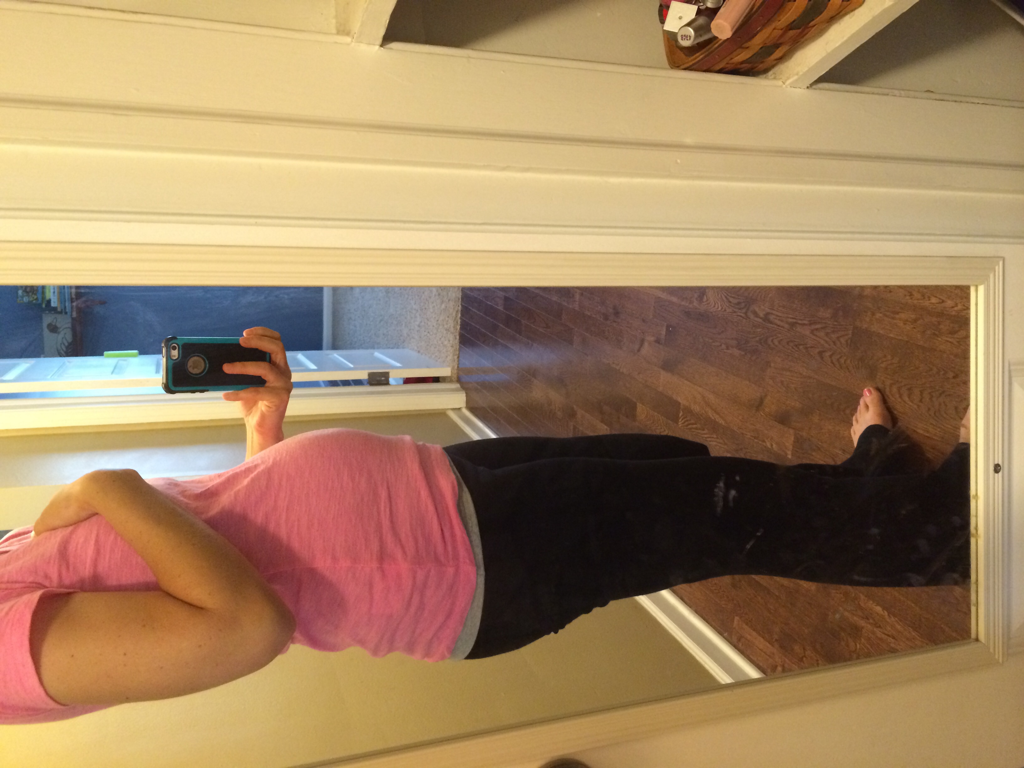 I've got no visible bump yet- I can tell but I don't think it's noticeable to everyone else yet. I did break out the maternity pants this week though! I gave up trying to keep my leggings up and having my jeans squeeze me