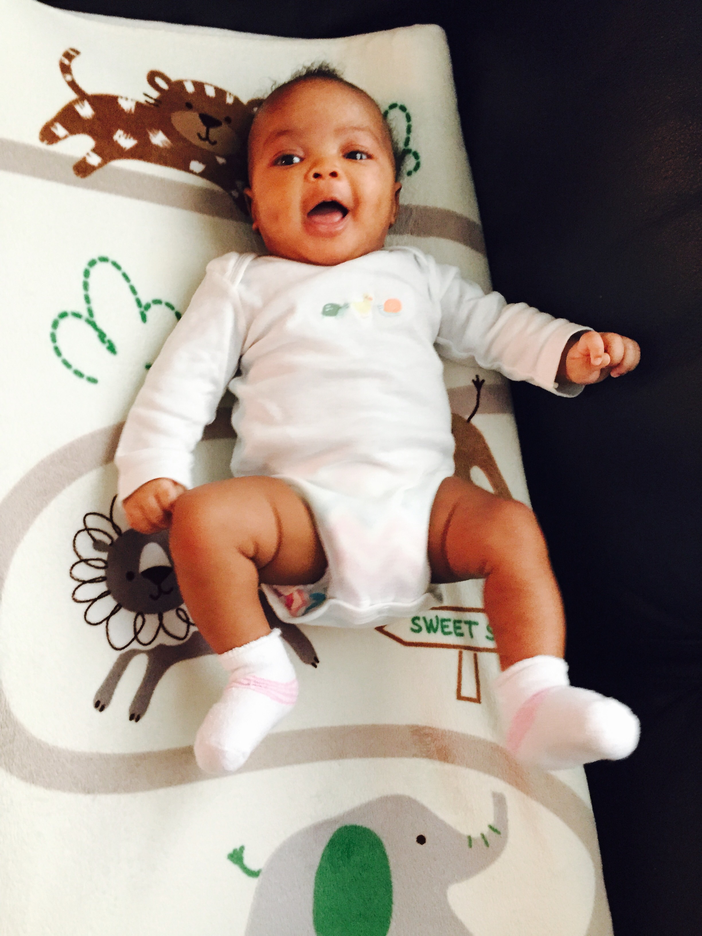 This is Georgia who will be 2 months tomorrow. She weighed 10 pounds 6 ounces last week. She is finally laughing and cooing and smiling more now that she's on Zantac for reflux. She sleeps about 6-8 hours a night.