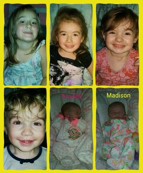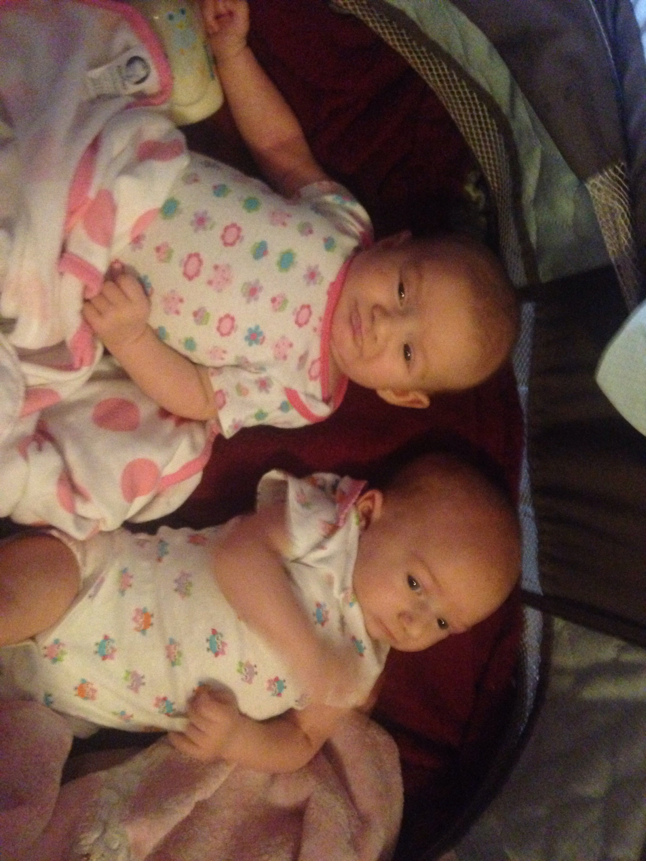 Madison and Scarlett are two months old they are each almost 10 lb they were a little over 6 lb each when they where born. One pic is just them and one with their sisters