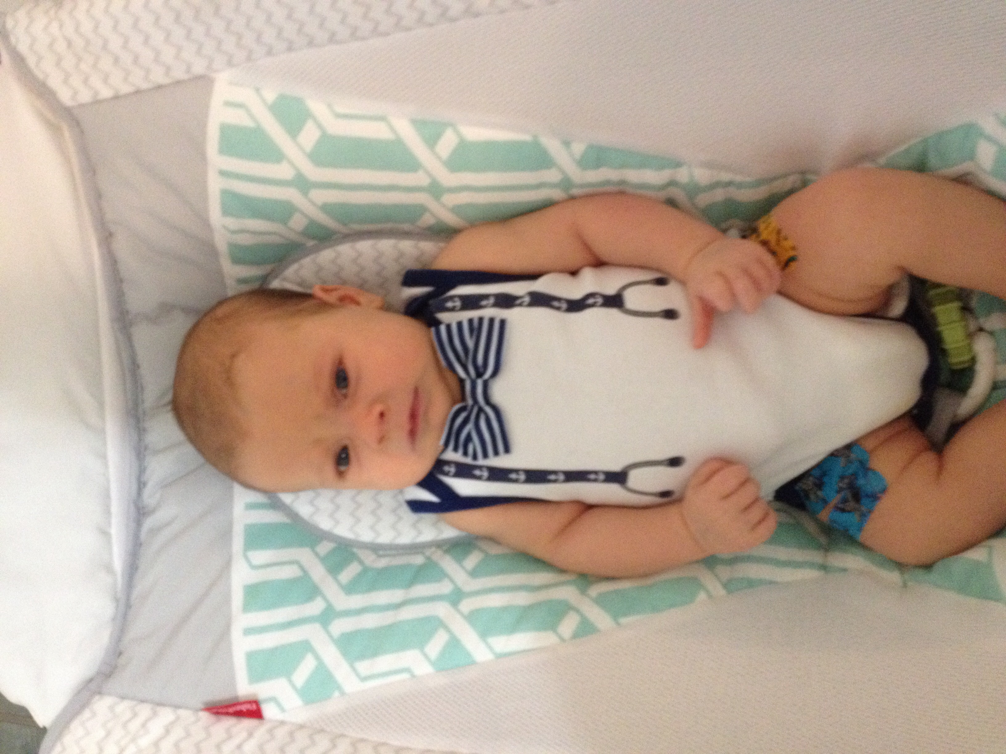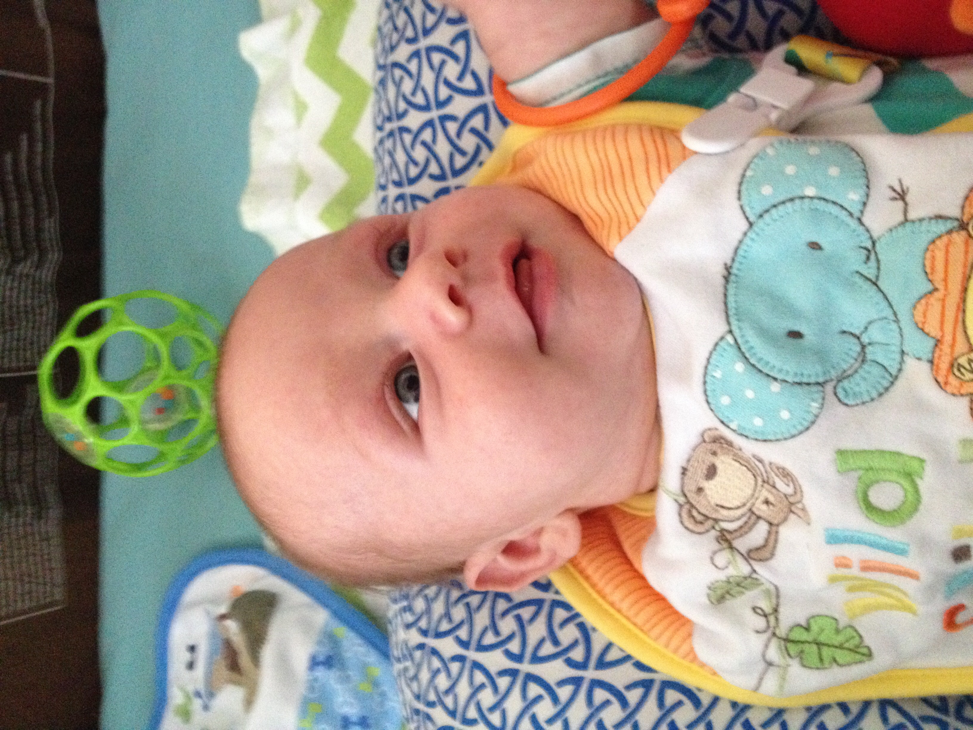 Daniel is 7 weeks, and 12.5 lbs. He loves going outside and went swimming at the pond this week. He kicked his feet and moved his arms and laughed at the water, I couldn't believe it! He loves getting his diaper changed more than anything. Just started sleeping 6 hours at night!