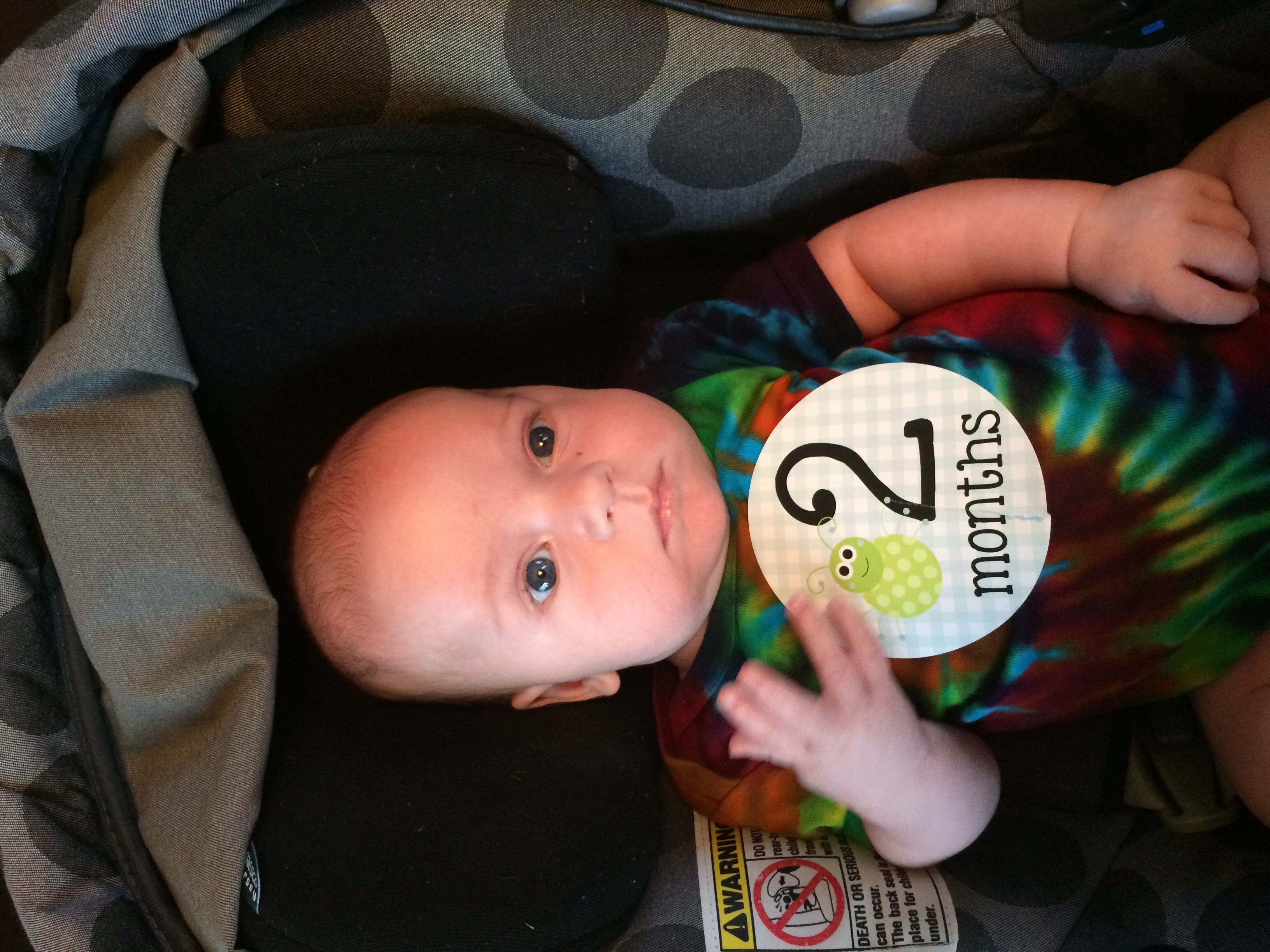 Warner Jameson will be 2 months old tomorrow! He loves tummy time and I swear if he could figure out how to use his arms he would be crawling! He's been lifting his head for a while now, and loves to do it! He has been cooing and smiling a ton. He loves kisses and being held. When you kiss his cheek he turns his mouth to you with his mouth open like he's trying to kiss you back! He loves car rides, his stroller and being outside or in public! This picture is from after his shots 2 days ago, he wasn't happy! He weighed 12 lbs 12 oz and is 23.75 inches long! He's such s happy baby!