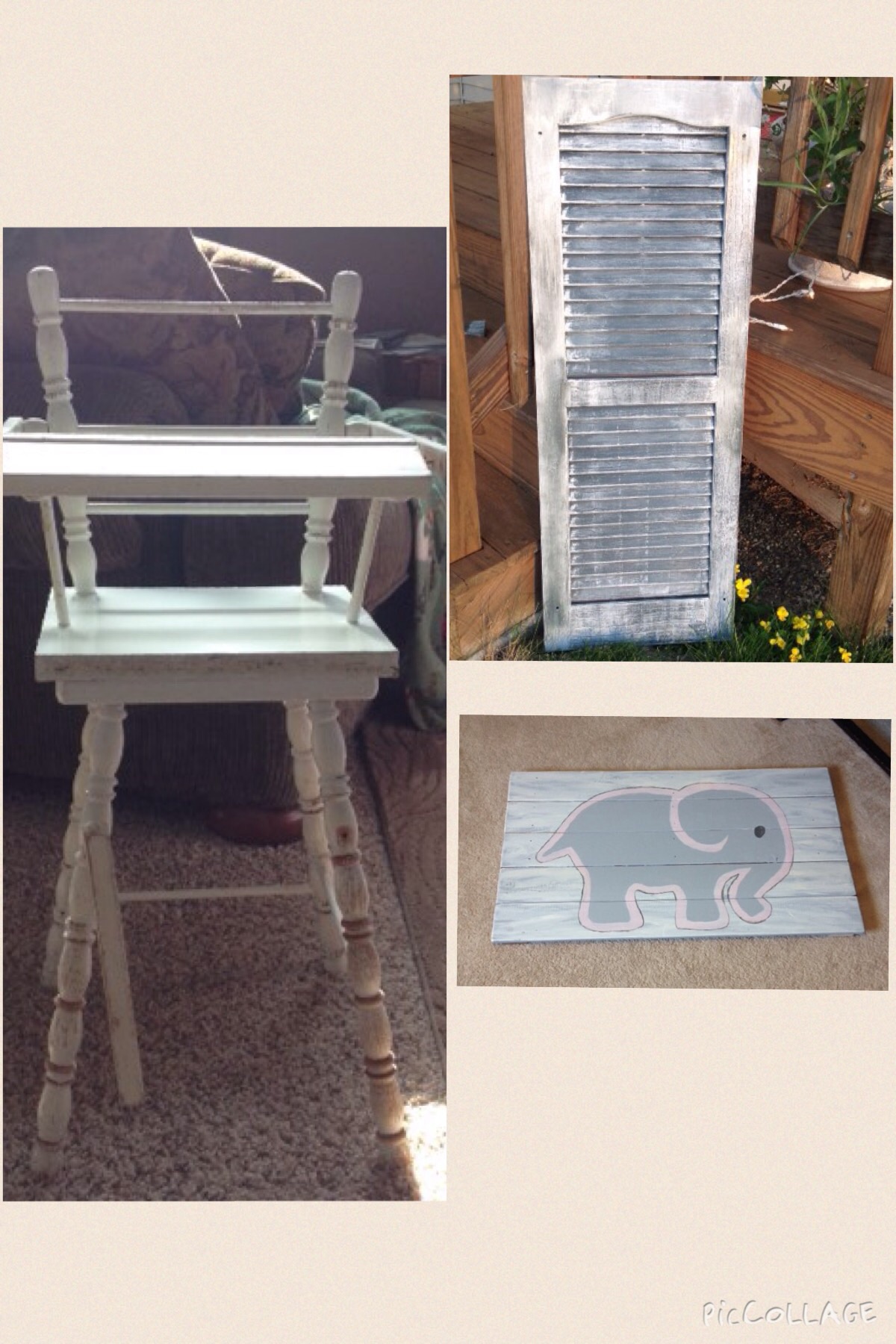 Here is kinda the theme of baby girls nursery. Going real vintage and all grey and white with subtle hints of light pink. Just searching for the perfect glider and white shag rug.. (The old high chair has yet to be finished btw)