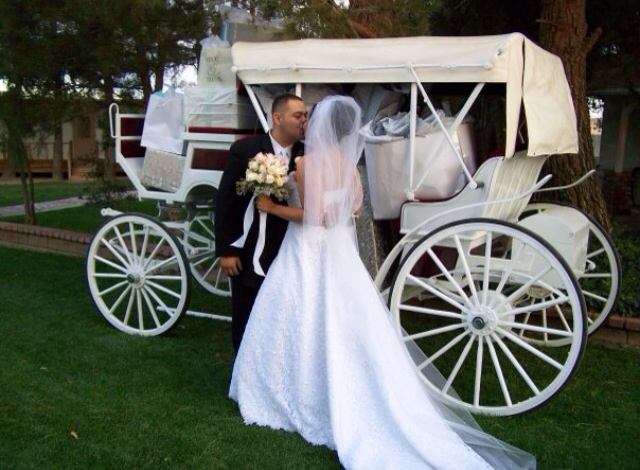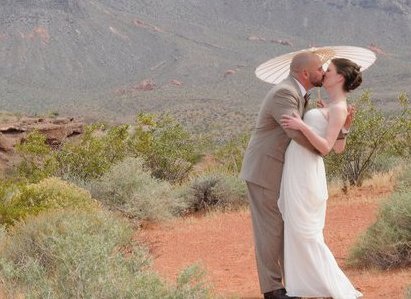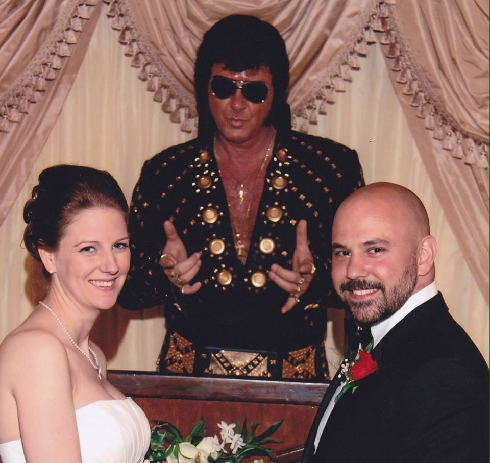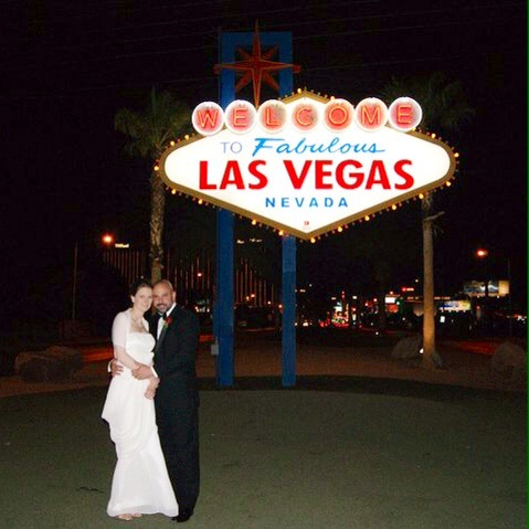 Vegas, baby, Vegas! We got married four years ago in May, while I was about 21 weeks pregnant. We had been together at that point for about 13 years. We drove everyone out to the middle of the Valley of Fire Desert for the ceremony, then had the reception, followed by renewing our vows with the King. It was perfect.