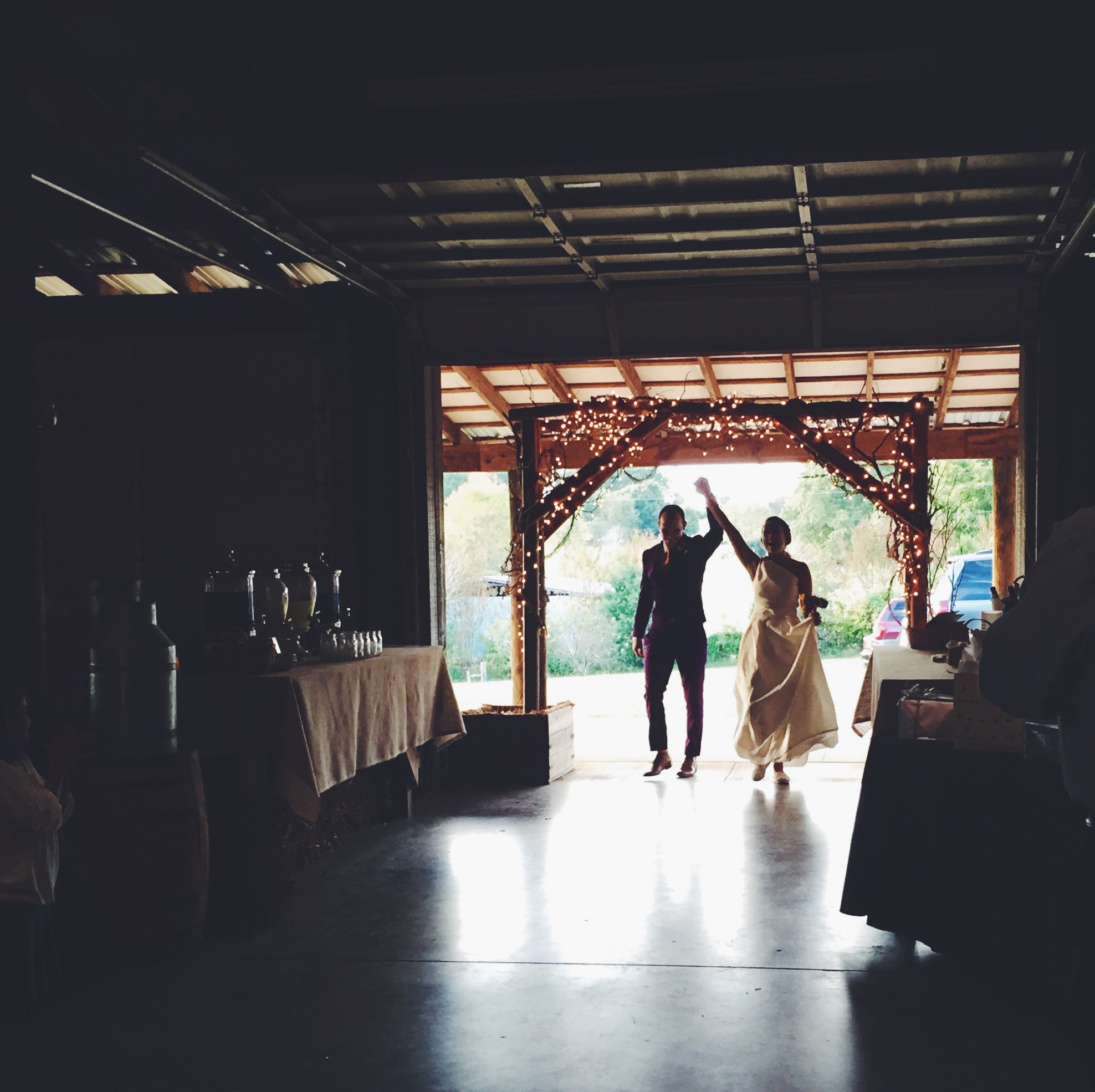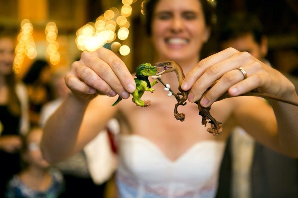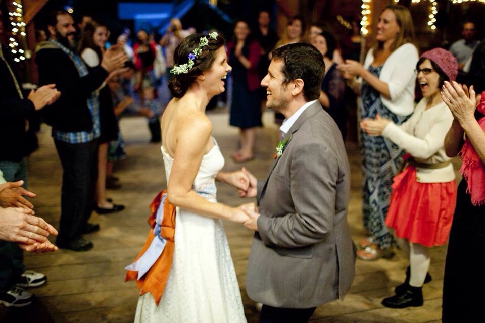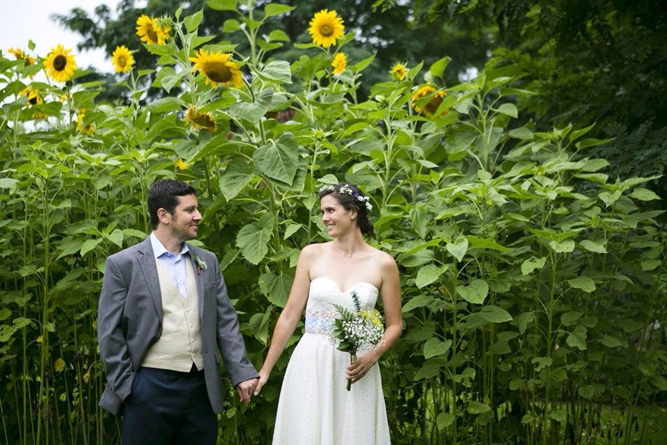 We got married last August. Had the most low-key budget wedding we could manage. Got married at a barn and had a contra dance reception. My friends made our cake and toppers (dinosaurs!) and I made my dress. A few guests helped us pick flowers from our garden for decorations and my crown. It was so fun and went by so fast!!!