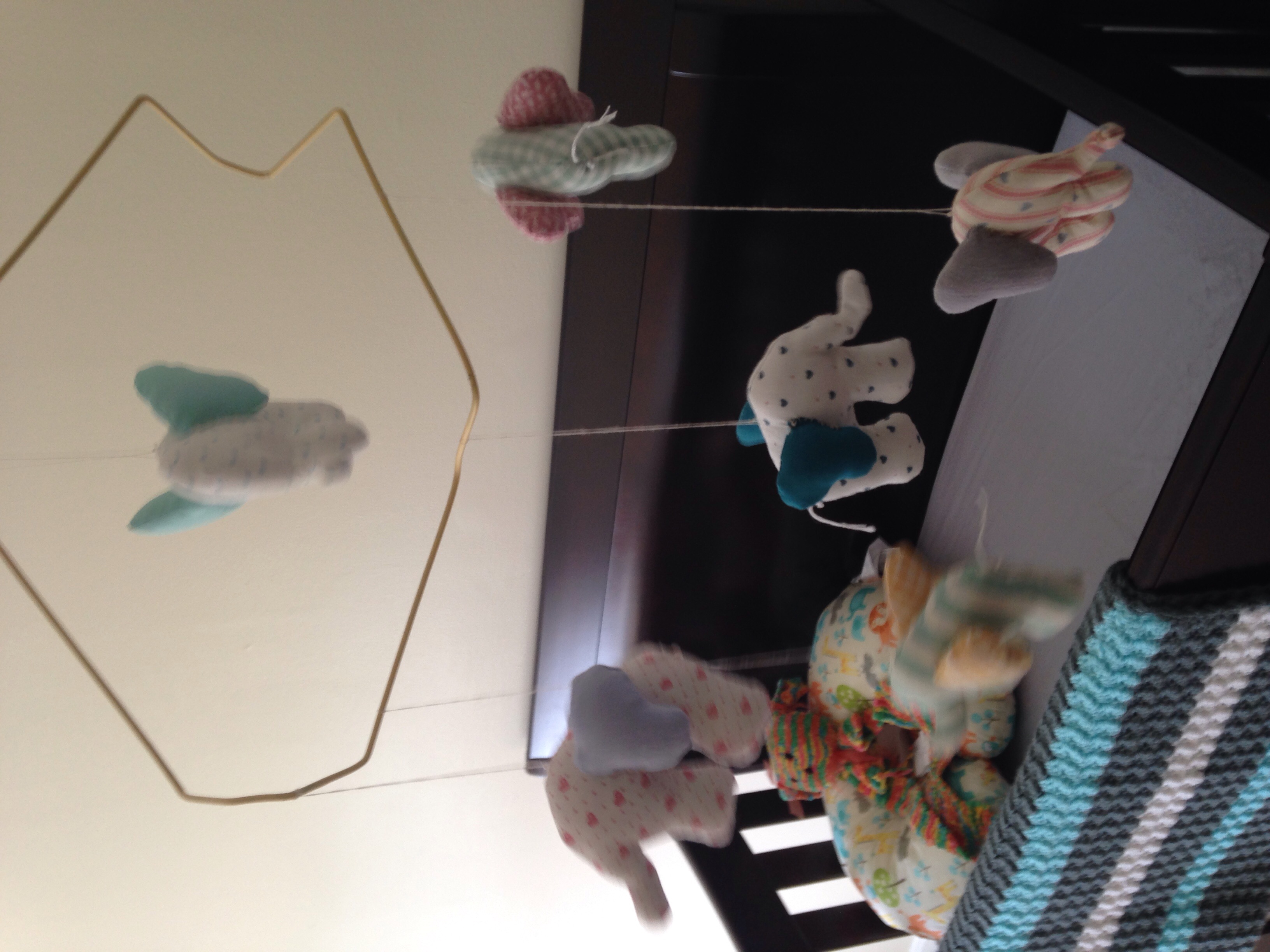 • For DD I made a butterfly one and plan to make a pinwheel one for this baby if it is a boy (the butterfly one is very pink!) We hung it from the ceiling over the glider and DD could see it from her crib or when she was nursing in the chair.