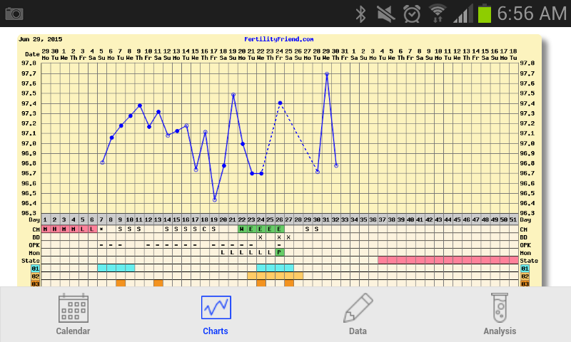 Symptoms/Rants/Raves/Chart Stalk: Nothing has really changed from yesterday... temps are going up. On Monday my temp was really low up I'm thinking that was just because I was up a lot Sunday into Monday. So I'm taking that with a grain of salt and not thinking too much about it. Also, AF was 30 last cycle and only lasted about 2 days, but I think that was more my body still recovering from my MC as this cycle seems like it's going back to the "normal" 40 day cycle... This is just another thing I have added to my already full stressful plate. (My office is about to go under some major construction and I manage our clients technology lab so knowing things will be closed for 60-90 days is really not helping my stress-level stay down at all... I just need to remember to breathe and relax.)