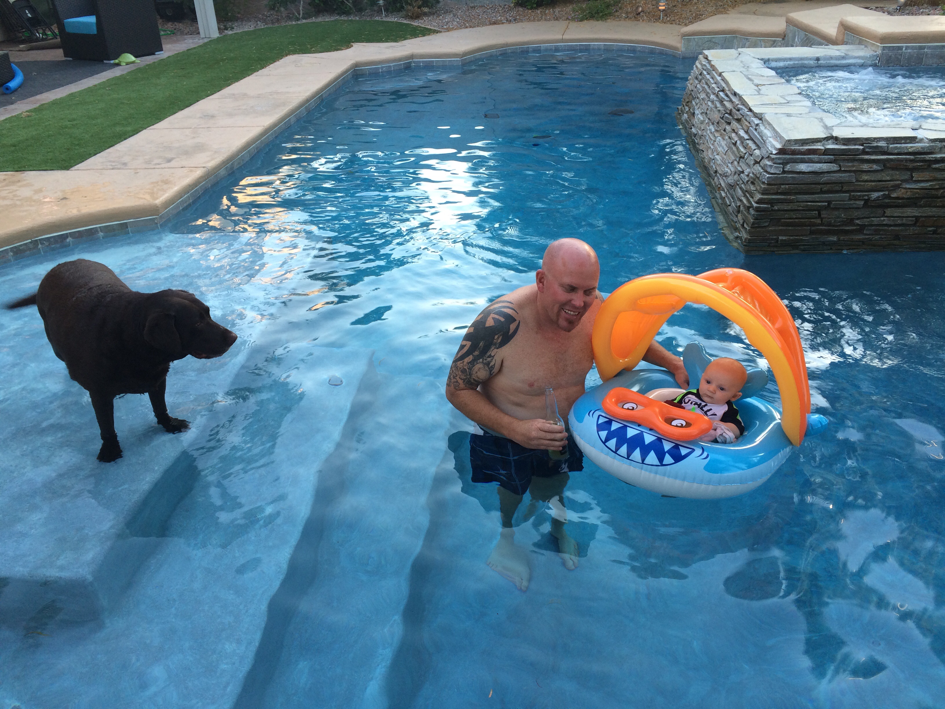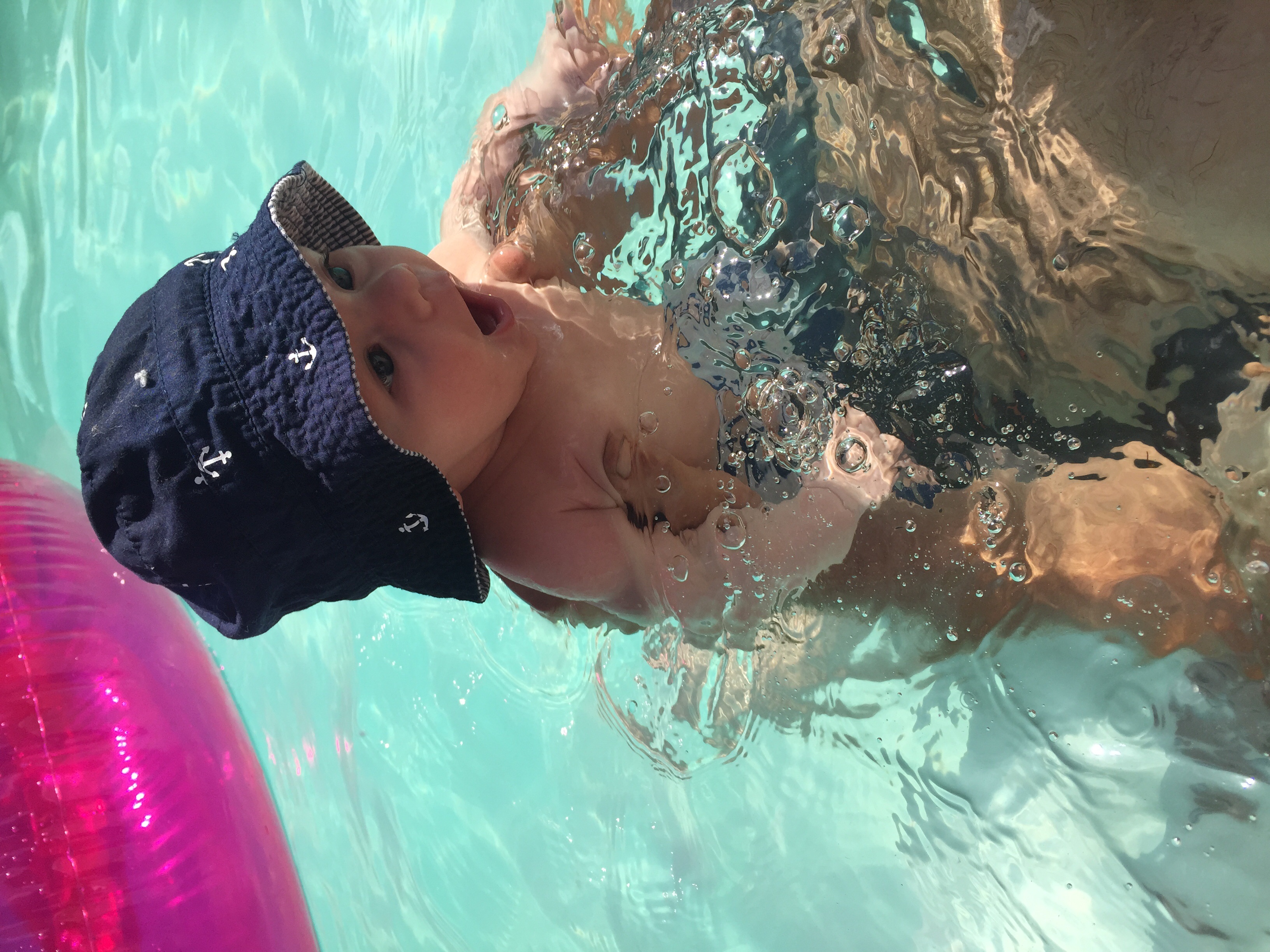 I had my DD in my parents pool when she was 9 weeks. She had been in multiple times since and has never had a reaction. The first time I just dipped her in to her knees to see if she would get a rash and she didn'. I also make sure it's above 80 degrees