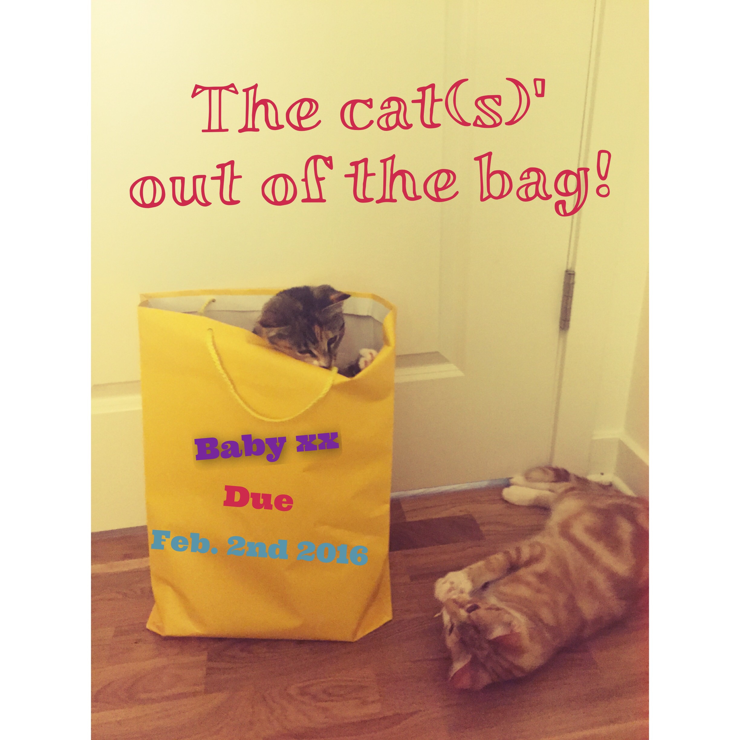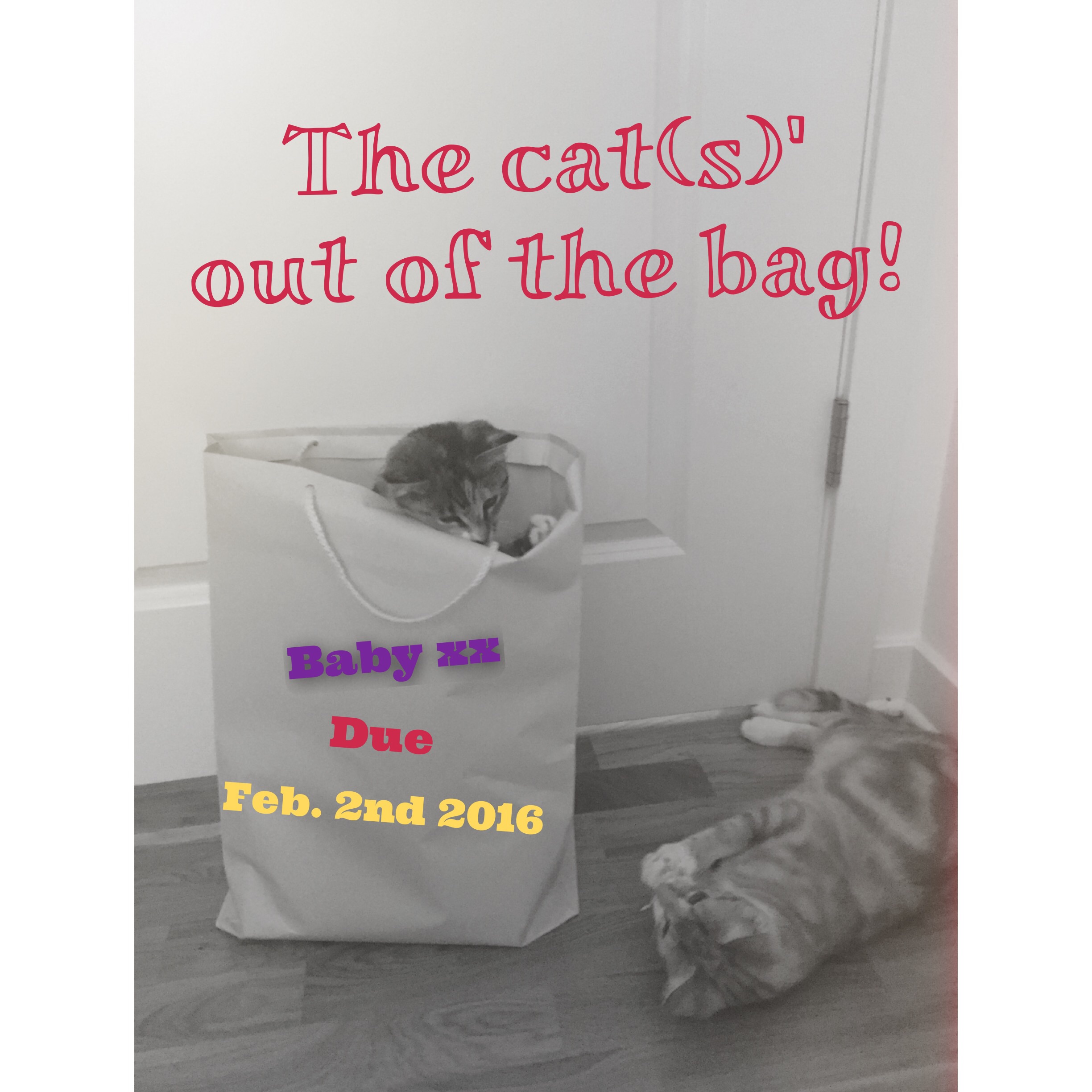 • I'm going to work on mine this weekend. I want to do a picture of my kittens popping their heads out of a brown paper bag. On the picture, I'll write... "The cat(s)' out of the bag!"
