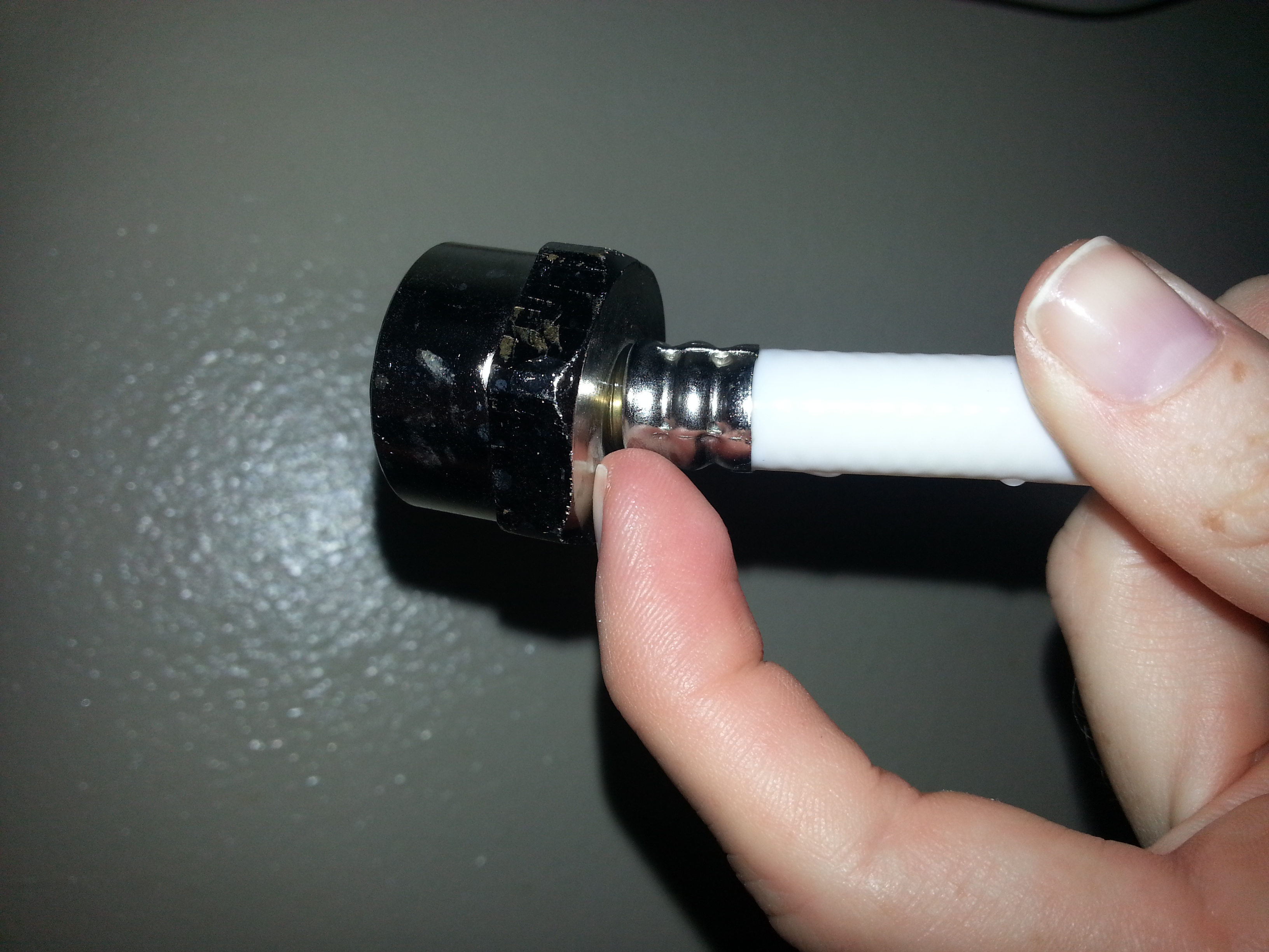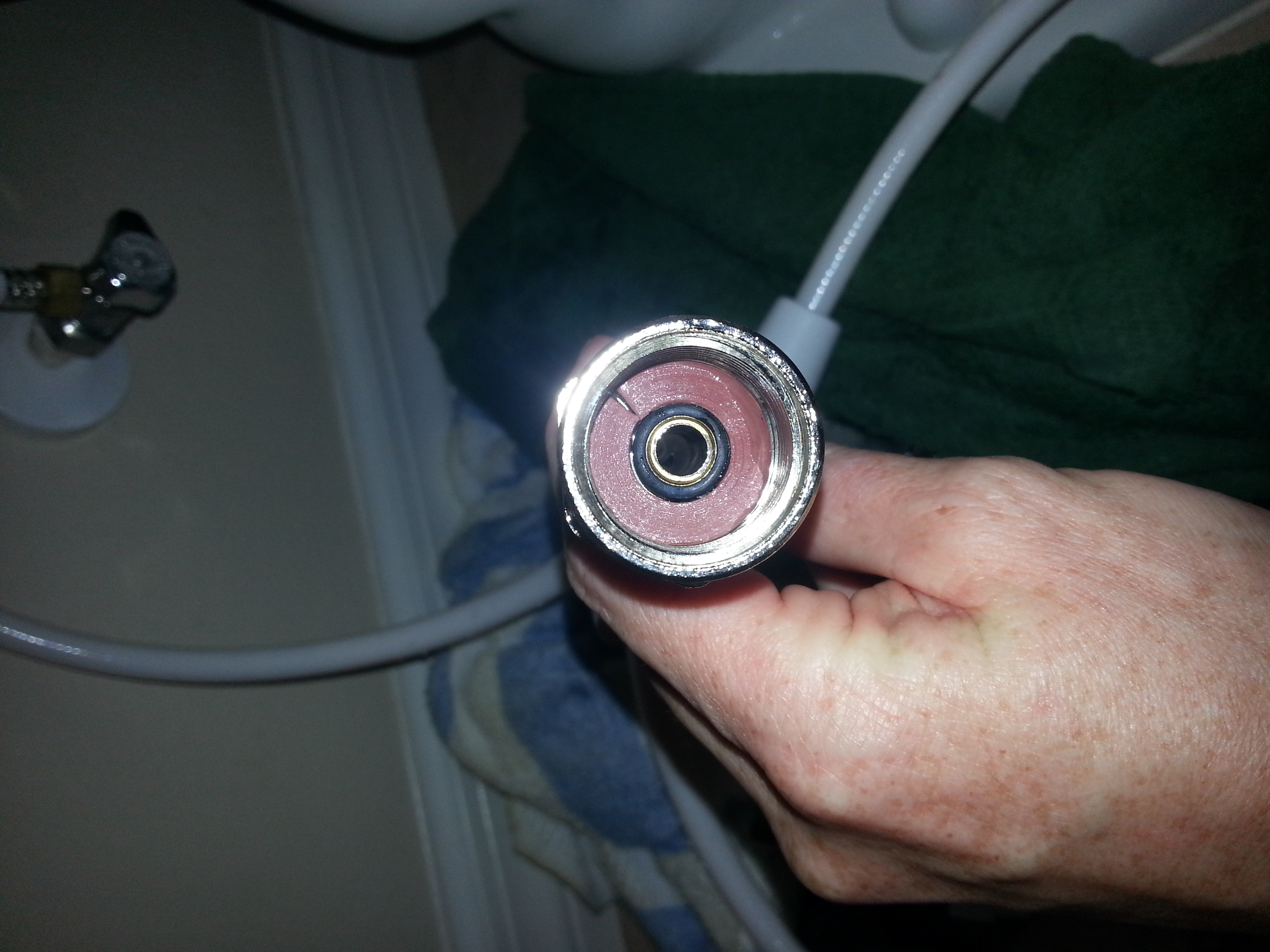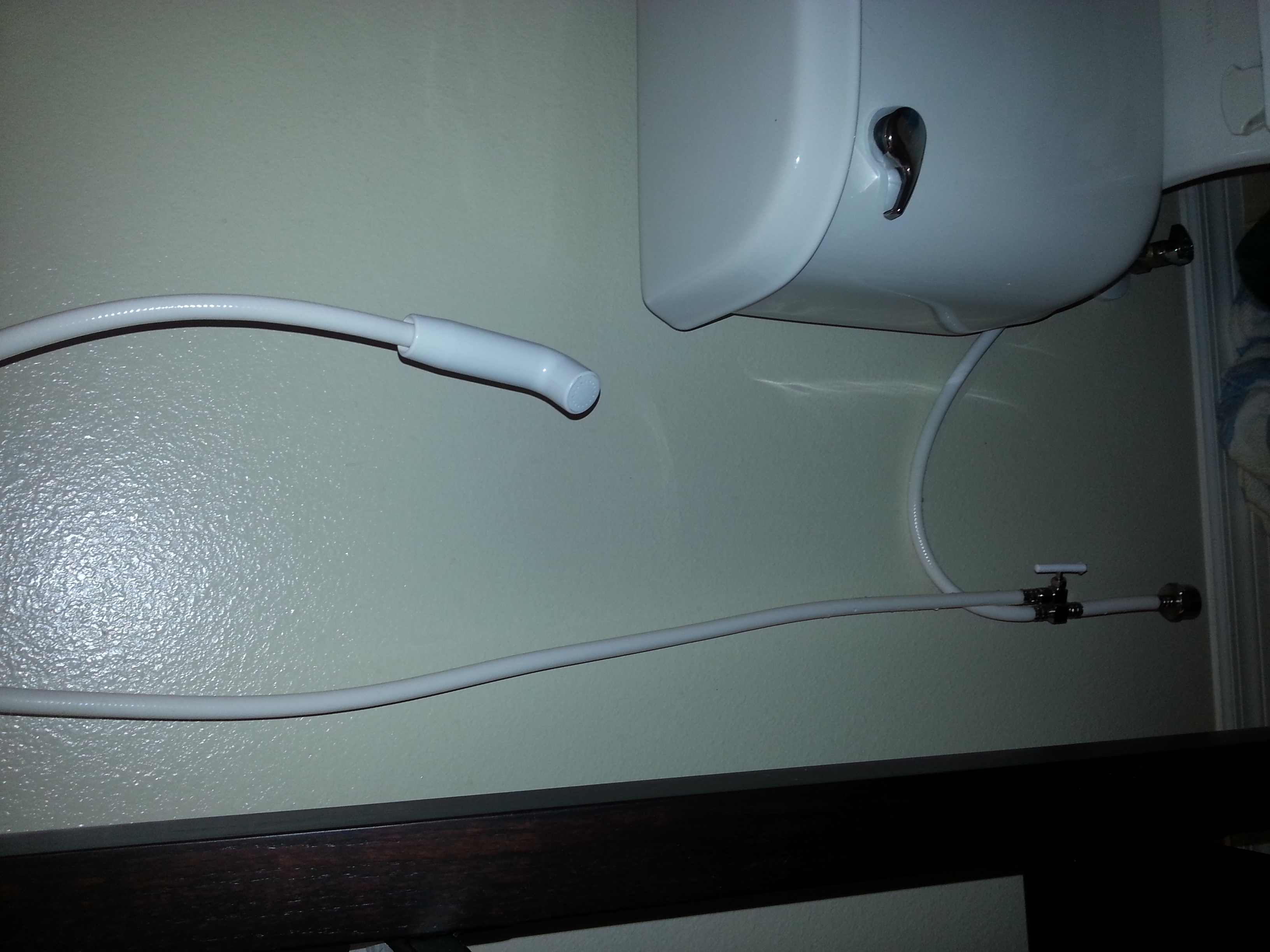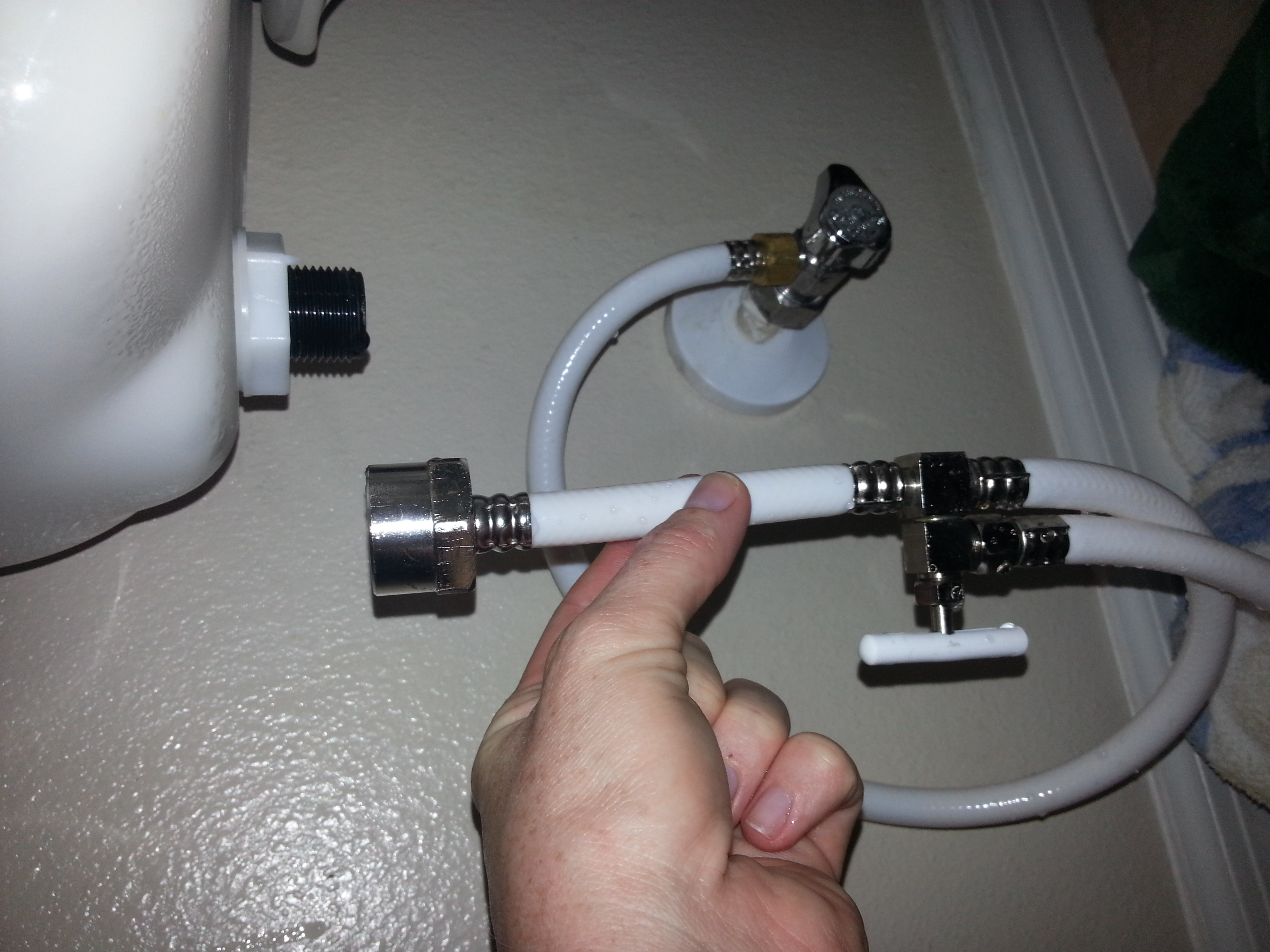 Hi everyone, I need some help. My girlfriend gave me her diaper sprayer and I trying to install one for the first time. I followed the YouTube videos in how to install but it still leaks. See where the hose meets the part that screws into the tank? That part leaks. What am I missing?