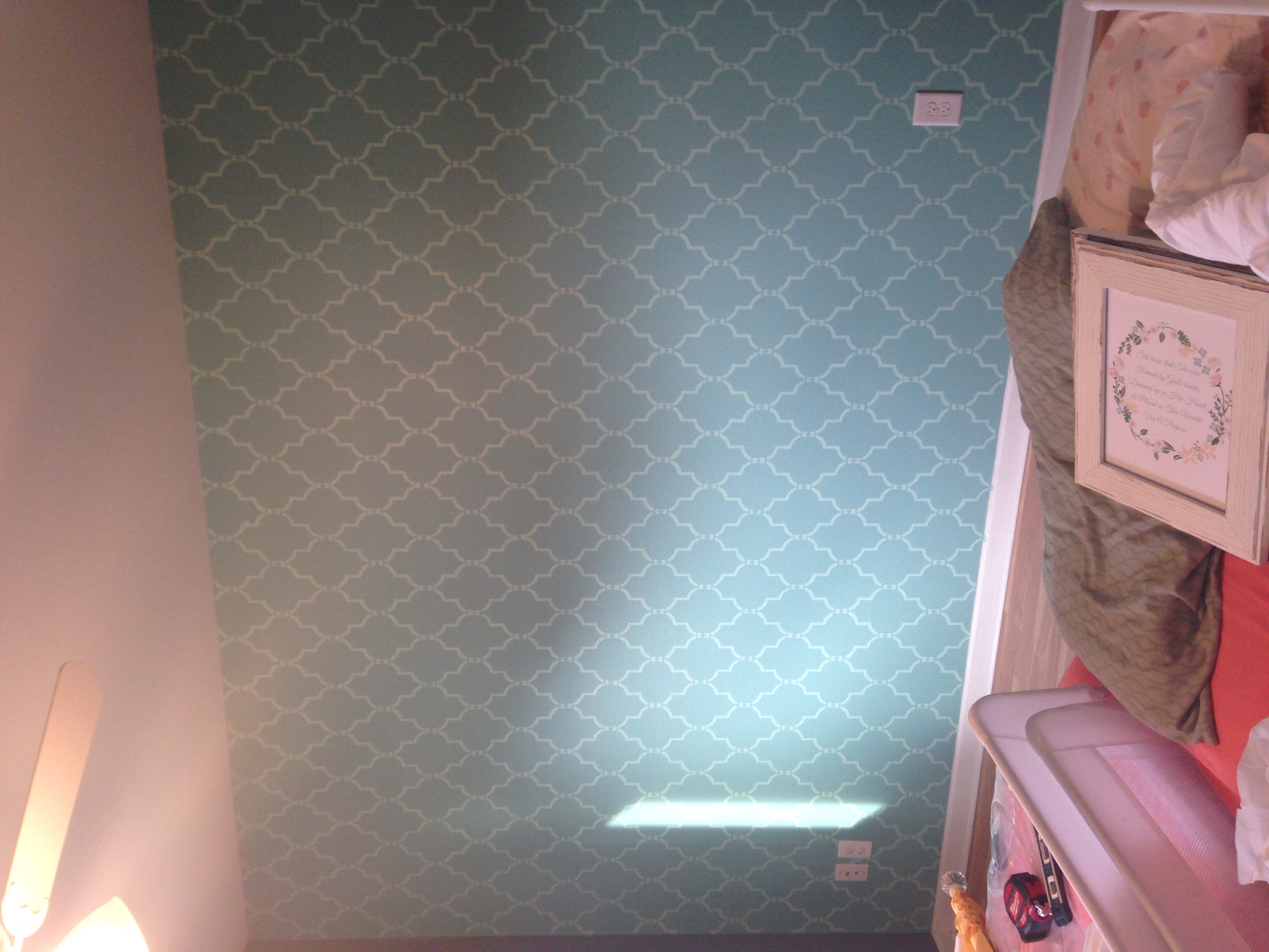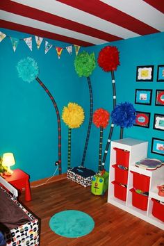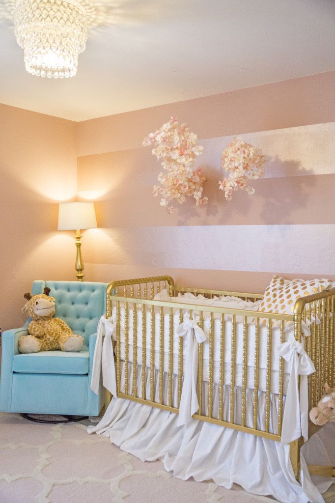 I love the paint in the first photo (the darker pink and light pink striped.. and the flowers on the wall)- hate the blue chair