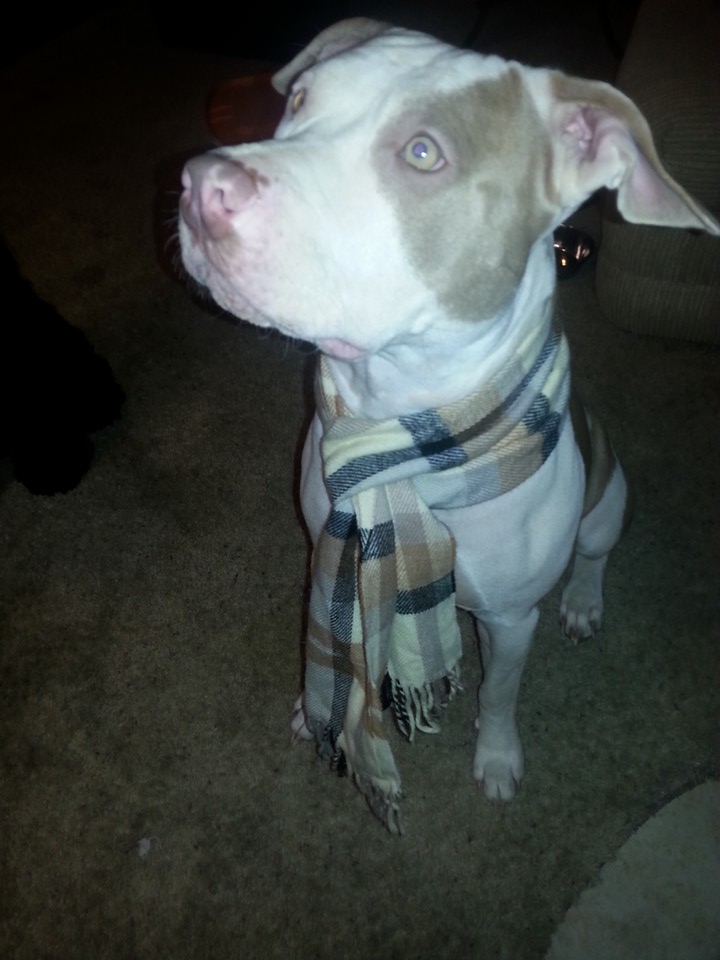 EDIT: The picture was taken in the winter, she likes her scarf when shes cold, just like she likes her blankets. I dont dress up my pittie just for the hell of it. lol.