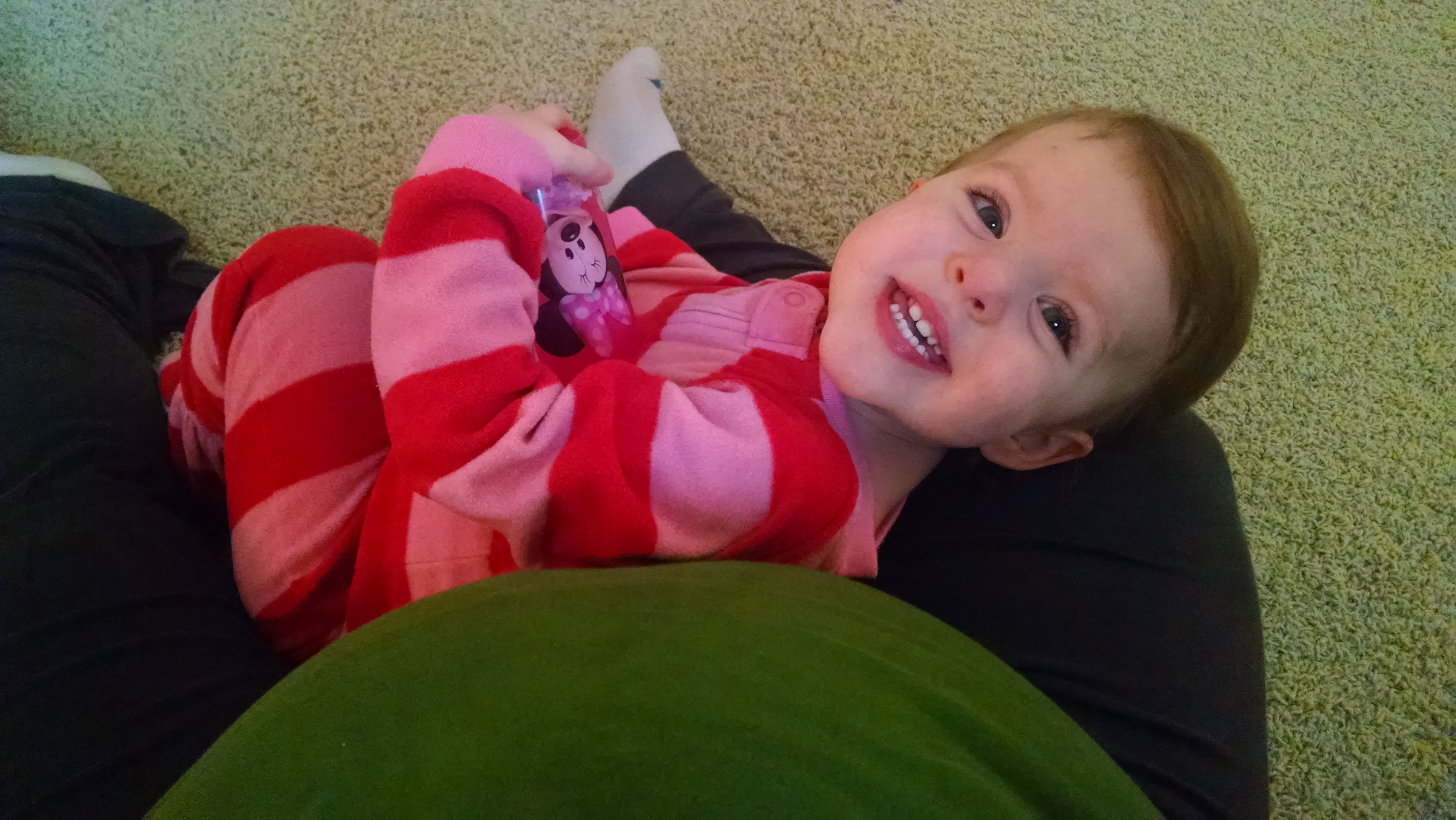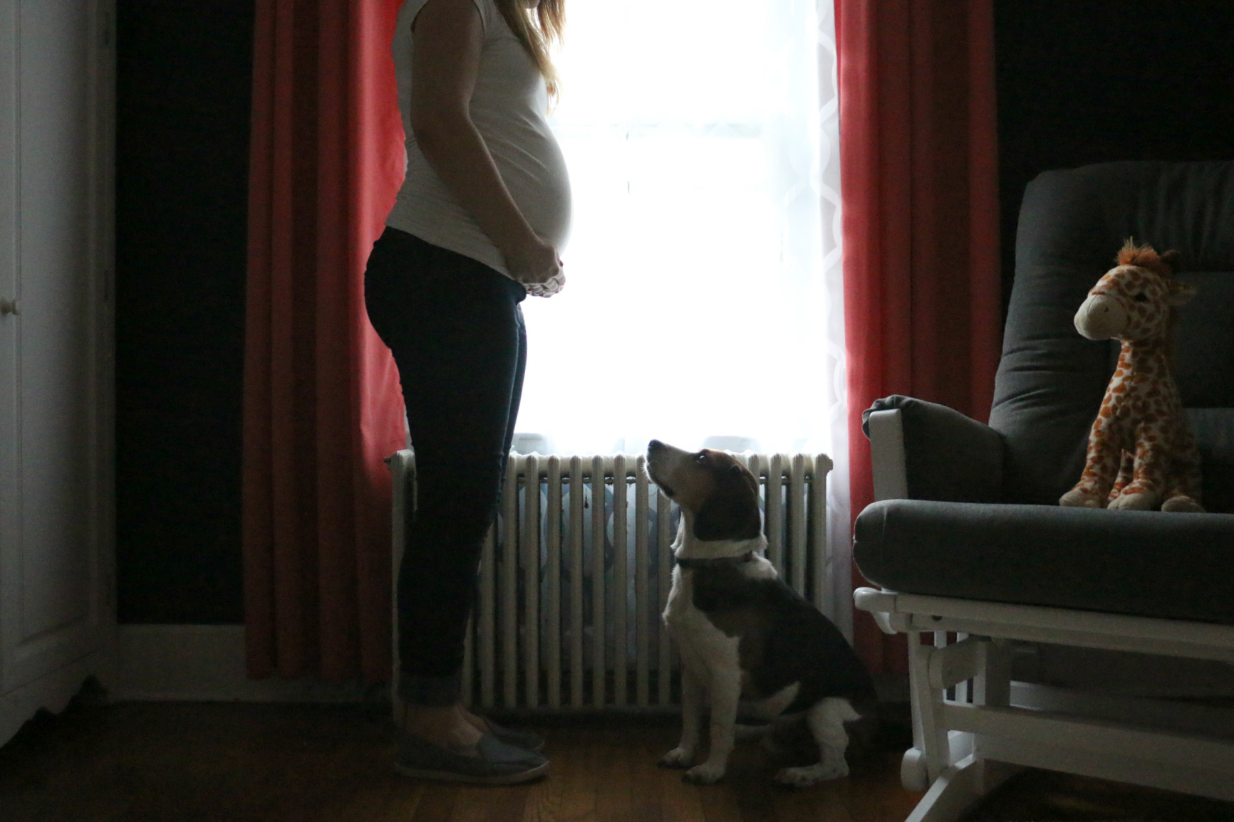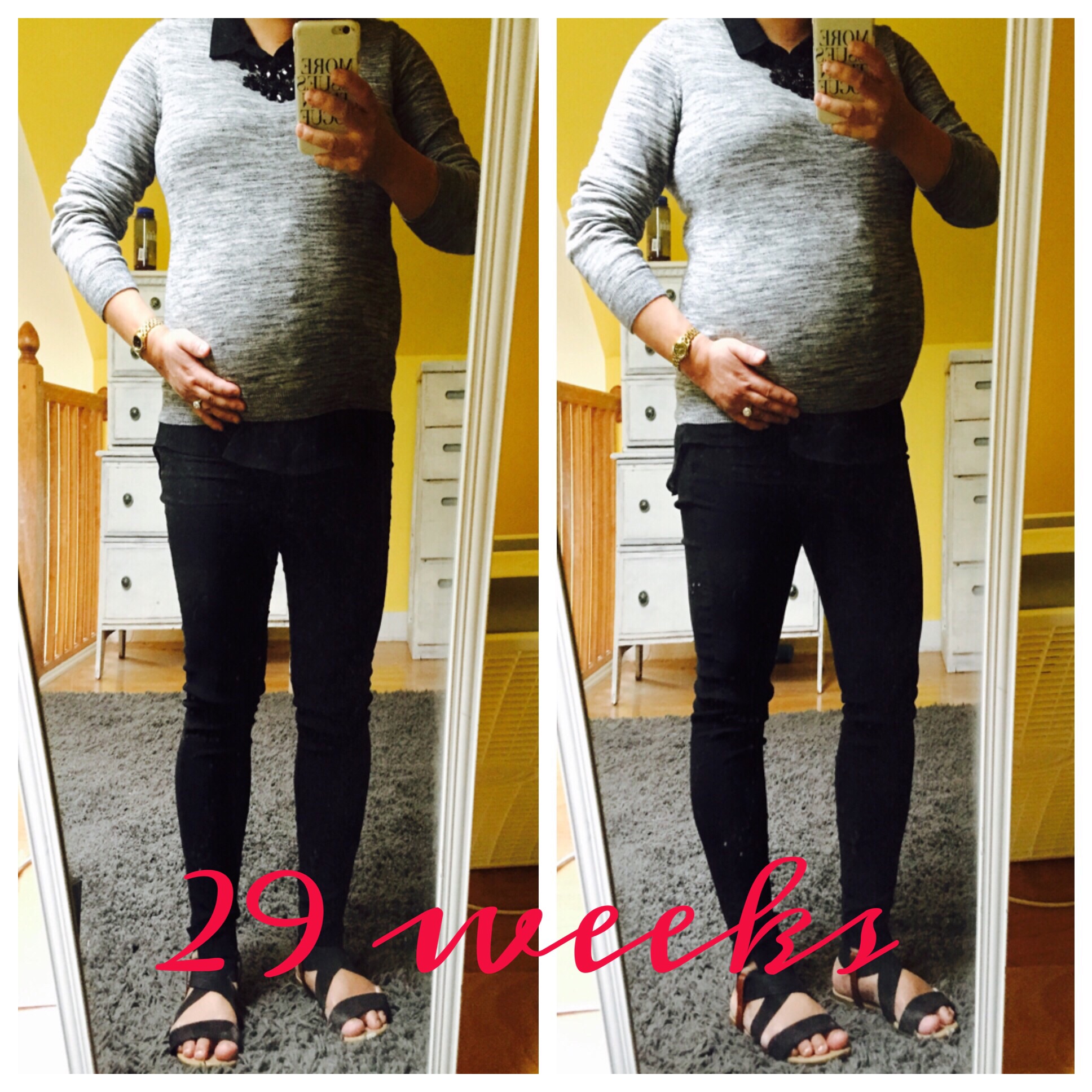 29 wks 6 days. Celebrating the unusually cool weather by pulling out the maternity pants!! Little photo bomber is wearing my favorite of her pants too (red corduroy)