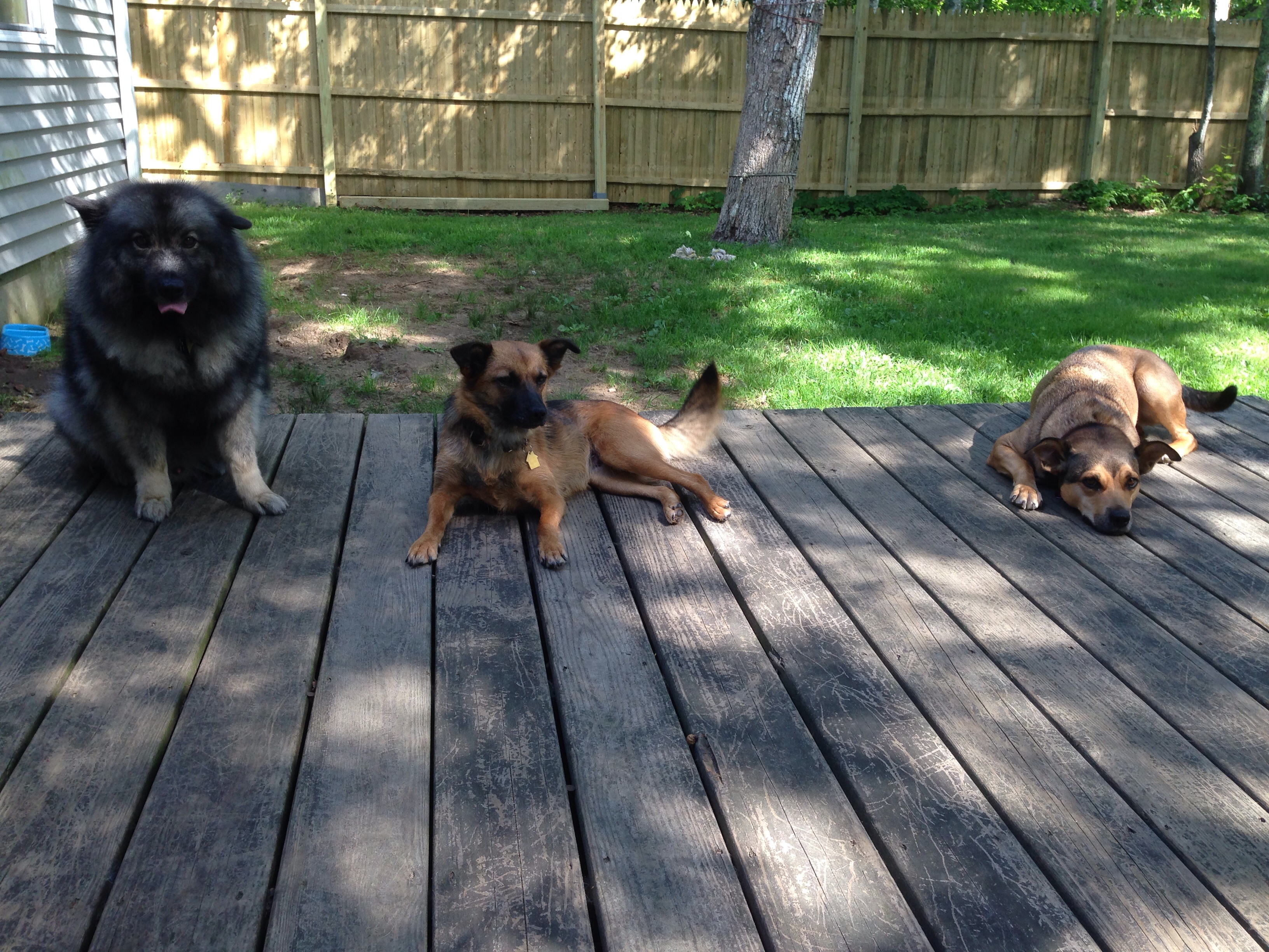 The good ball on my bed is our pit sugar bear. She's a sweet heart. The one laying by his water is my best friend and springer spaniel, pinkus. His name is a long story lol. And the little one is ferocious chewbacca