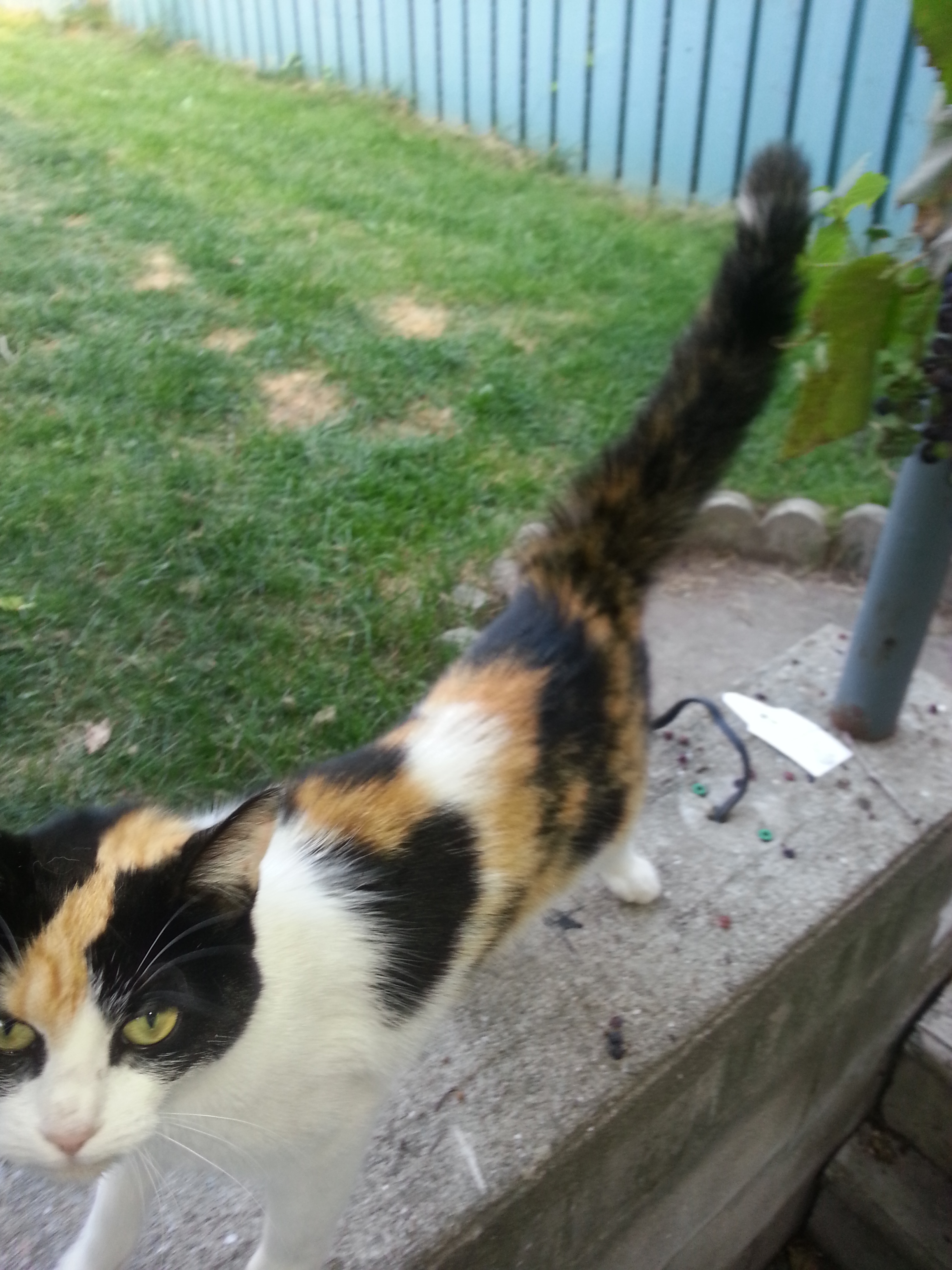 It/he/she has no collar, is rail thin, and is a young cat. We have provided food 2-3 times in the last 4 days. (No wonder he loves me!) And he almost followed me in to the house last night. DH and I look forward to seeing Miao... and watch out for him on our fence.
