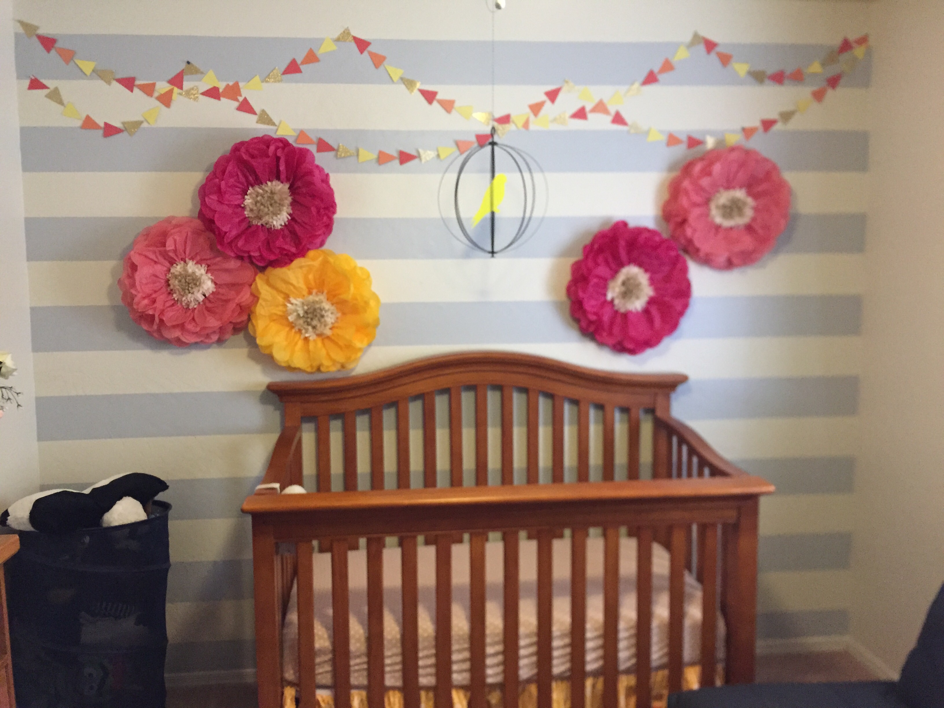Here's my first of many projects to come. I repurposed a big cork board. Covered it with fabric and ribbon to hang her head bands. I'm going to do another one for clippies. I haven't painted her room yet. Hence the blue walls.