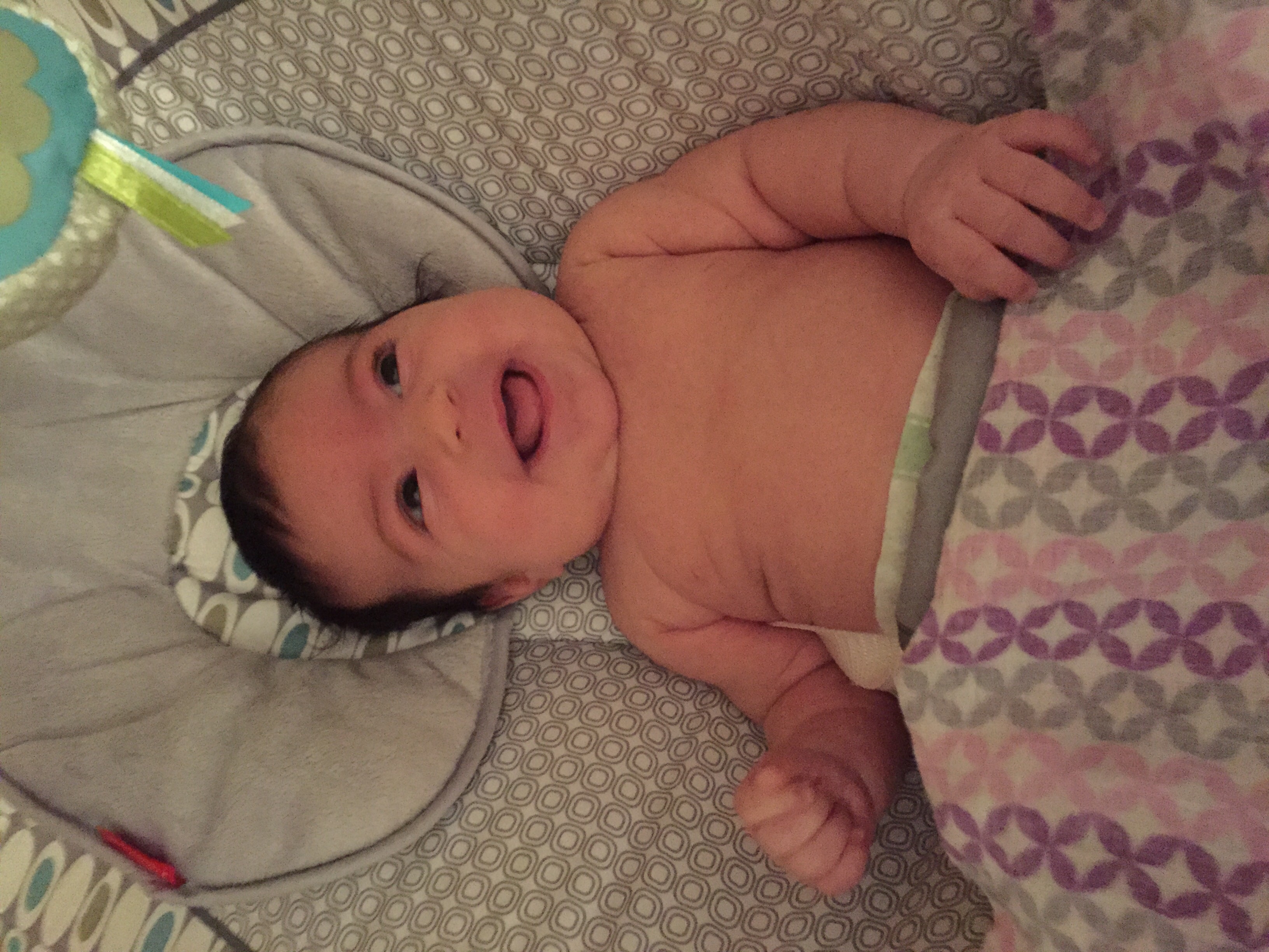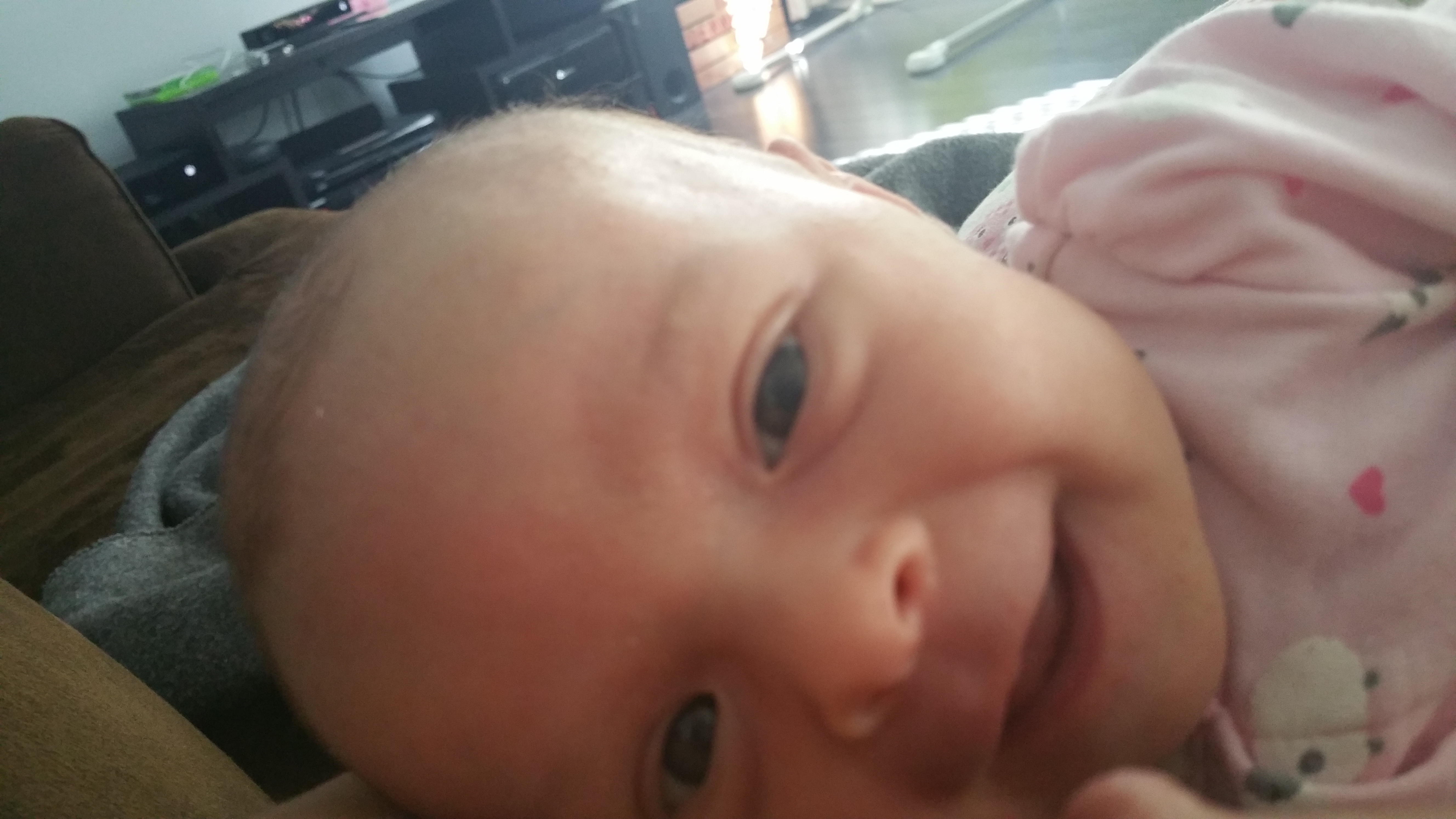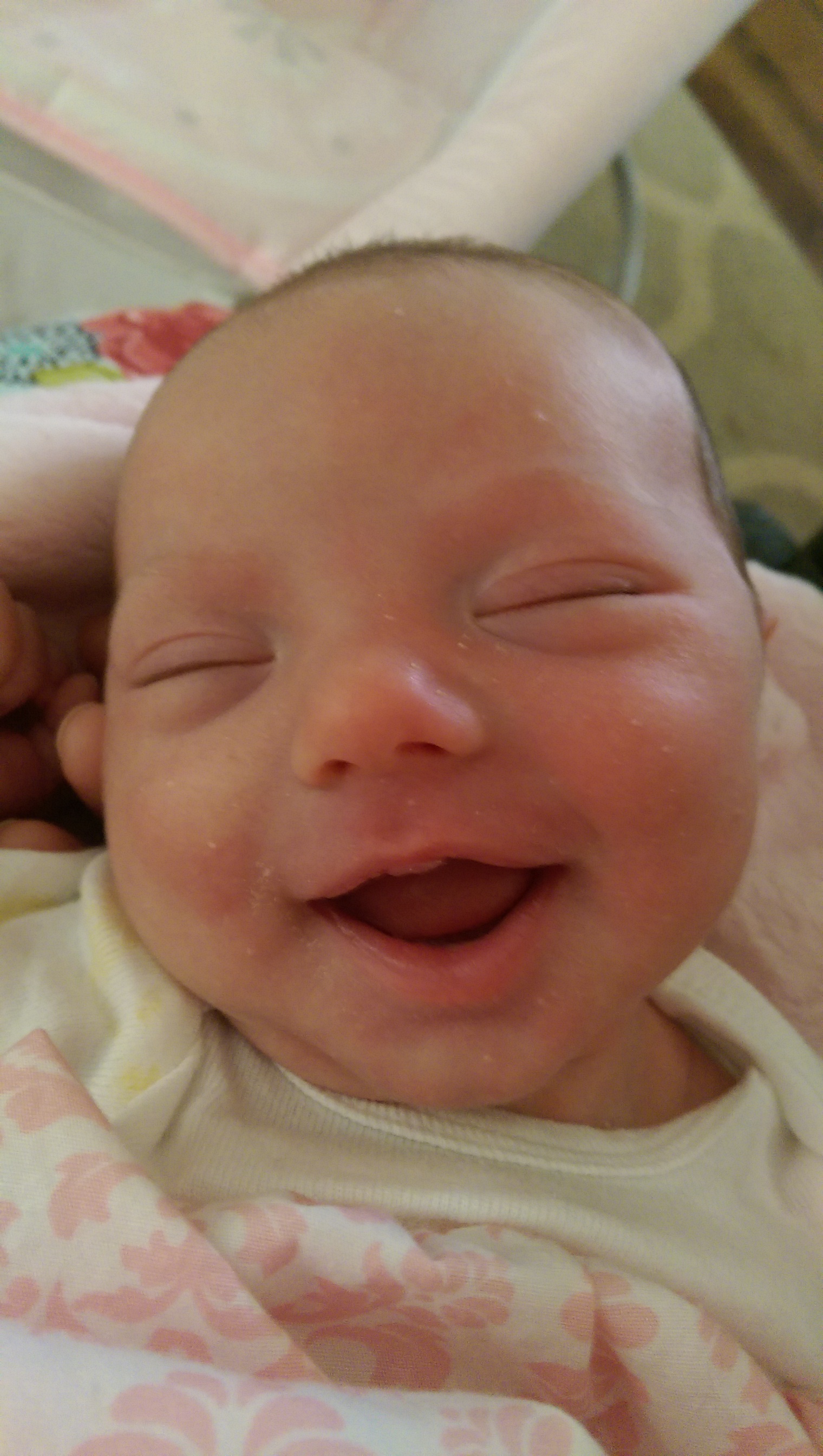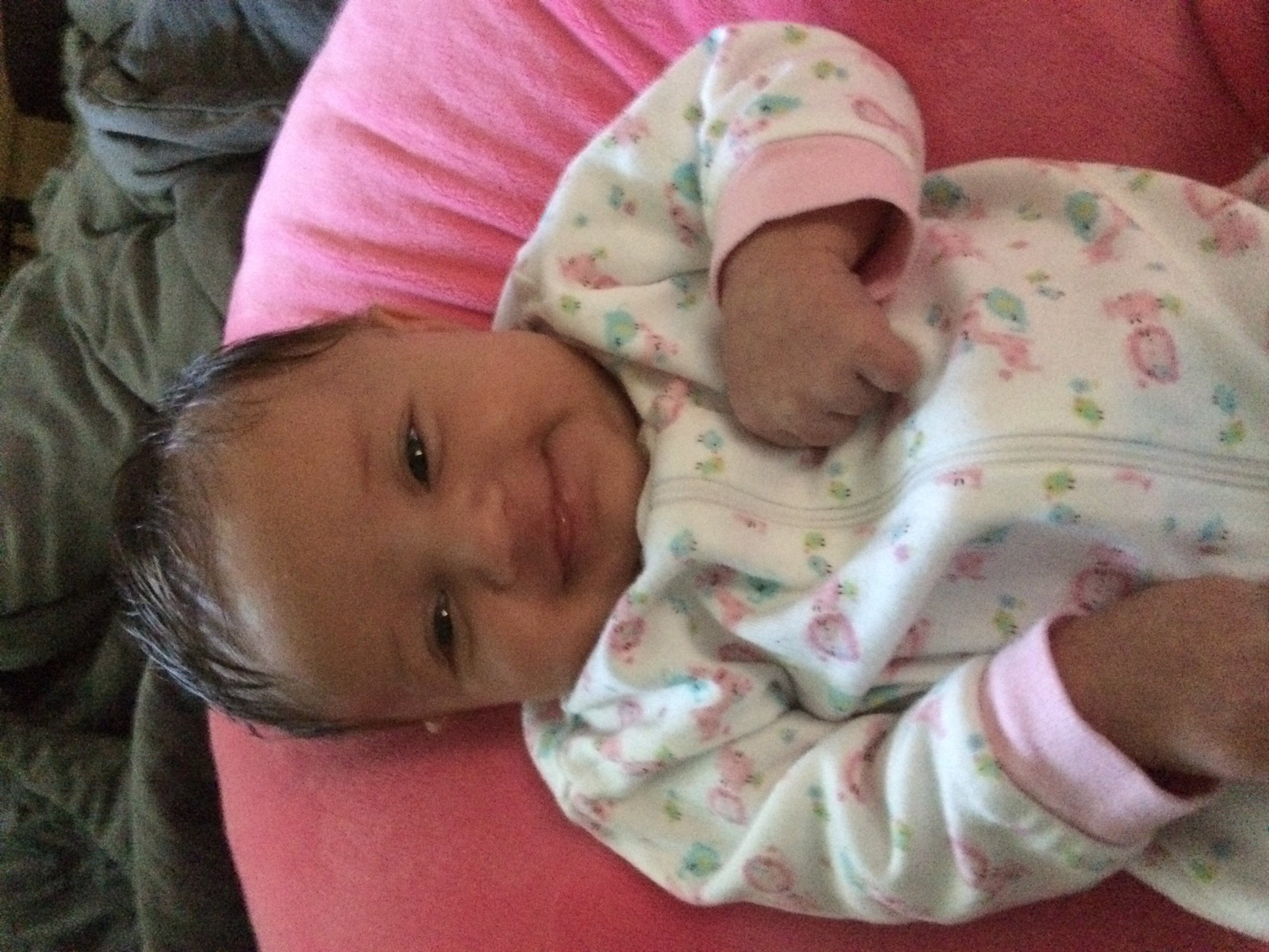 Arya Jade 5 weeks...this was the best smile ever, she was just listening to me talk to her then all of a sudden I kissed her and when I pulled back..bam!!