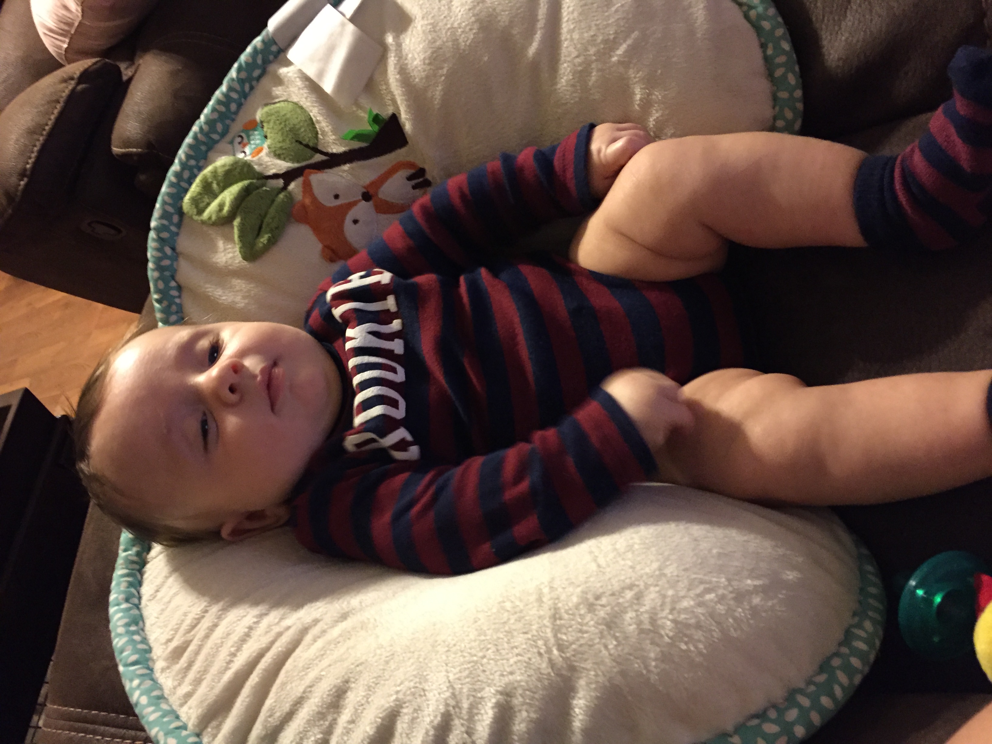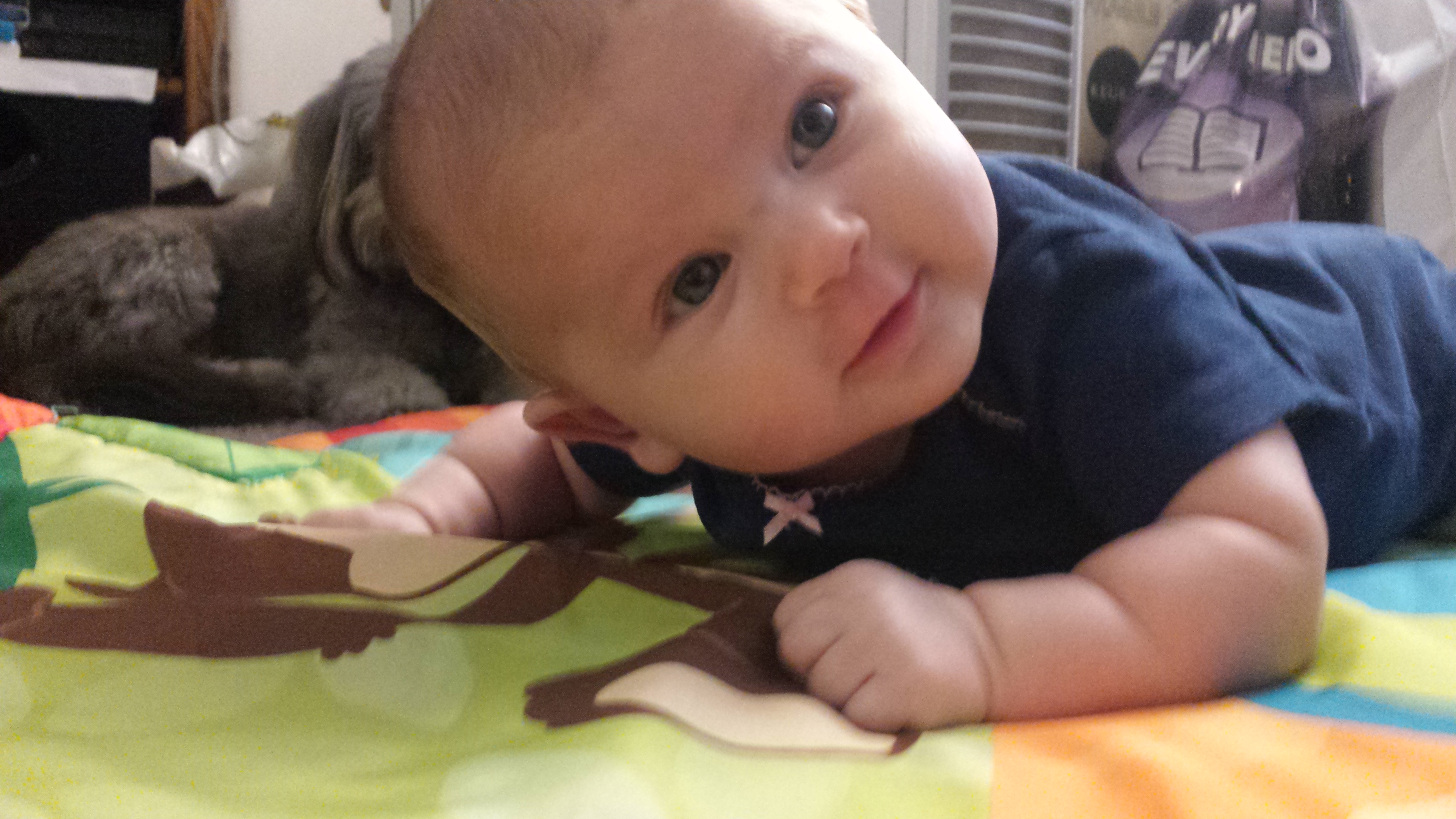 Mackenzie is 2 months now and weighs 11 lbs 2 oz, 22 inches long. Wearing size 1 diapers and 0-3 months clothes. She was 6 lbs 12 oz 19 inches at birth. EBF. This picture is from today's tummy time.