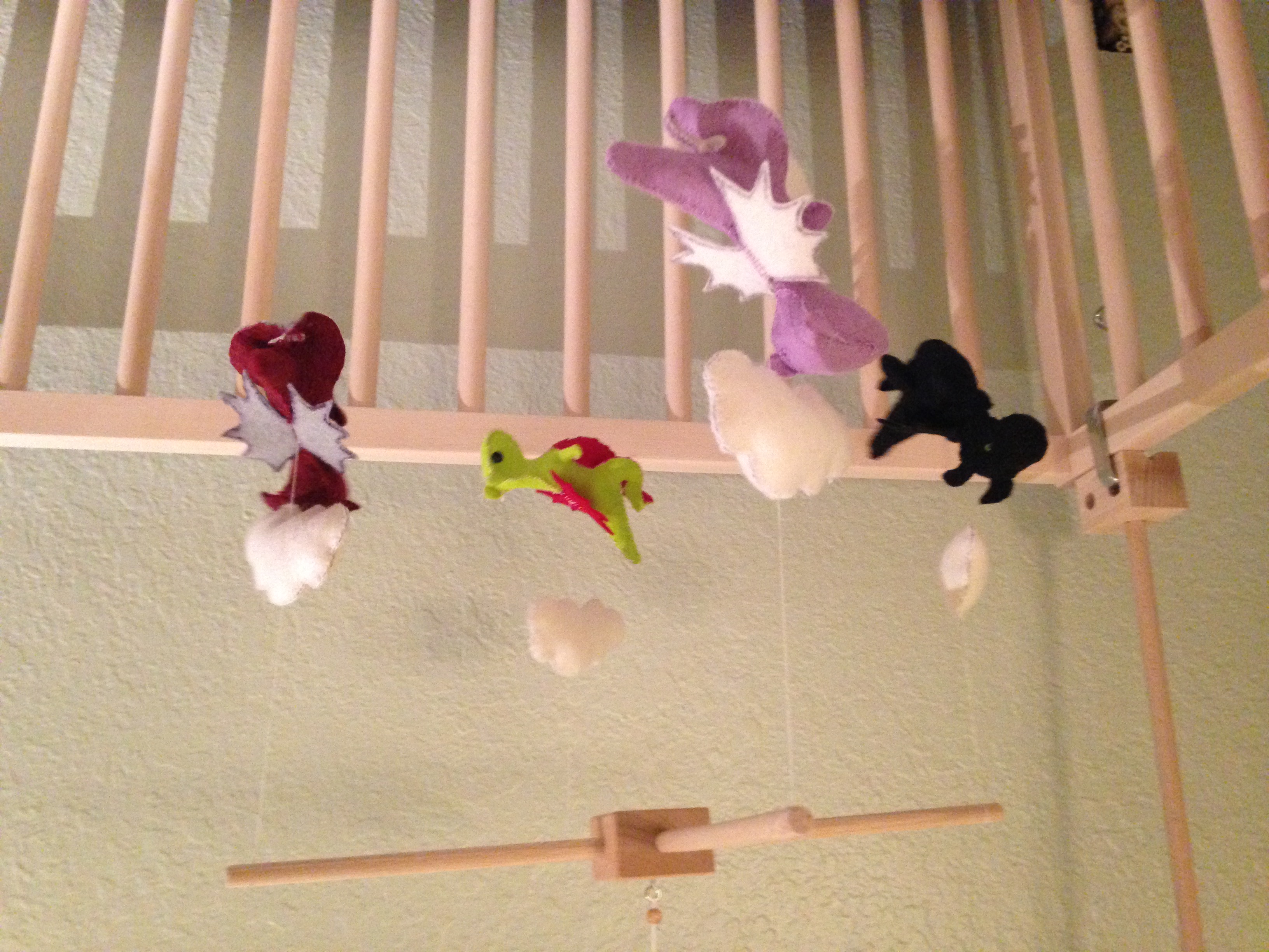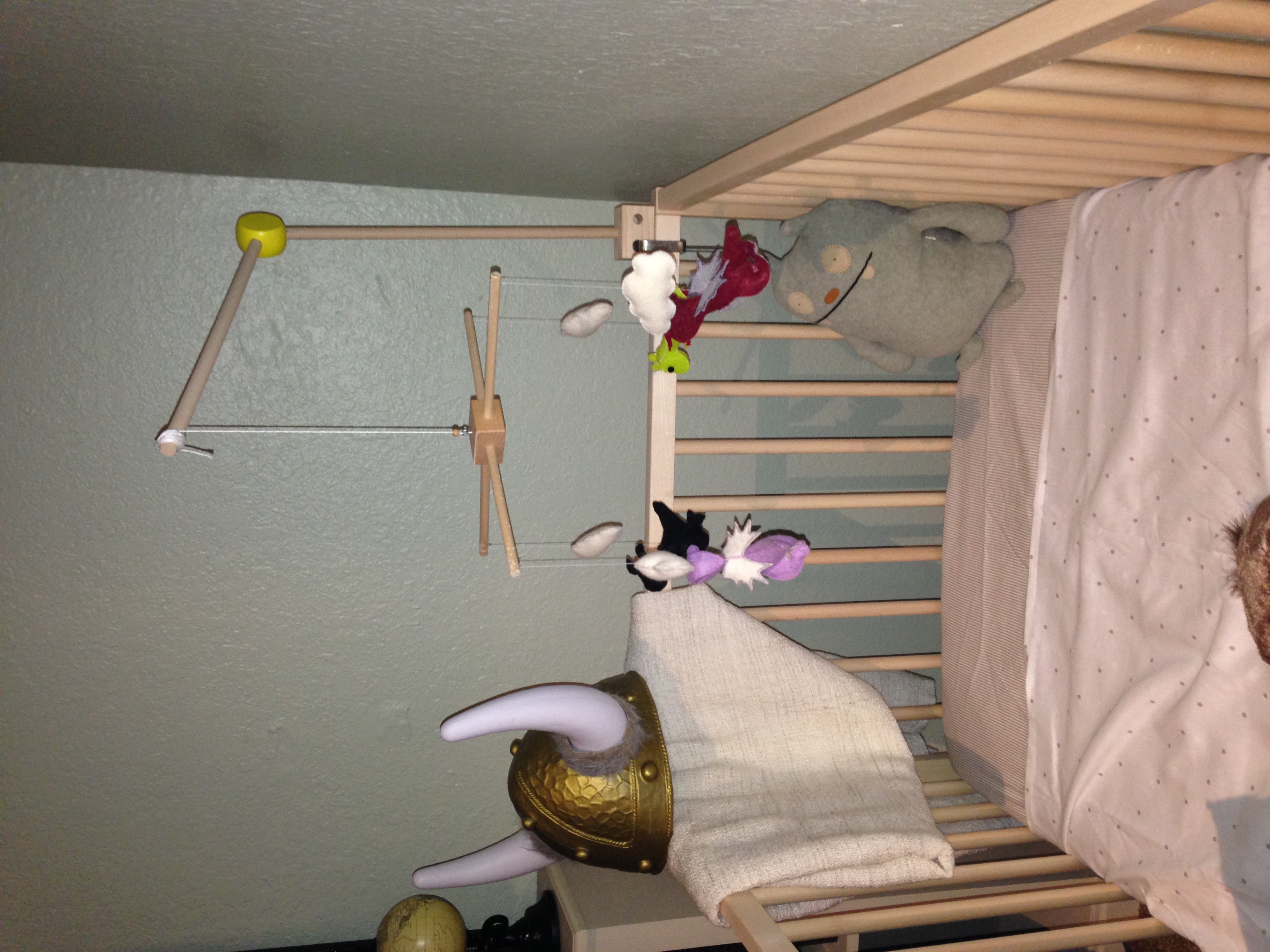 We moved in our new house about a month ago and painted the nursery livable green by sherwin Williams. Our theme is Scandinavian/Viking/dragons we started out gender neutral since we had a gender reveal party. But we knew we weren't going to have an incredibly girly room if it ended up being a girl. We got what we wished for and a boys room it is!!! I got the pattern for the mobile off of etsy (Tiny Luck) and made it myself. So it's not the greatest looking thing ever... But it's cute.lol