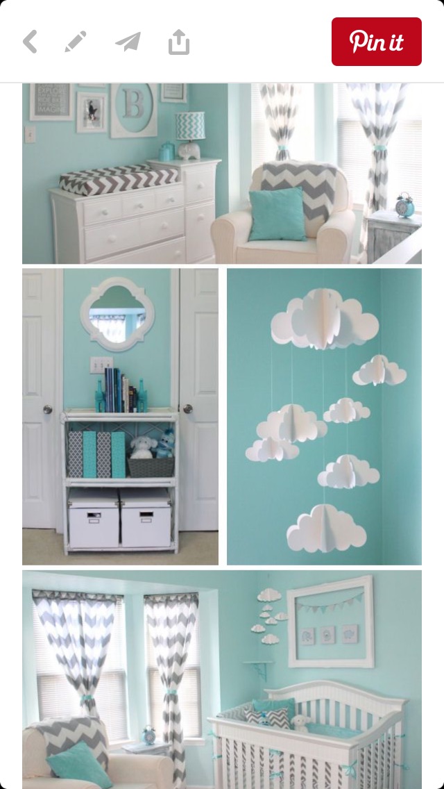 I am still in the process of moving DS to his "big boy room" so the nursery hasn't undergone any special transformation yet. The walls are aqua blue and instead of re-painting I have decided to do a Cinderella nursery. I found my inspiration on Pinterest. Just take away the clouds and add princess. Also going to do a canopy over the crib.
