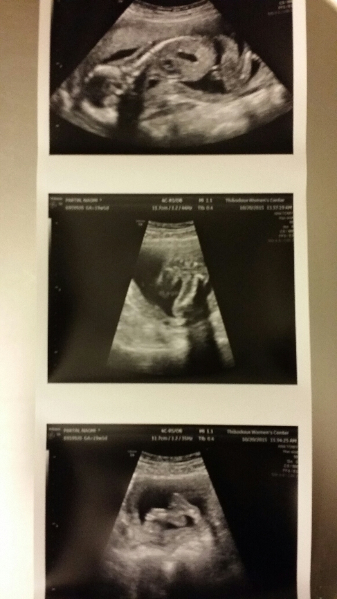 I have to go back 11/11 for a follow-up scan. Baby is transverse lying on its tummy, and the tech was not able to get a good profile pic. Plus she discovered I have a low-lying placenta, so we have to make sure that moves up. AND I didn't get to find out the sex either, because of baby laying the way he/she was. I'm hoping to find out this next ultrasound- fingers crossed baby uncrosses its legs!