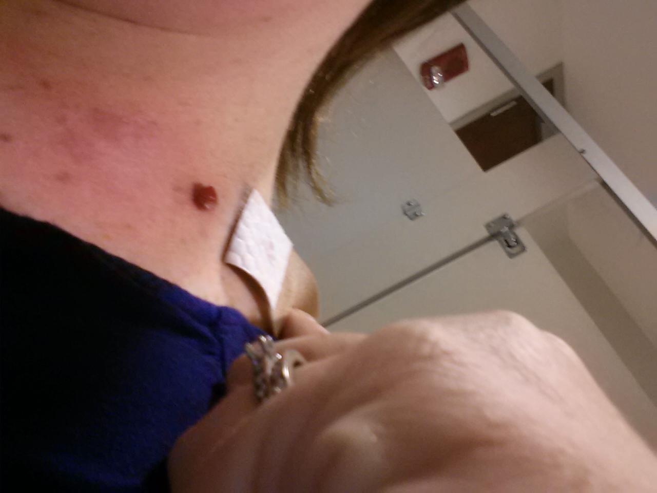 I made a derm appt for tomorrow for a growth on my neck. It started about 3 weeks ago, appearing like a skin tag. No biggie, I thought...it happens with the hormones. Well, it has continued to grow and bleed. I've been wearing a band-aid to cover it because it's a little unsightly. Today, the top came off and it bled through the band-aid and onto my shirt!! It's covered again now and stings because it's raw. The skin around it is irritated also from the adhesive. Hoping its nothing serious, but having a hard time not thinking worse case scenario!