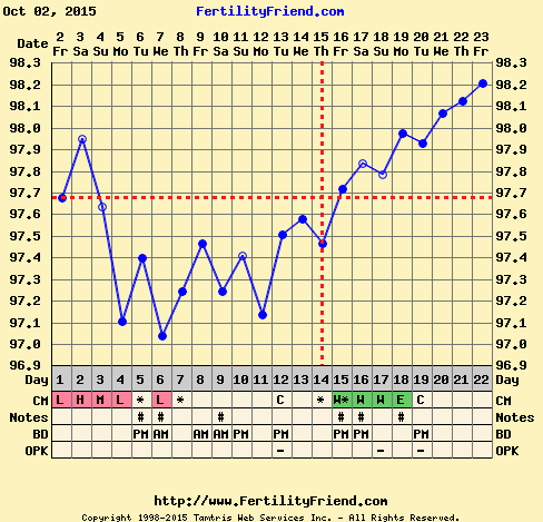 Rant/Rave/Chart Stalk: This is my first official TWW with temping & actually TTC. My H & I have been together a long time and we've pretty much always been NTNP, so this is exciting. I was worried that FF wouldn't work out for me since I am a total mouth breather but I've gotten the hang of it now and it's not bad at all. Now for fun sex and de-stressing about O'ing.