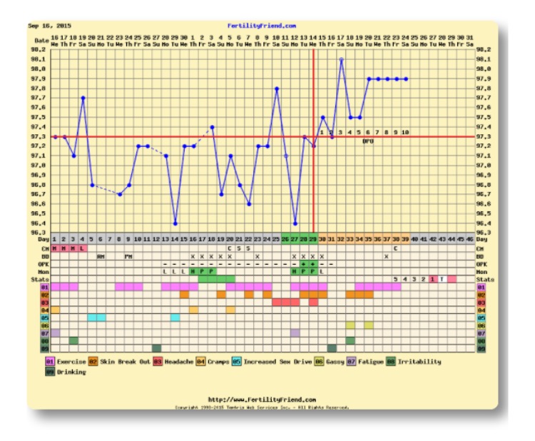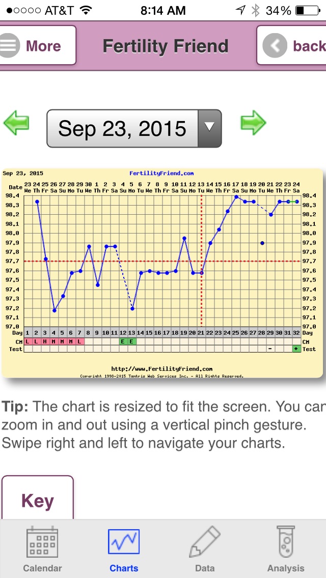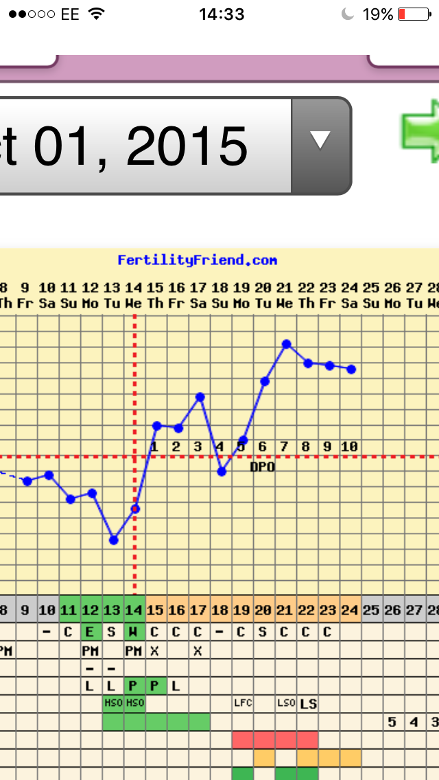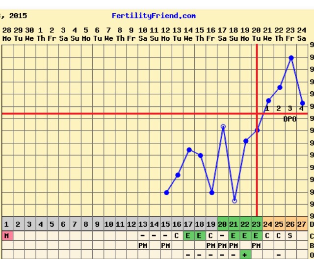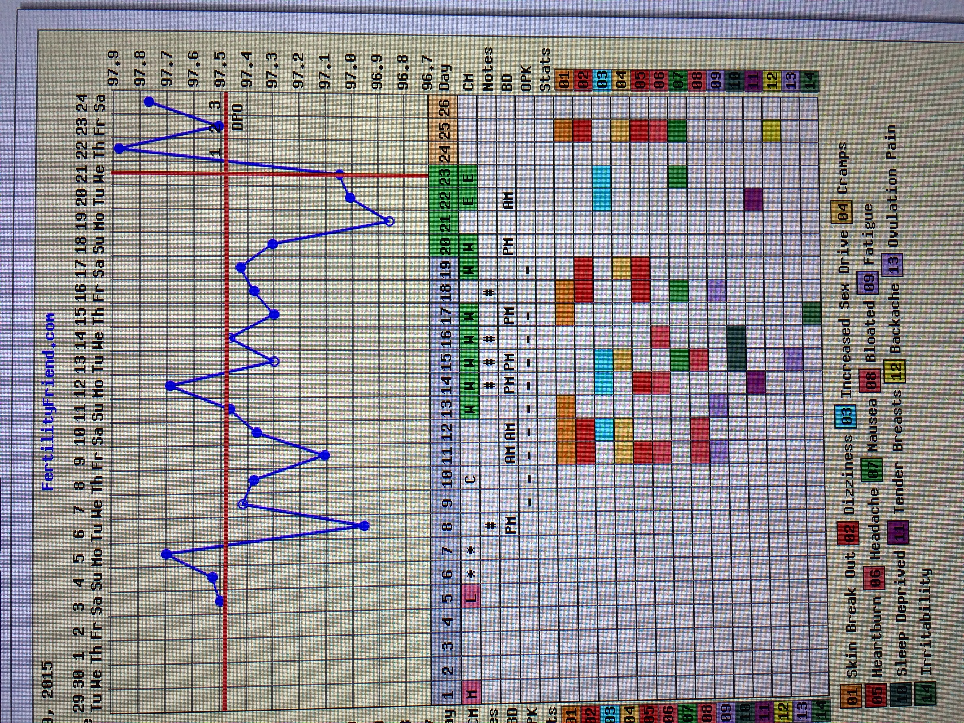 Rant/Rave/Chart Stalk: This is the longest cycle since April. I have had no PMS symptoms at all which is so strange. I had strange nausea this morning that I thought would lead to cramps but never did. I am breaking out a ton though so not sure what that is, could just be the dry weather. I also have had a ton of CM the last few days, it's pretty runny too which is strange. I am pretty sure I am out this cycle and I am regretting taking a break from temping. I just want to be able to start temping again so hope this cycle sorts itself out. Very glad I get to be referred to a specialist soon... just waiting for DH SA results this week.