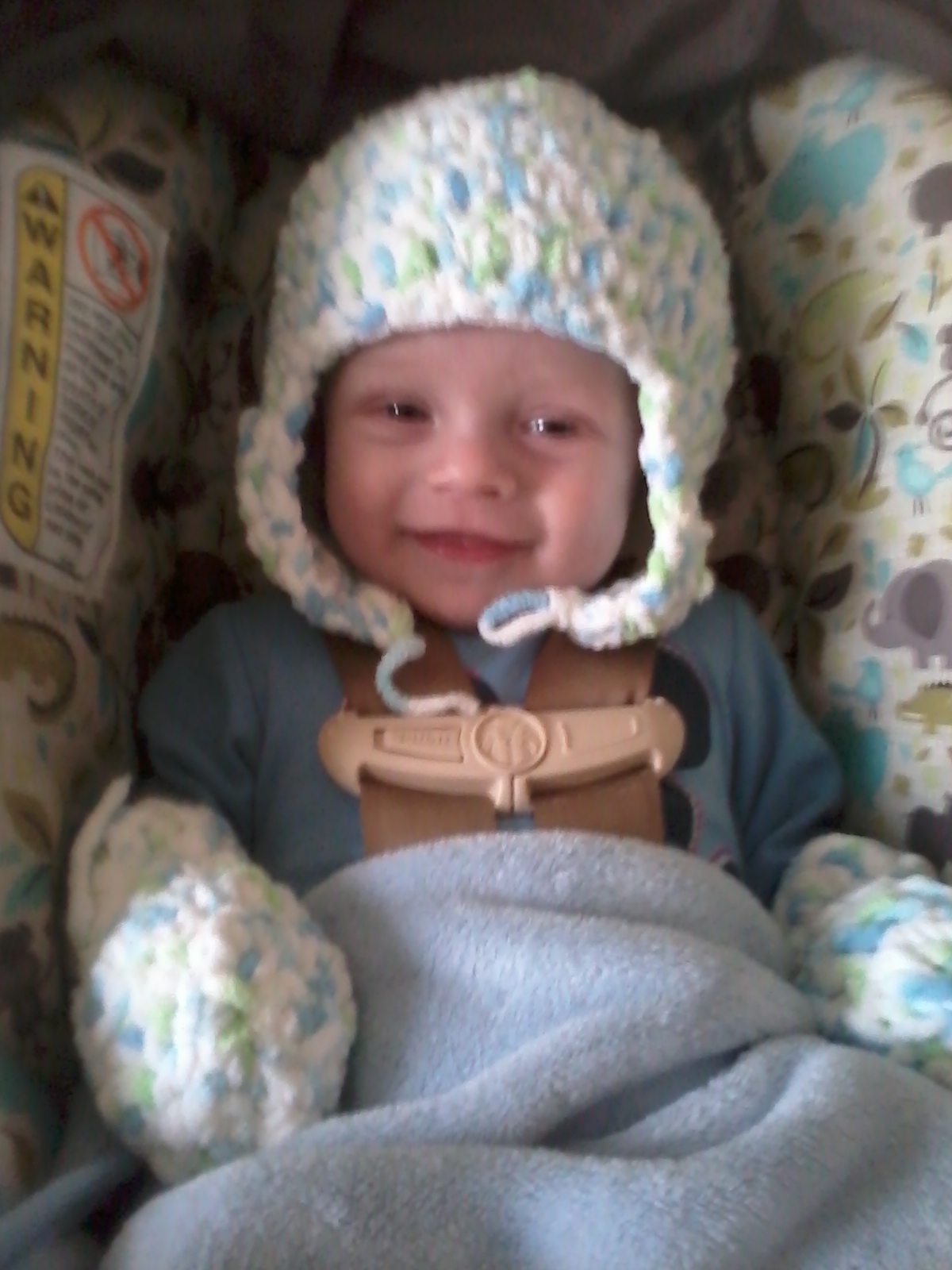 • Blanket for baby A, still working on blanket for baby b, the third pic was ds with the hat and mittens i made him for his first winter. i will get the pic of the matching booties posted soon.