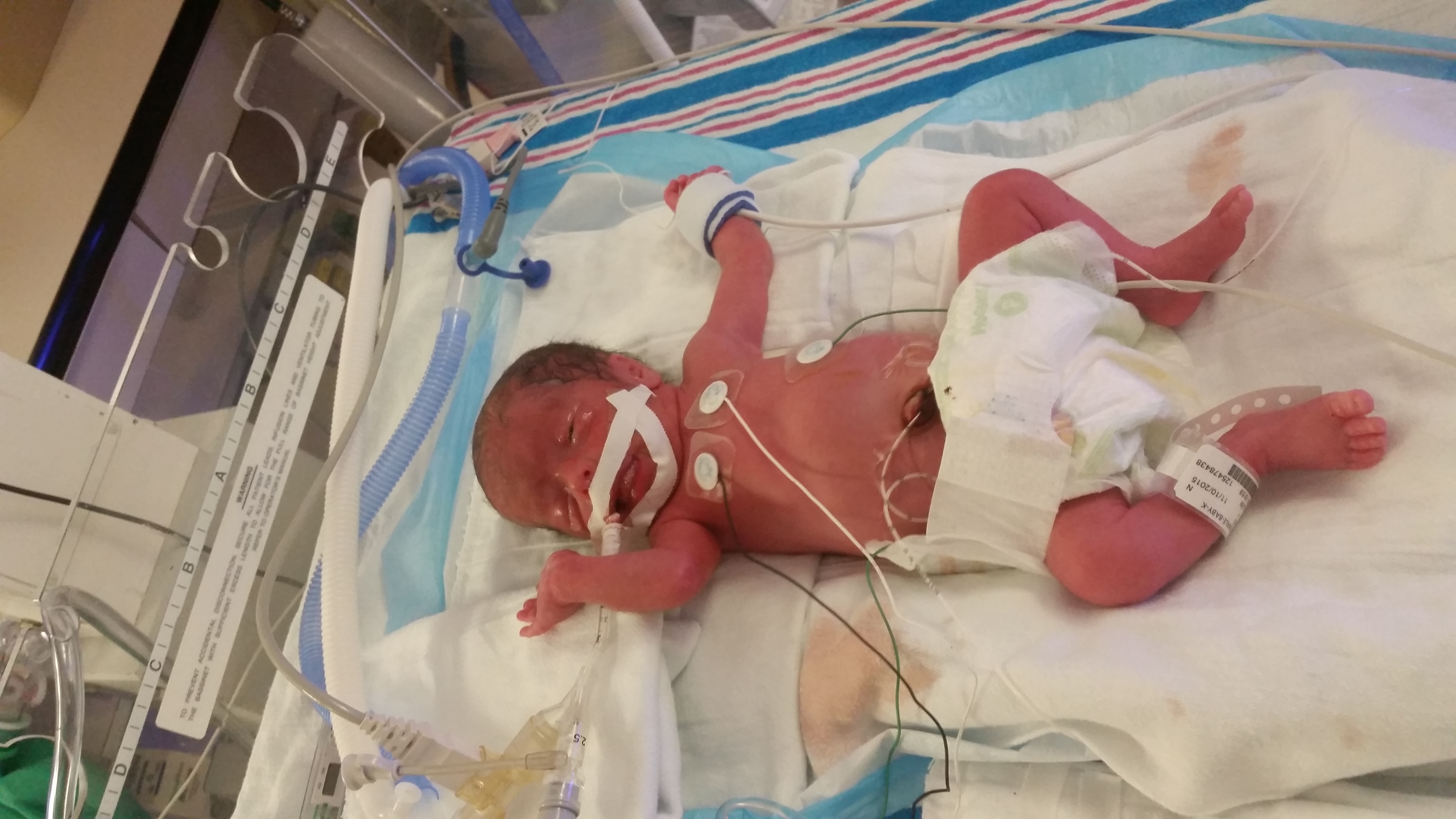 I went to my OB appointment on 10/9 and told her about the swelling edema and headaches I had been having she took me out of work and sent me to L&D to be observed for 24 hours n do urine collection during that time as she suspected pre eclamsia. Was a very uneventful night until 2:30 AM when Twin A broke her sac!!! Next thing I knew I was getting shots on a helicopter which had to Land half way to the hospital I was being sent to due to fog and took an ambulance the rest of the way. After many shots n everything they could not stop my labor. I had my twin girls on 11-10-15. Madalyn Rose was born at 5:54 PM. She weighed 2.4 pounds n was 14 inches long and Jacalyn Dana was born at 5:58 PM AND weighed 2.14 and was 14 inches long as well. Both had their breathing tubes removed today and are on cpap nasal cannula. They r my whole world. Madalyn is the one wearing the hat.