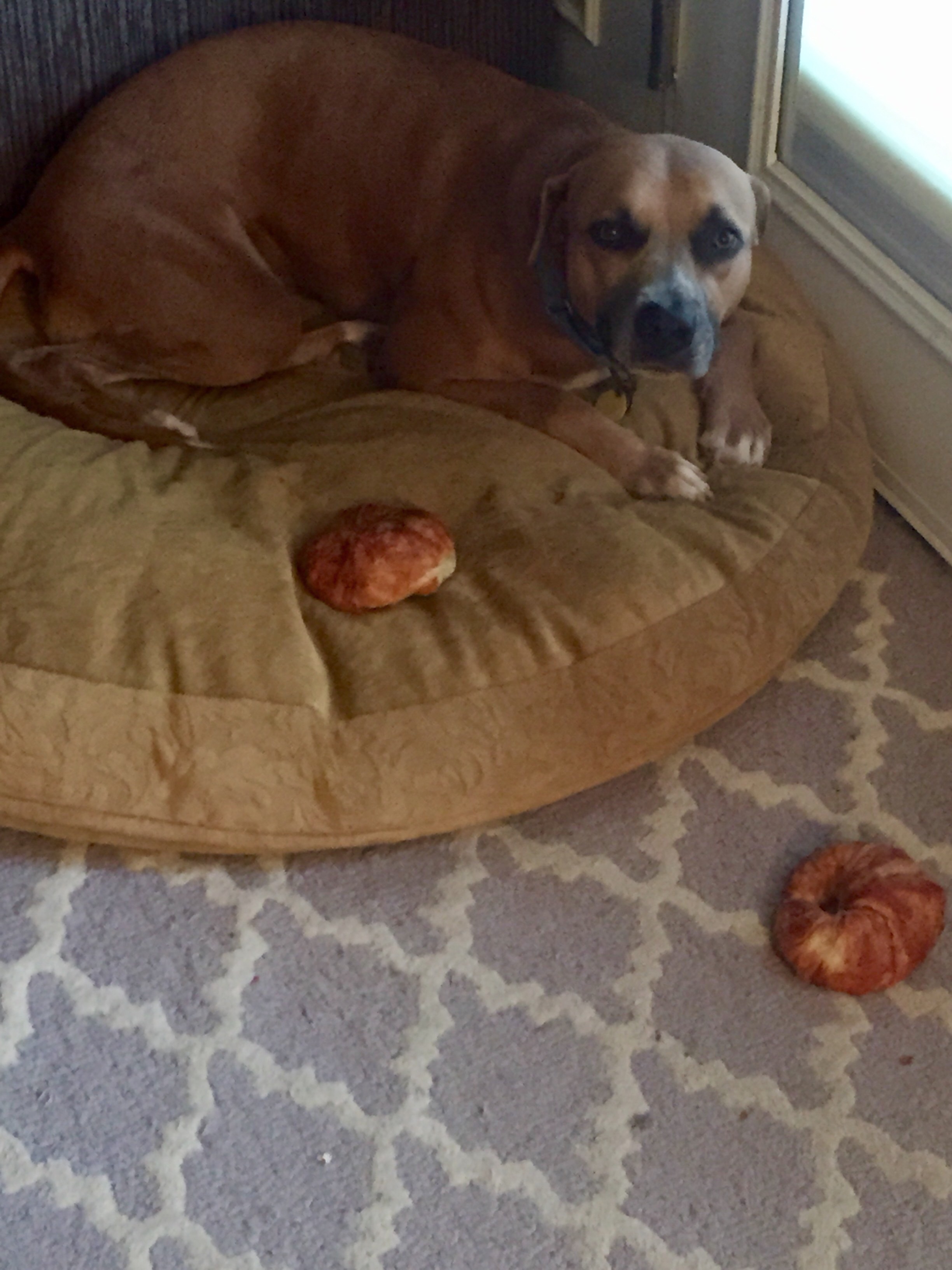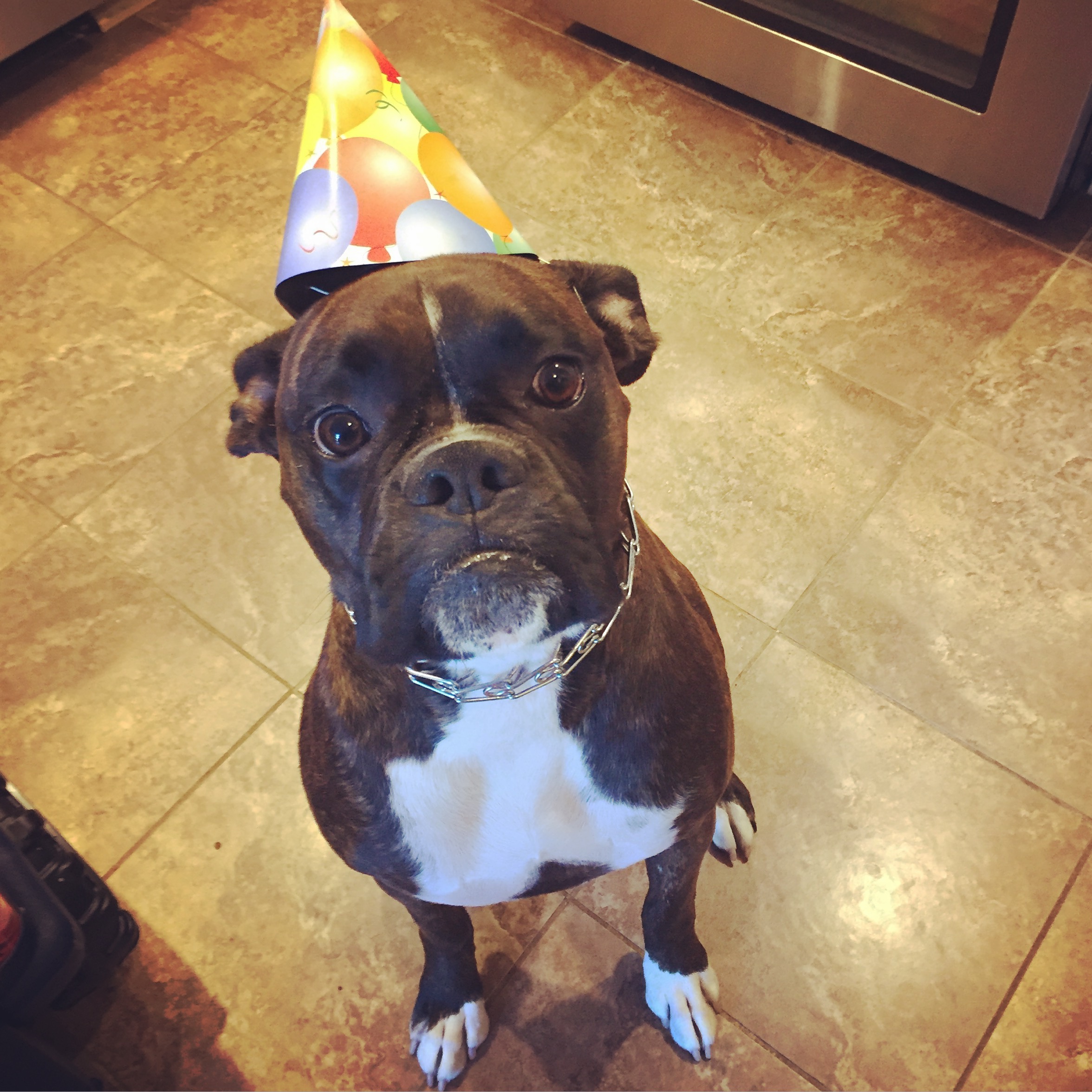 I have a 3 year old boxer mix named Stella. She is featured in my profile picture. She is such a sweet dog and she is so gentle with DS. This is from her birthday celebration in September.