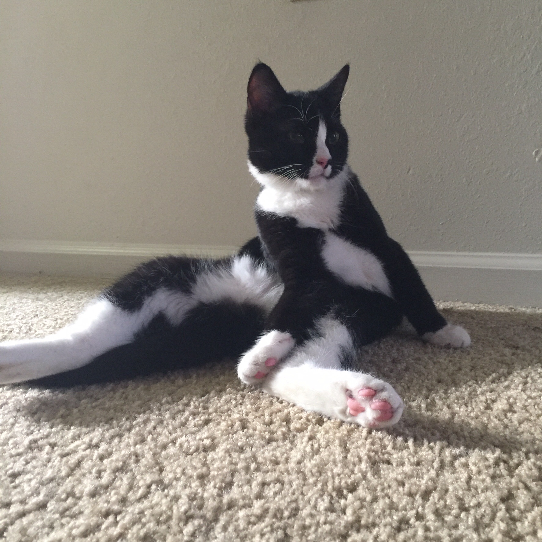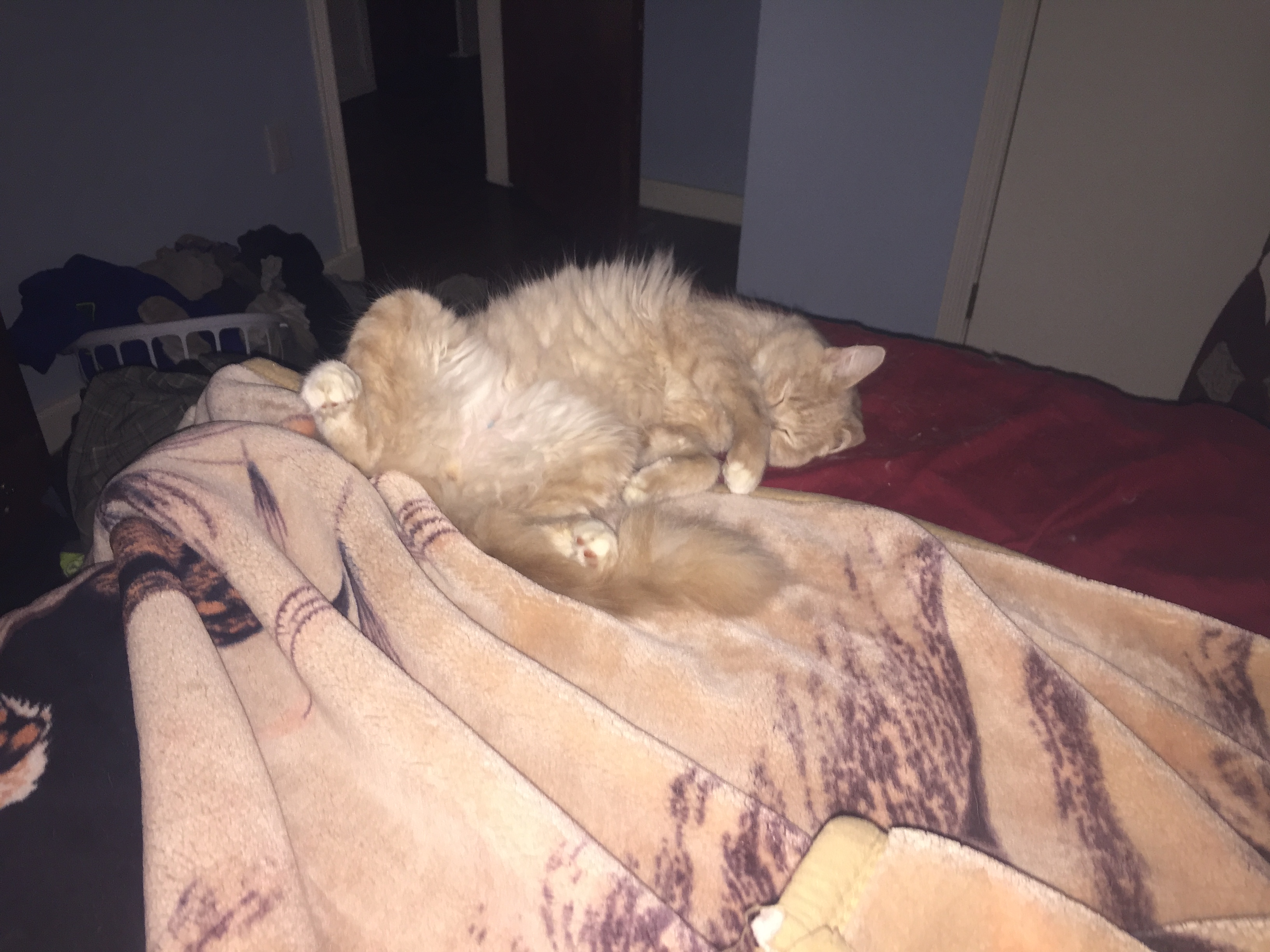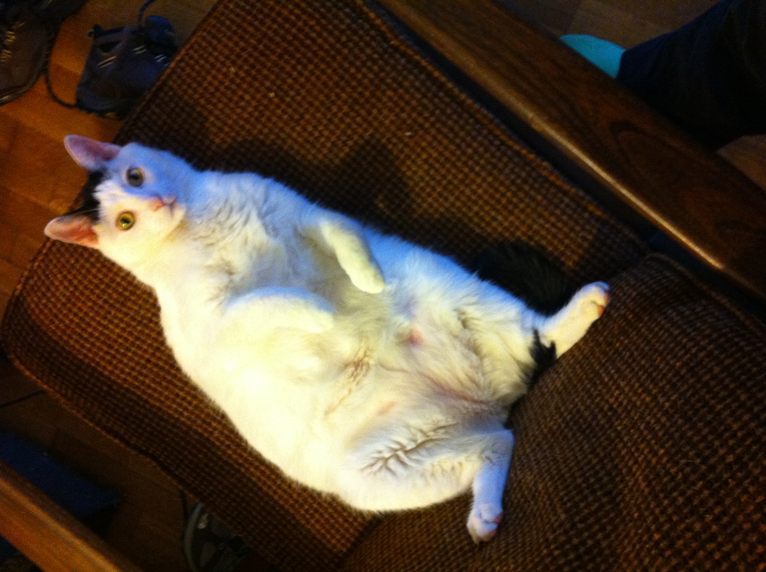 We have a very fat house cat named Catsby (aka "the Great Catsby"). He sleeps on my husband's side of the bed and insists that husband cuddle him like a teddy bear, pretty much all night. It's ridiculous.