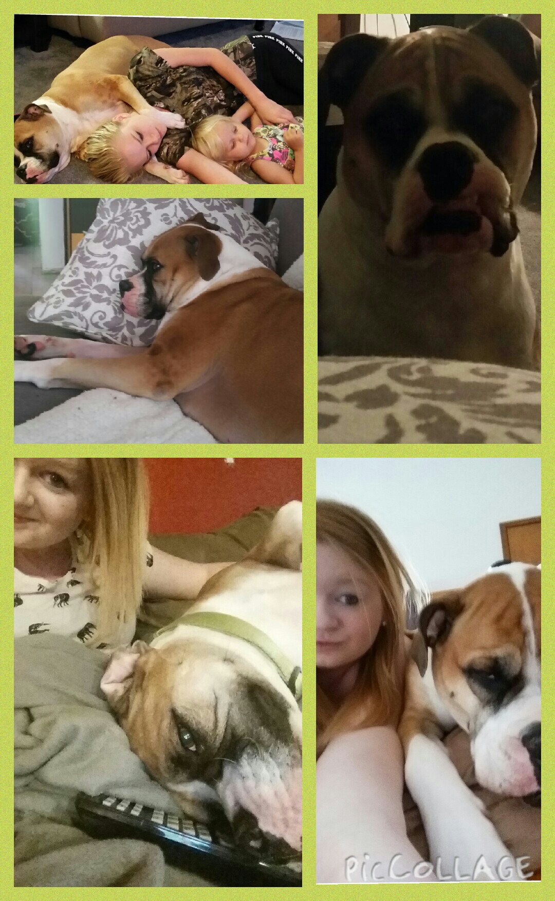 • Hank is an Olde English/ American Bulldog mix. My fiance and I got him when he was about a year and a half old when we first moved in together. He's five now. He's spoiled rotten and my big baby. He's going to be so jealous when the baby gets here. I'm super worried about the adjustment for him.