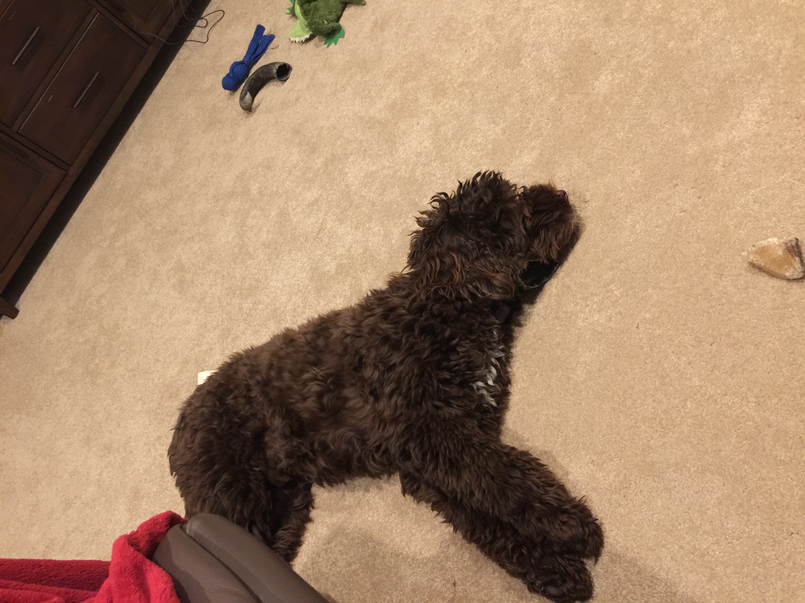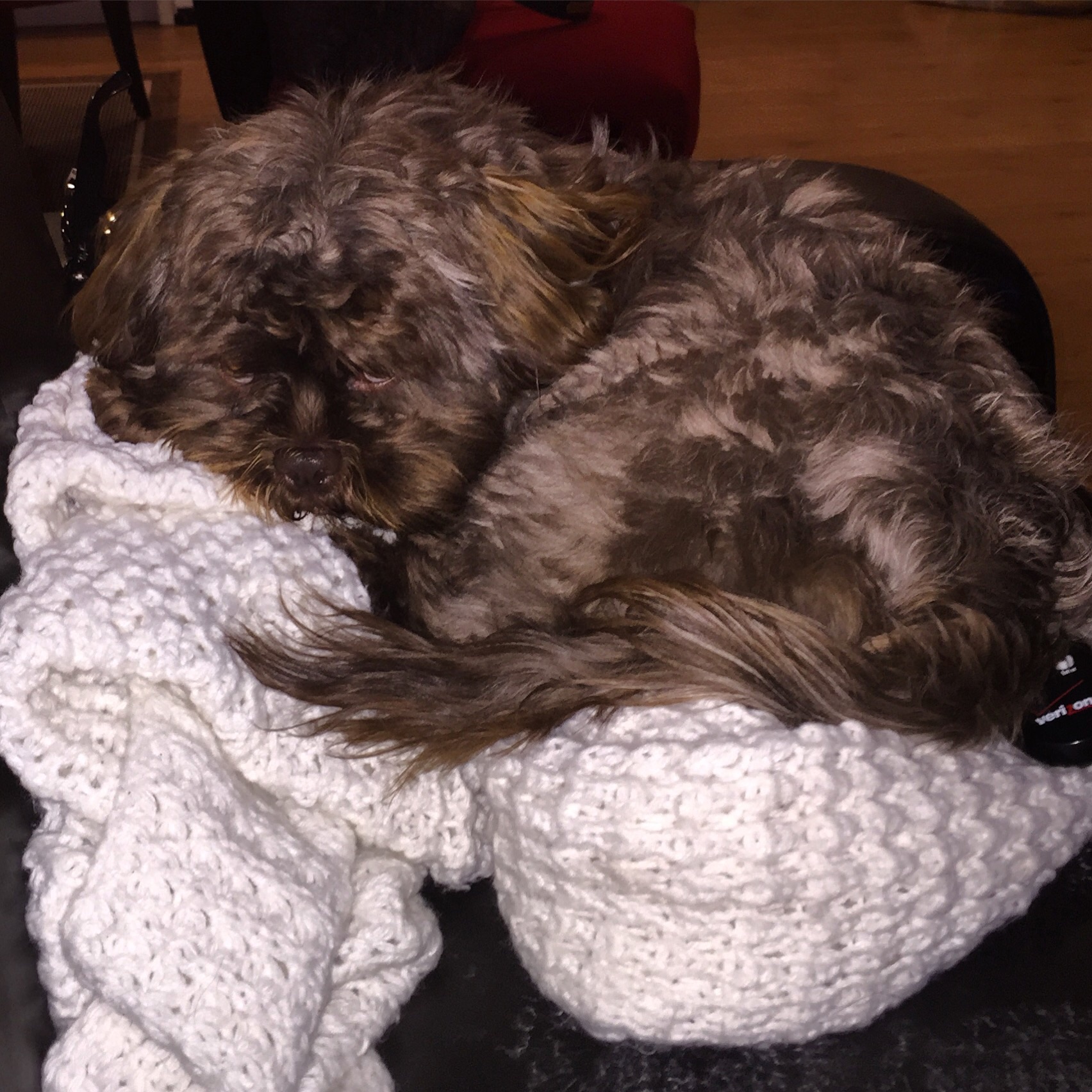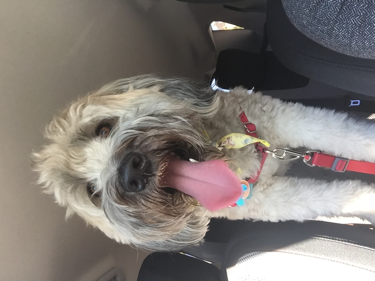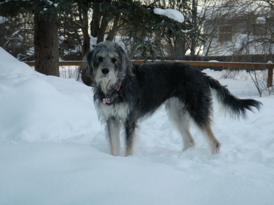 She looks like a schnauzer when she has her haircut but this is her with her long hair. Her mom was a golden doodle and her dad was a roaming neighborhood malamute so she is a mutt. Because of the poodle in her, her hair grows and grows.