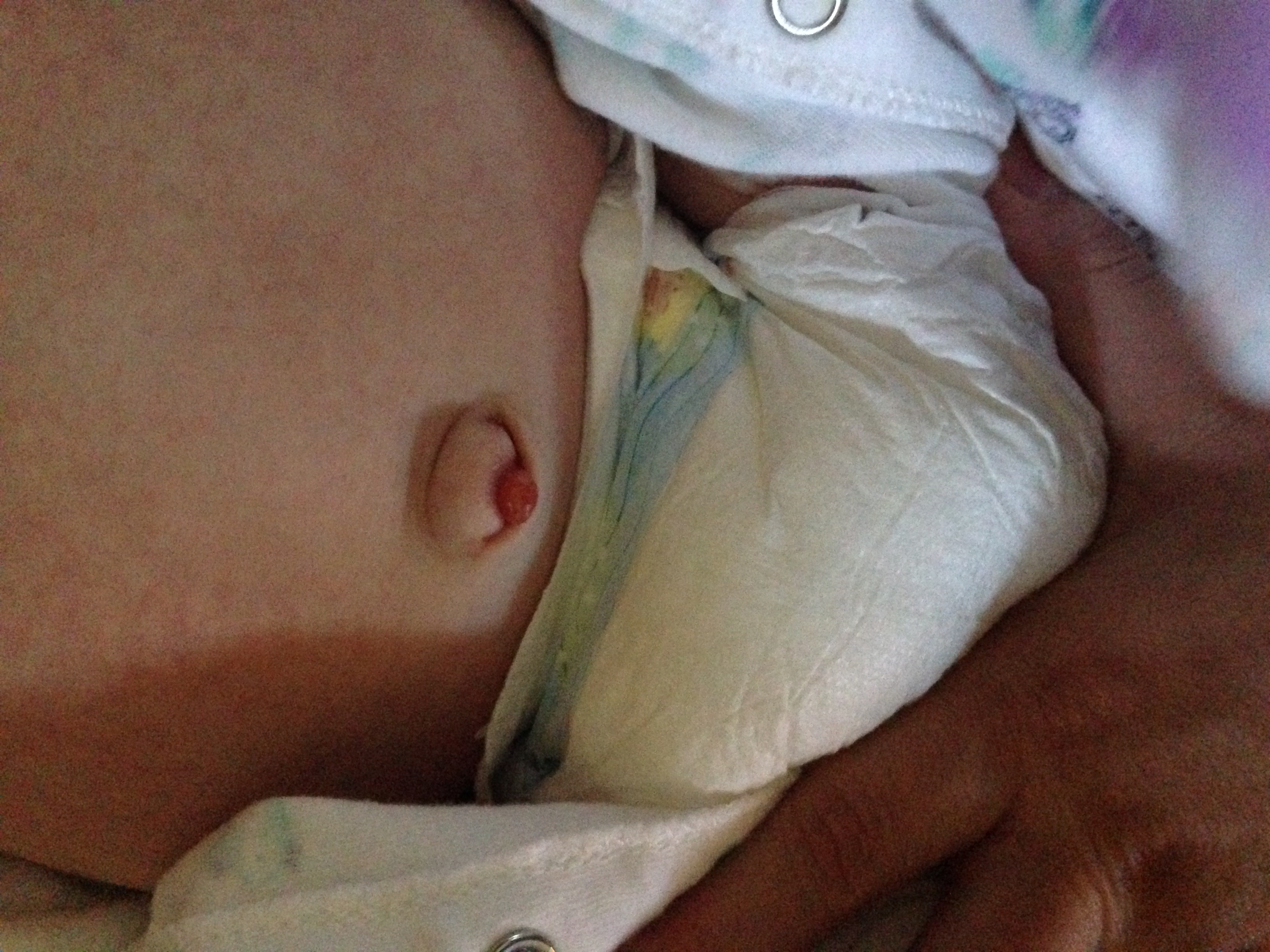 Mine has an umbilical hernia but it's not bright red like yours. It's just a bump that's flesh colored and soft. It gets bigger when he's bearing down or fussing. But can be touched softly and it's suddenly flat to his tummy. Not sure about the bright red spot in the pic.