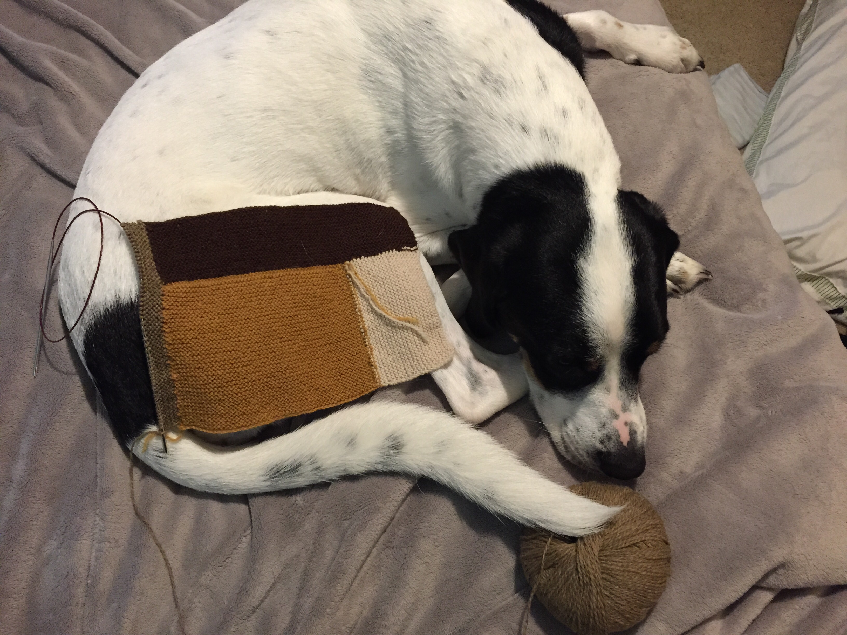 • 1.What did you work on last week? Bonus points for pictures Worked on DD2's blanket. Three rectangles down, a lot to go. I really like how it's coming out except that I'll have one visible join line on the front. I wasn't paying attention when I started the third color and I really don't want to rip the whole thing out so it will just bug me forever...unless I should rip it all out? 2. What are you planning to work on this week? Baby blanket. I'll help DH with refinishing a dresser for the nursery if he lets me. 3. How did you learn your craft/hobby? I've taught myself everything just from books and online tutorials 4. Where do you find tutorials/patterns/inspiration? Pinterest, knitpicks, purl soho, sprite stitch when I'm doing geeky projects, etsy, my brain Sleepy dog included for scale